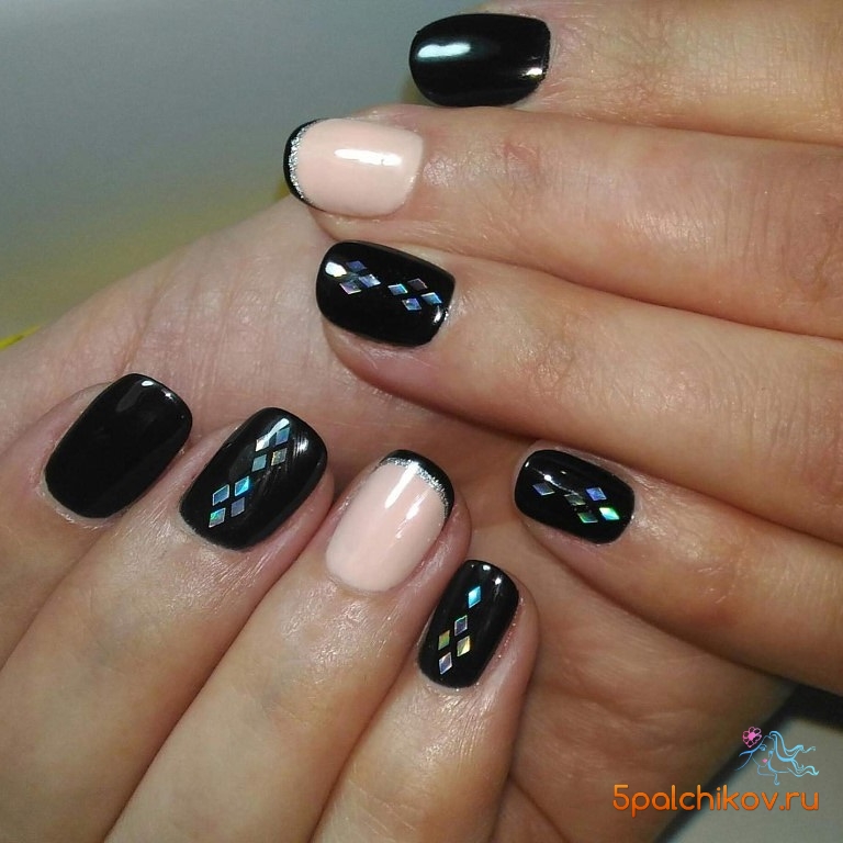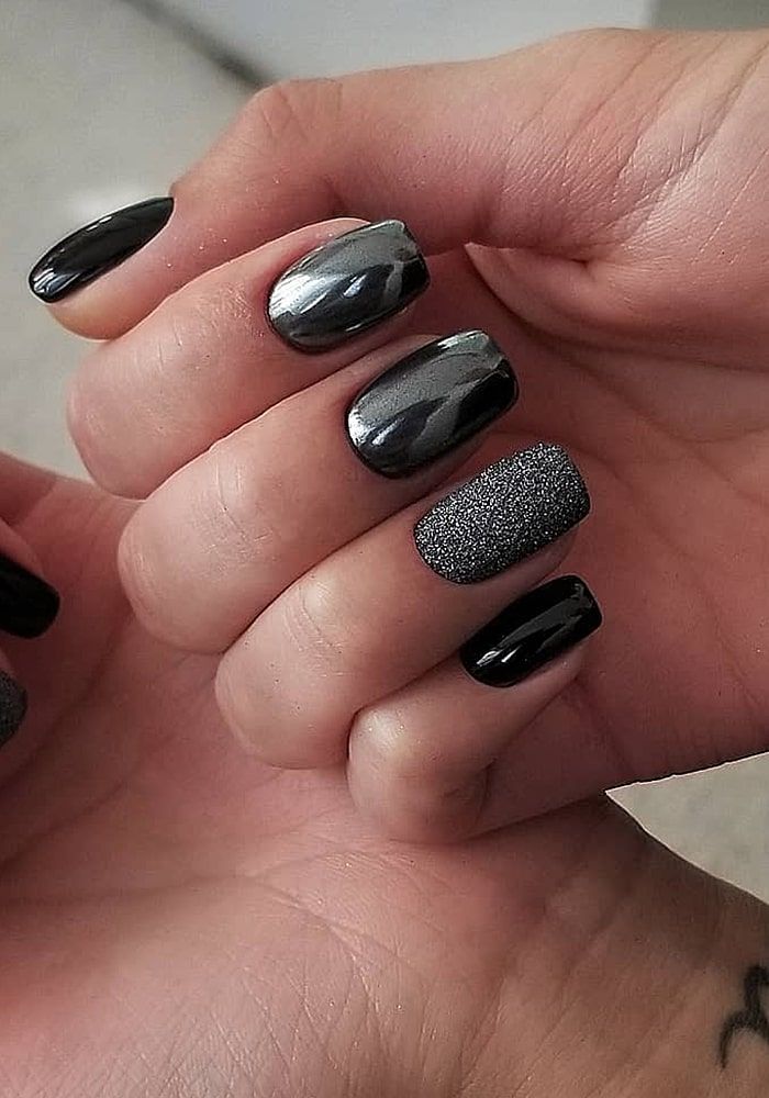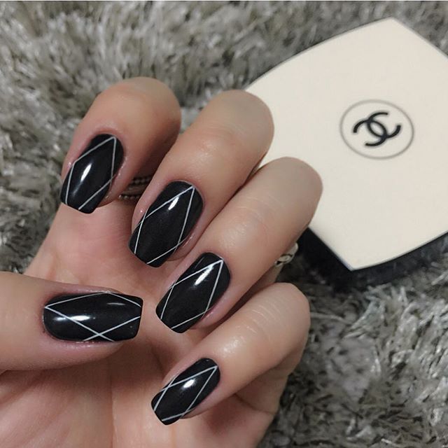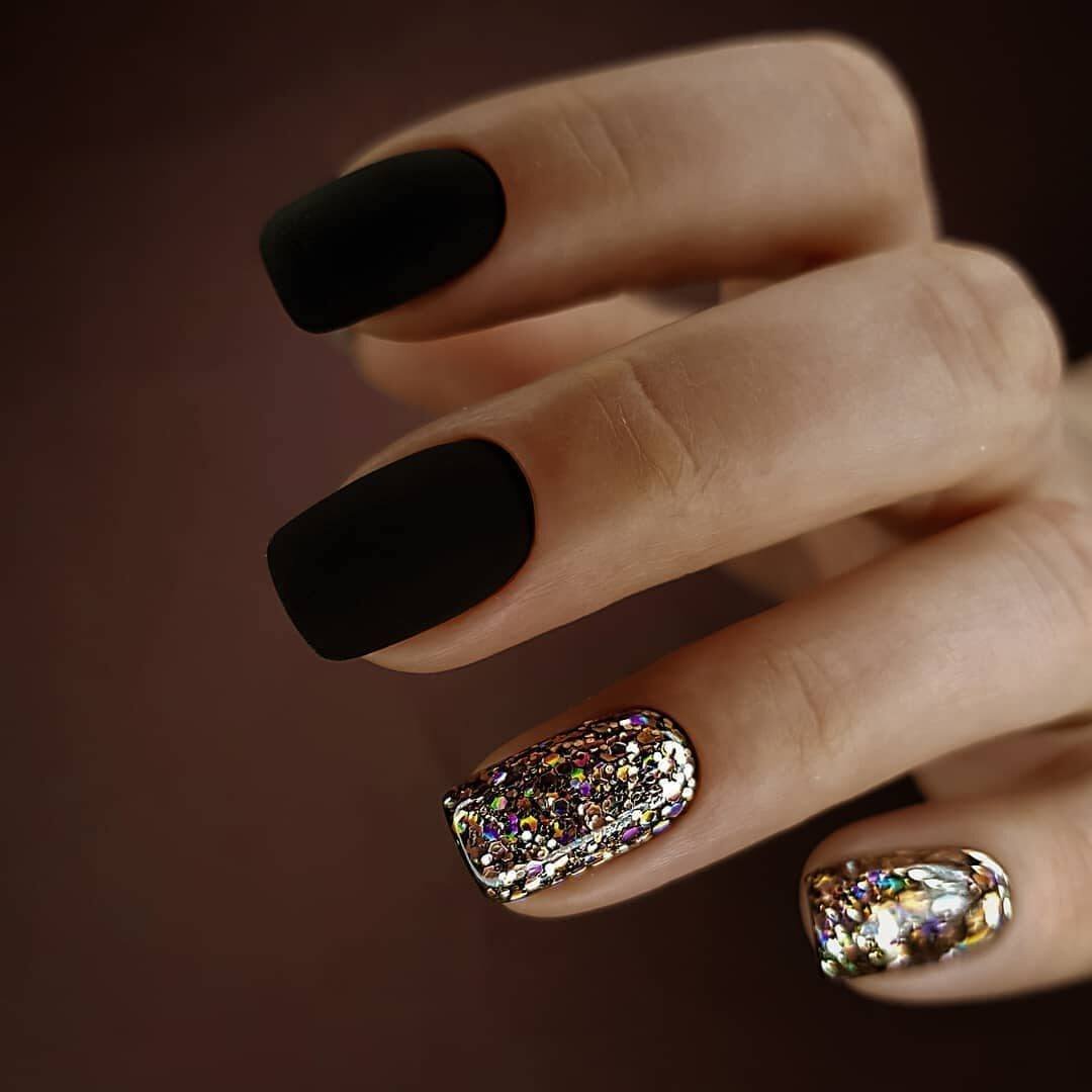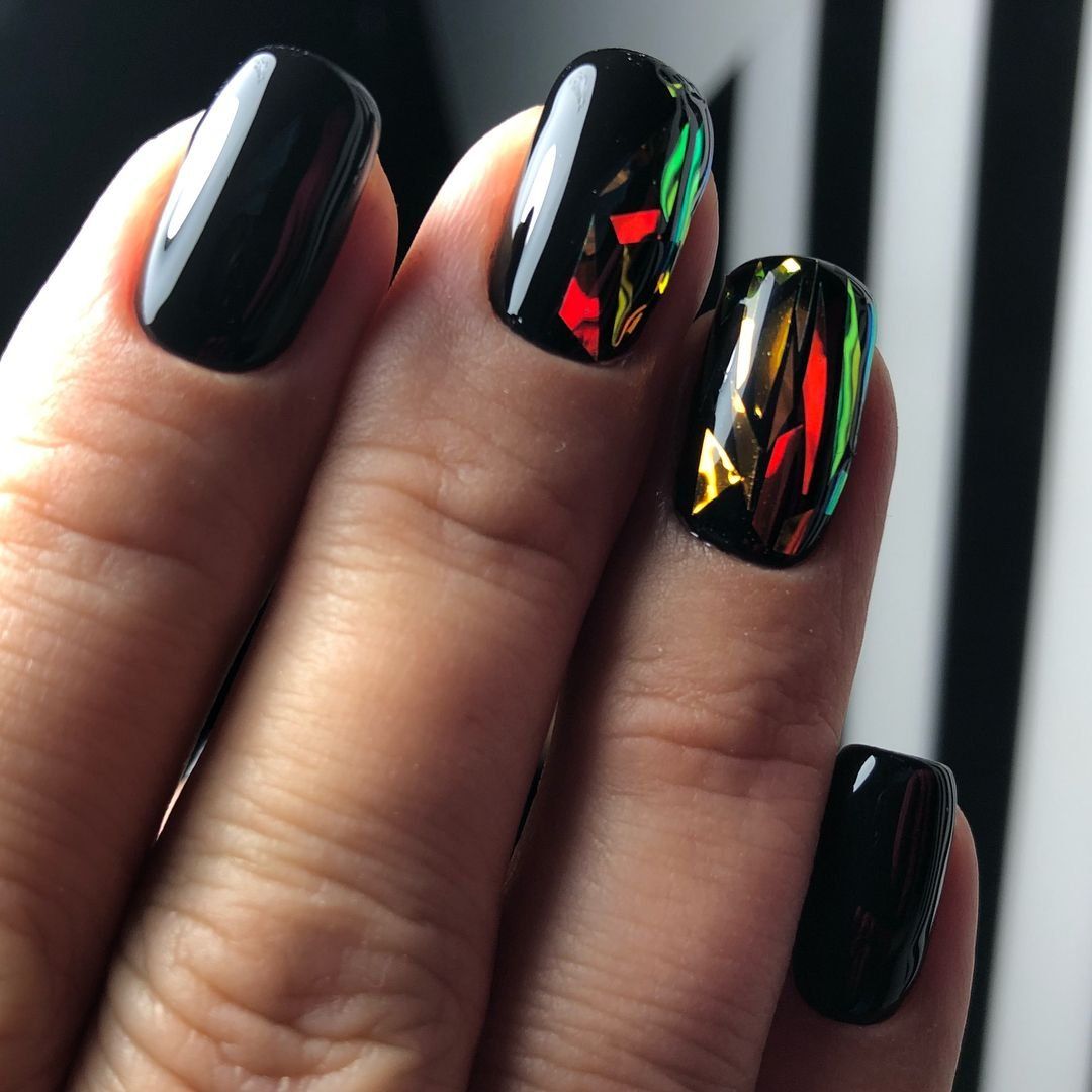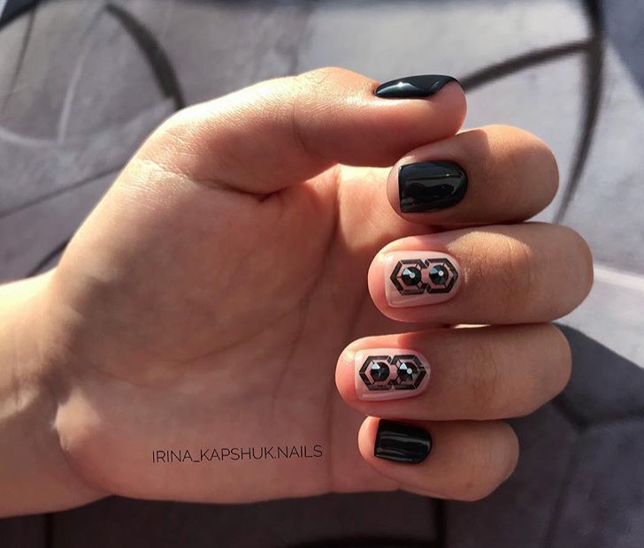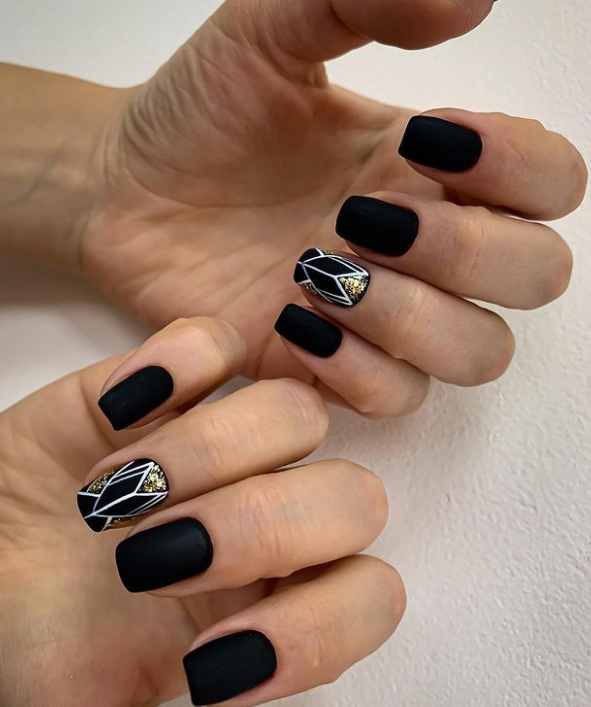 Самый простой вариант сделать черный маникюр более выразительным — геометрический рисунок. Как правило, в таком дизайне сочетают 2-3 цвета. Это может быть белый, черный и золотой или серебристый. Часть блоков лучше покрыть блестками, чтобы добавить немного яркости. Для разделителей можно использовать фольгированные полоски с клеевой основой.