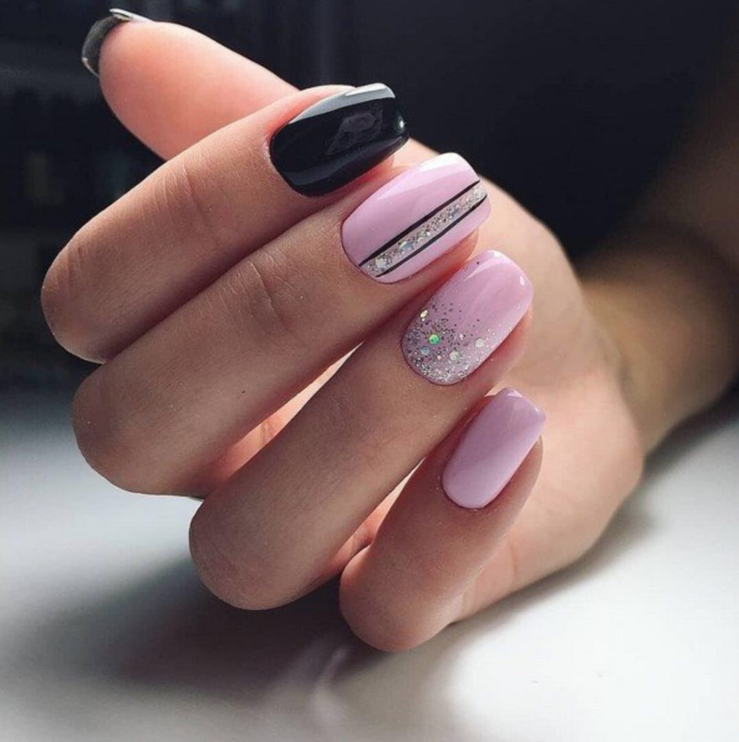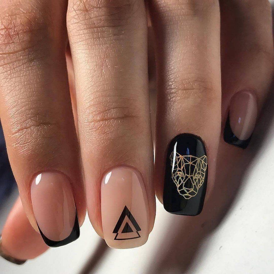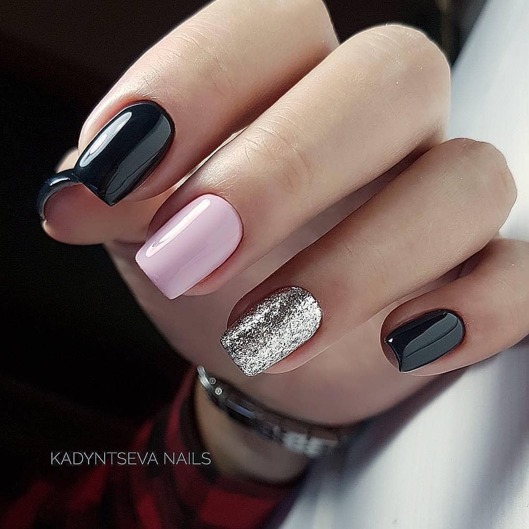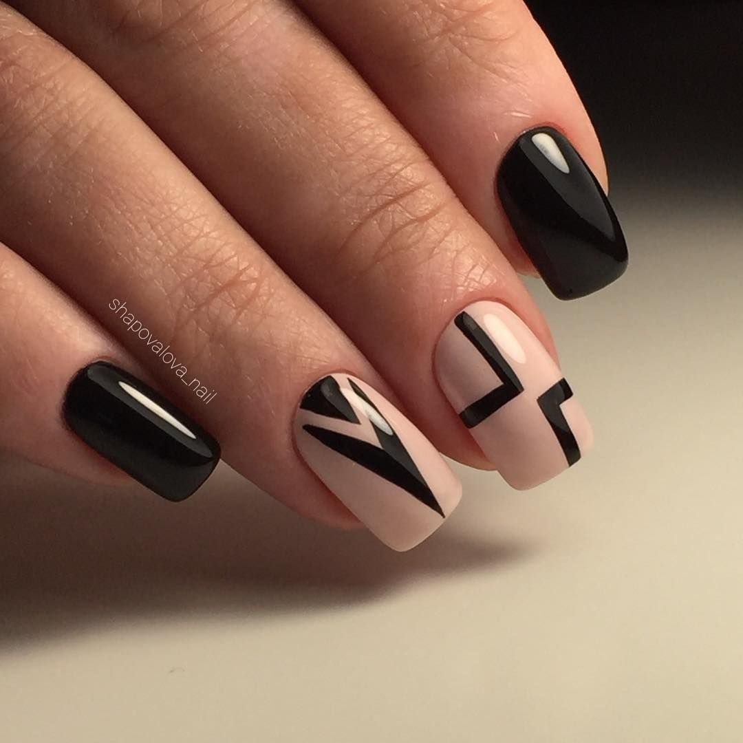 Самый простой вариант сделать черный маникюр более выразительным — геометрический рисунок. Как правило, в таком дизайне сочетают 2-3 цвета. Это может быть белый, черный и золотой или серебристый. Часть блоков лучше покрыть блестками, чтобы добавить немного яркости. Для разделителей можно использовать фольгированные полоски с клеевой основой.