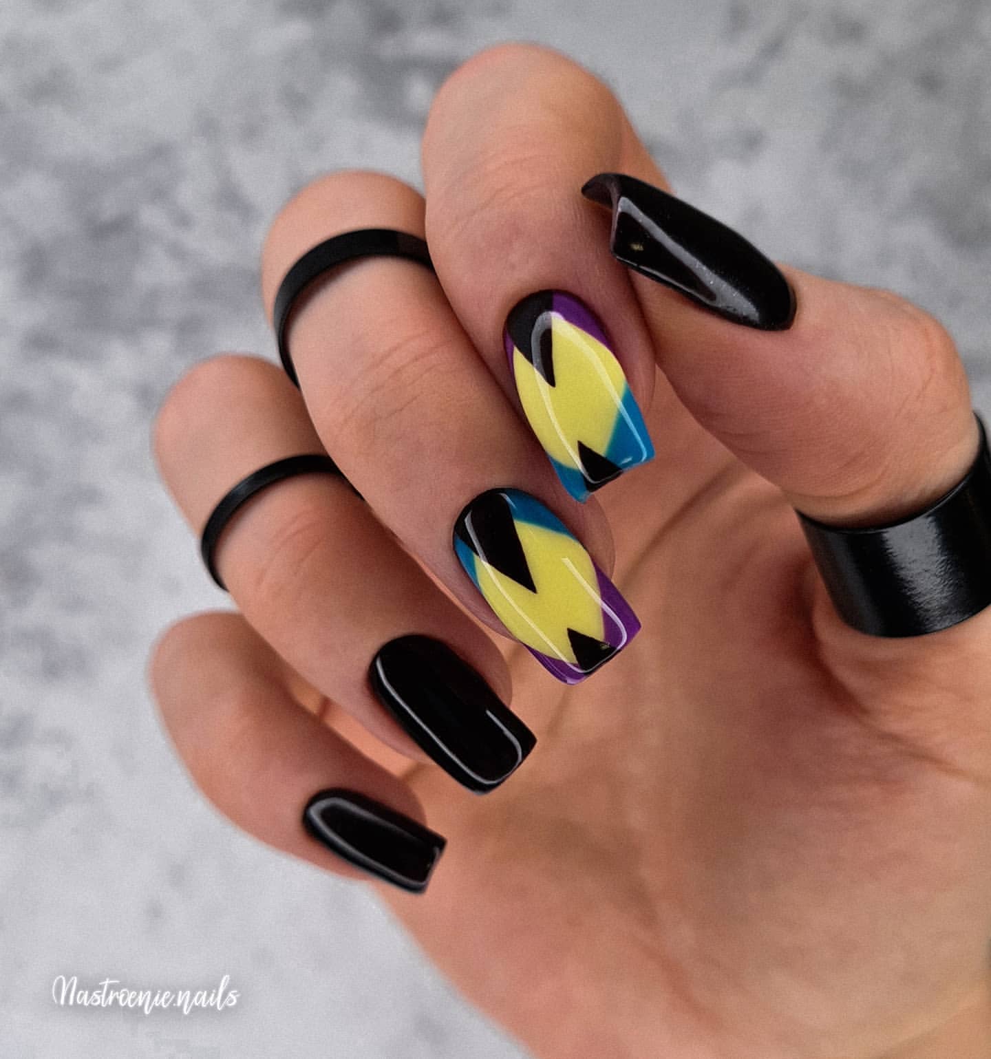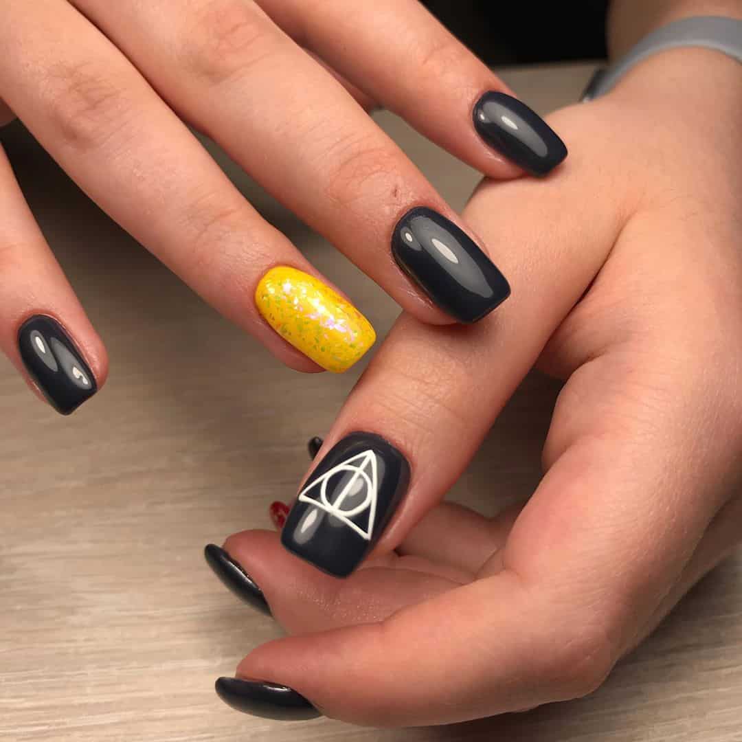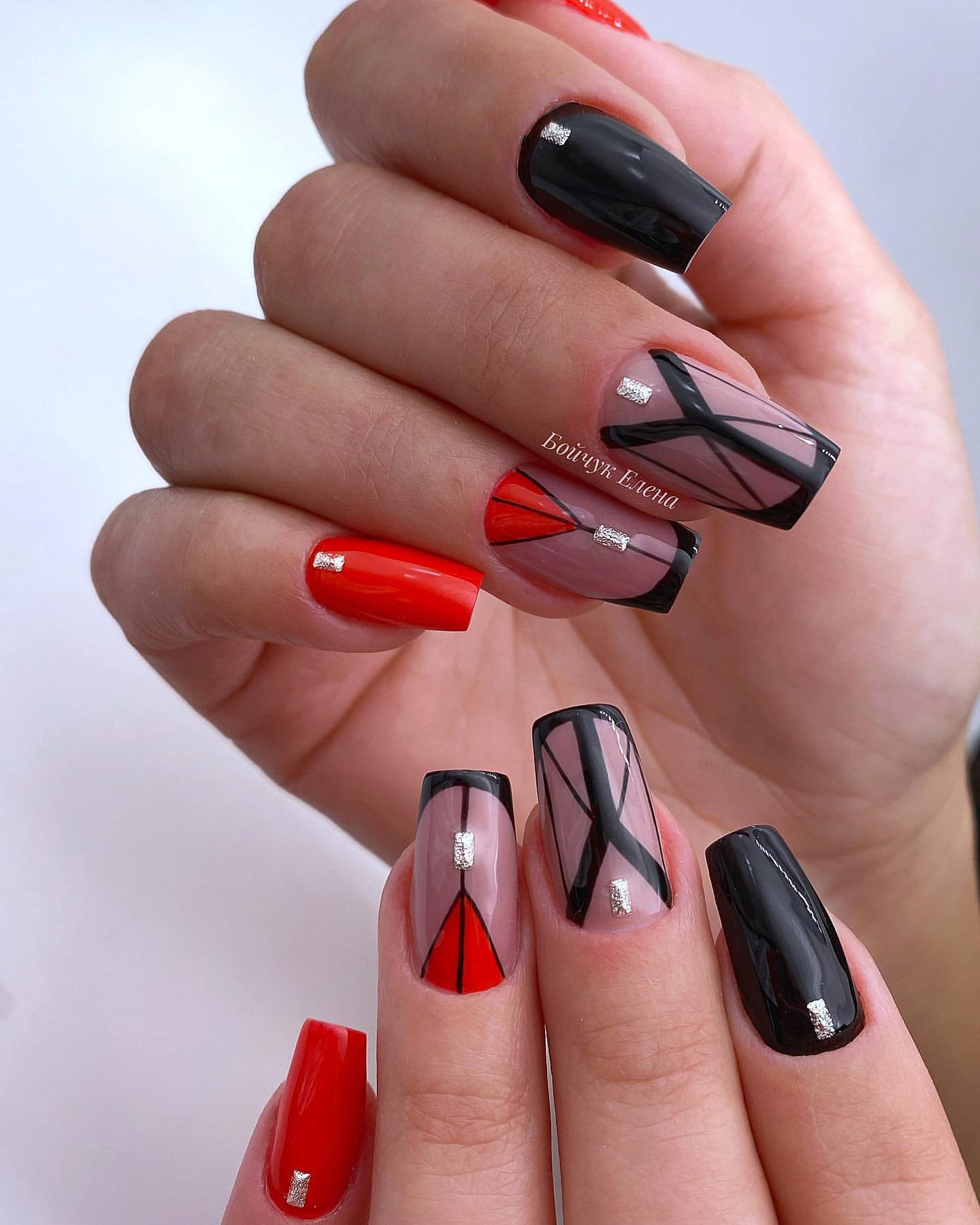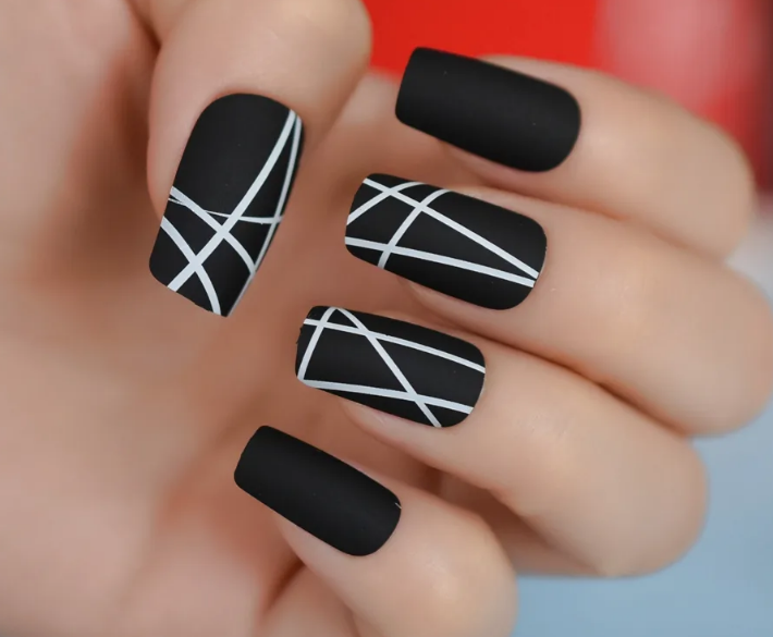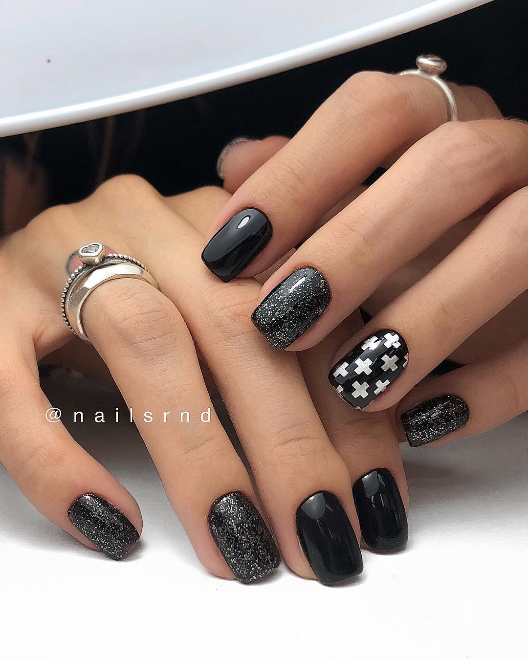 Самый простой вариант сделать черный маникюр более выразительным — геометрический рисунок. Как правило, в таком дизайне сочетают 2-3 цвета. Это может быть белый, черный и золотой или серебристый. Часть блоков лучше покрыть блестками, чтобы добавить немного яркости. Для разделителей можно использовать фольгированные полоски с клеевой основой.
