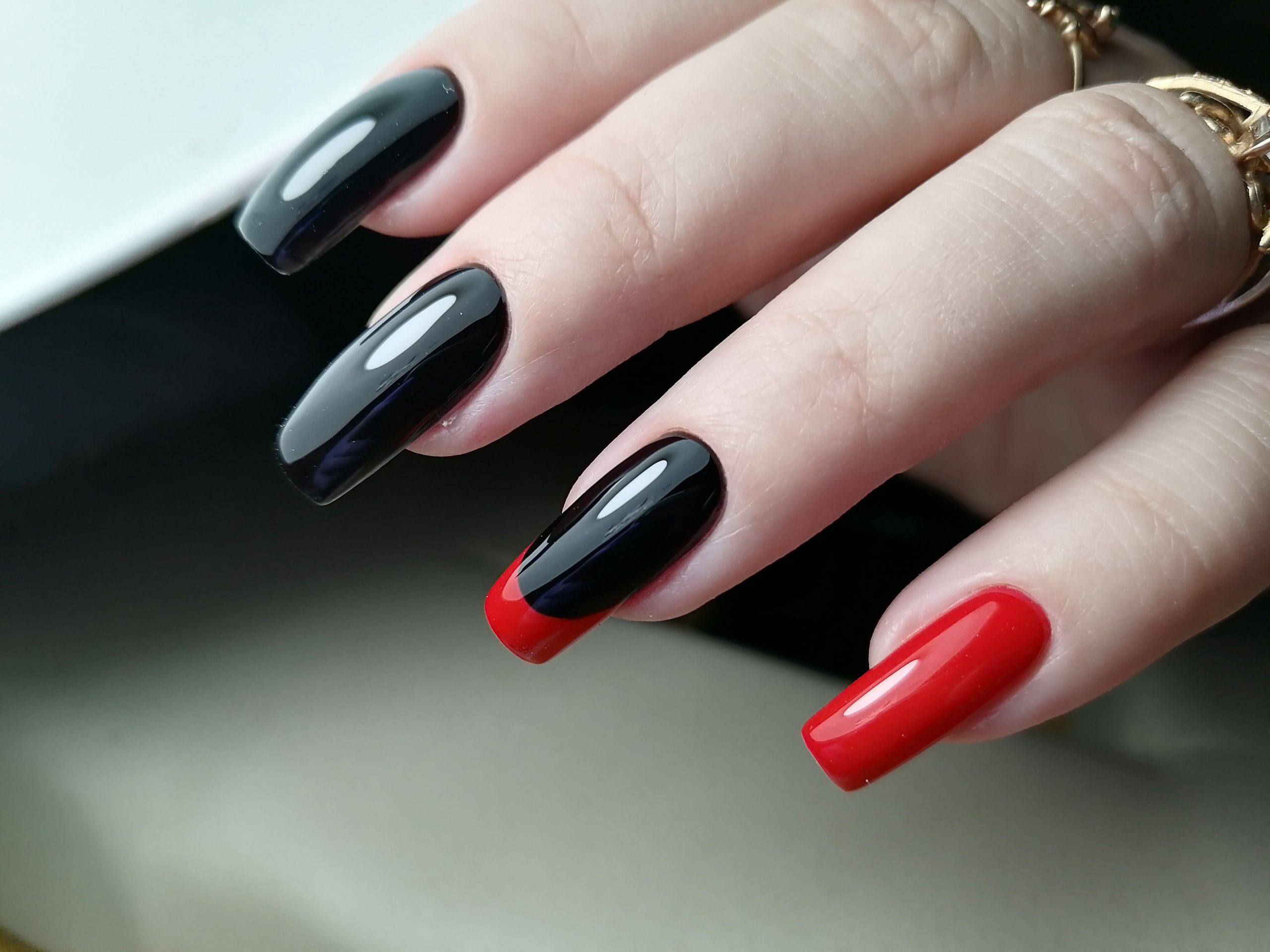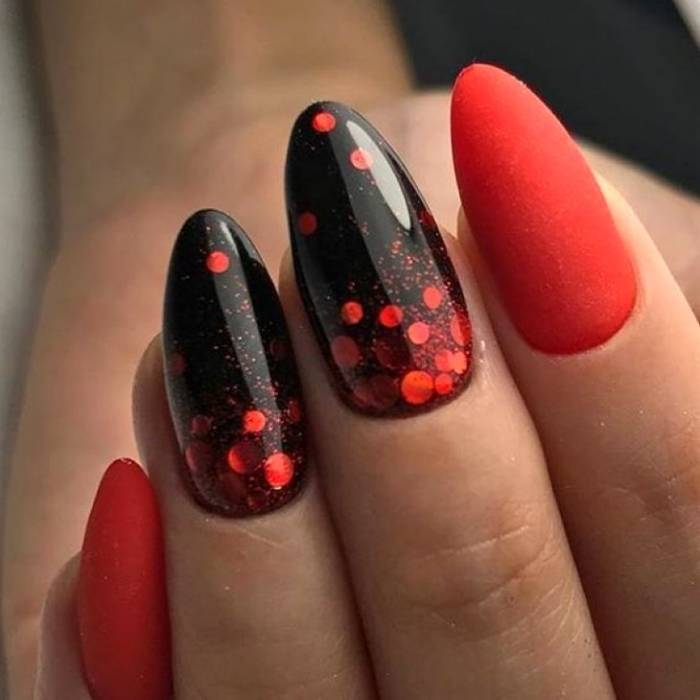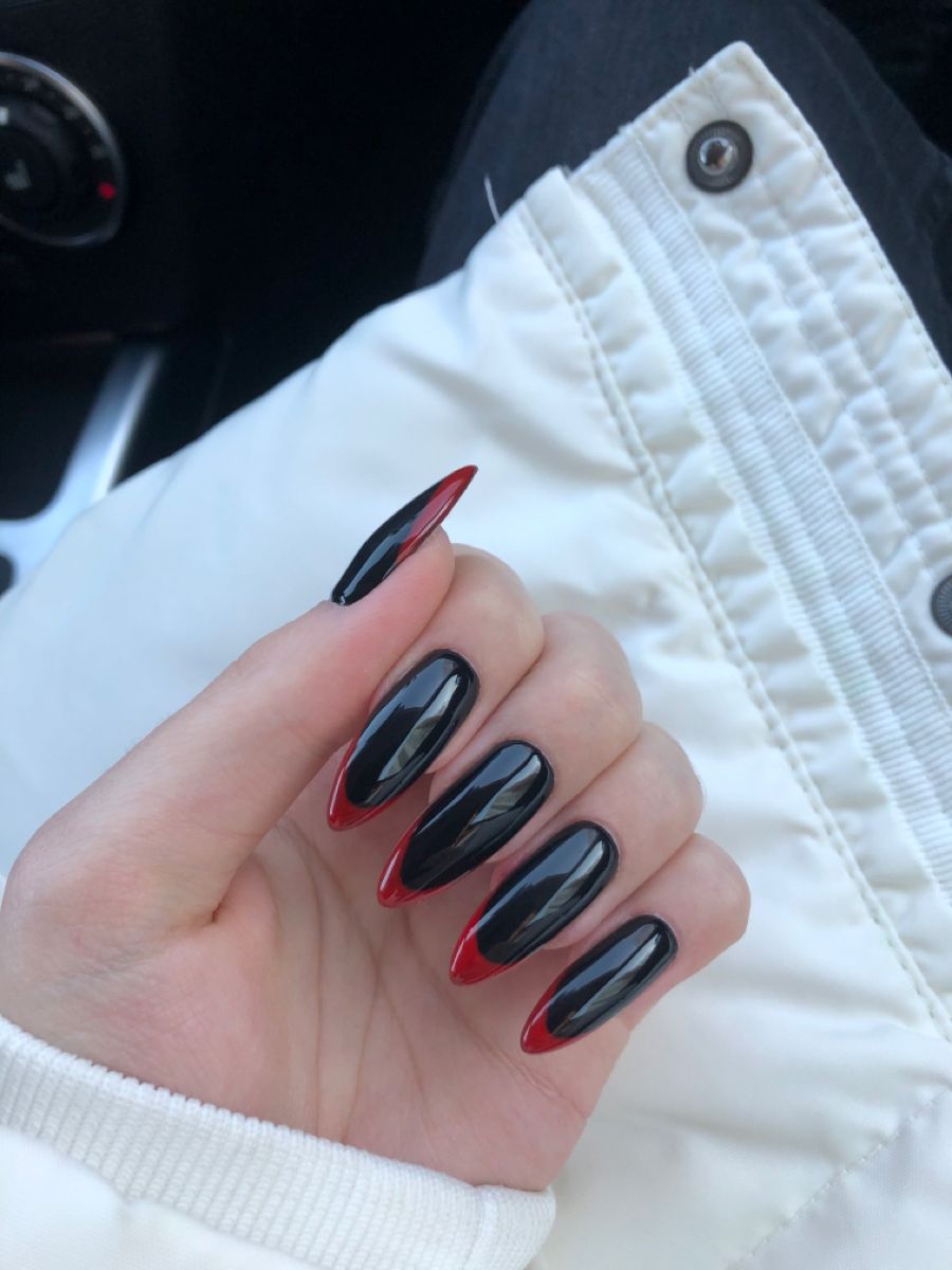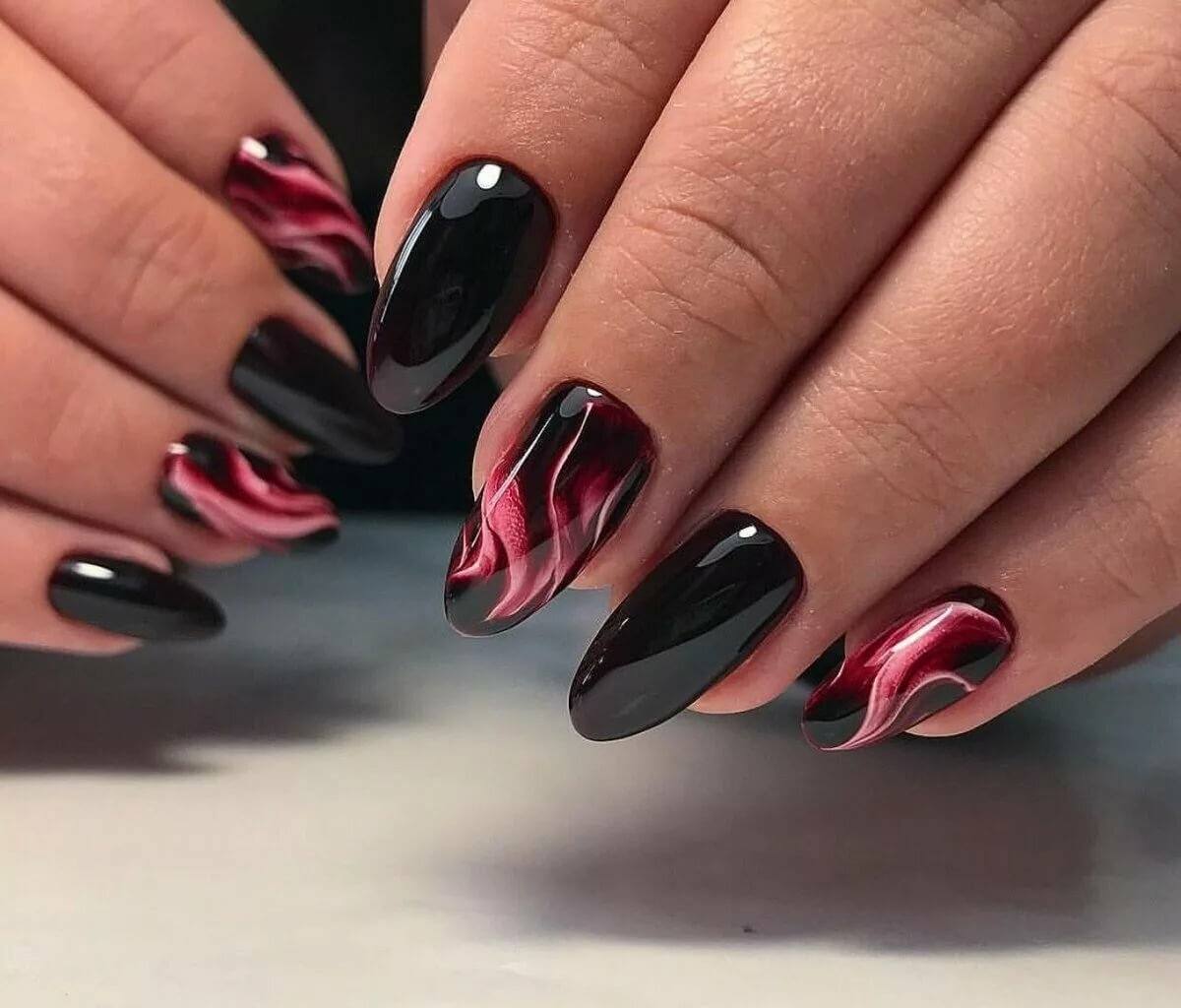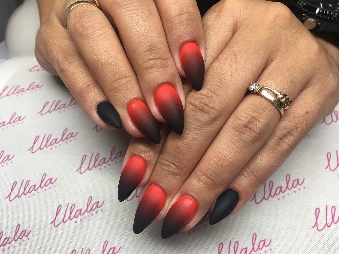 Отметим, что стильный маникюр в черно-красных тонах можно сделать в технике растяжки цвета. Эффект омбре отлично сочетается с длинными ноготками любой формы. а вот для коротких от такого приема лучше отказаться. мастеру просто не хватит длины, чтобы растянуть цвет и сделать переход плавным.