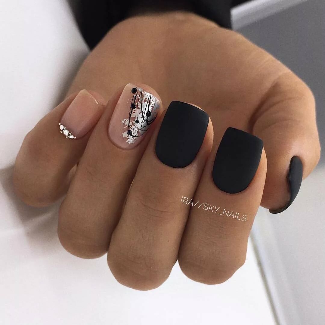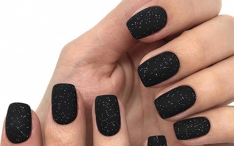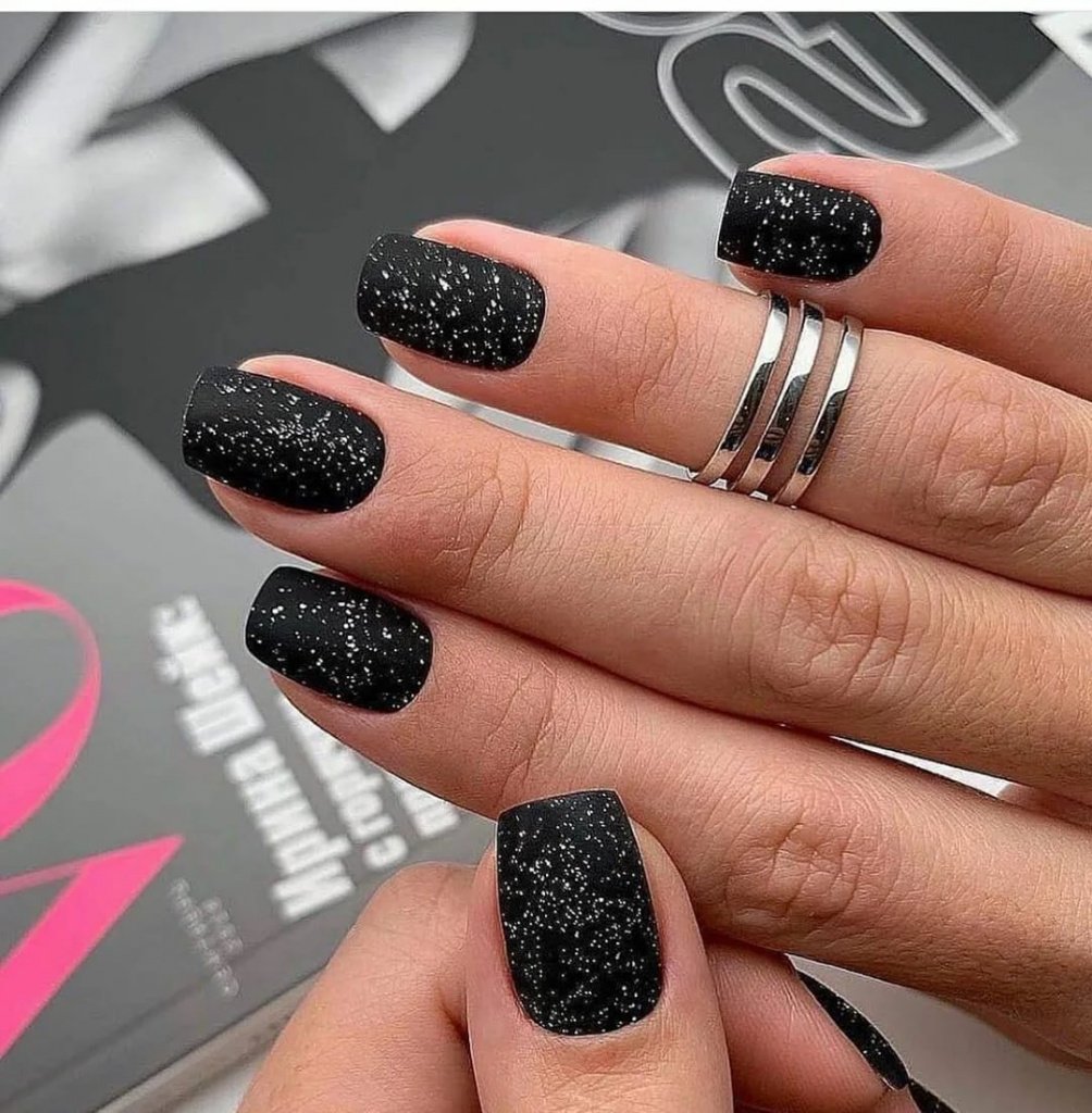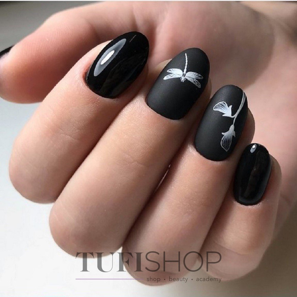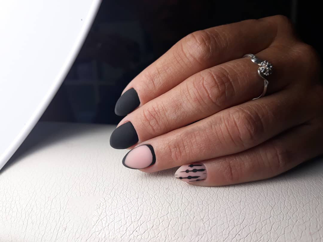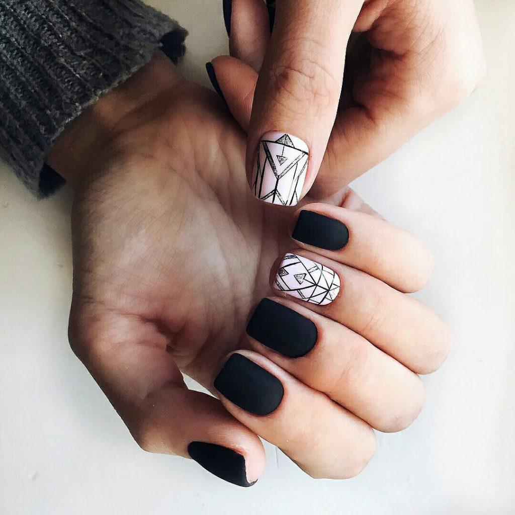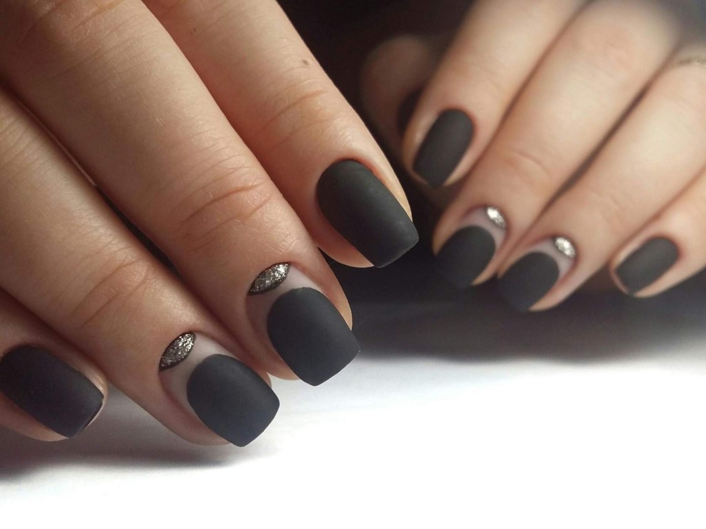 Матовый топ появился не так давно. Но сразу снискал популярность среди модниц. Благородный матовый топ сделает ногти бархатистыми, очень ухоженными. Но не стоит зацикливаться только на матовой текстуре. В одном и том же маникюре вы можете сочетать глянец и матовость. Например, в геометрическом рисунке или черного френче. Интересно и стильно в черном цвете смотрится маникюр, где сочетаются два дизайна — например, животный принт и матовое оформление ноготков.