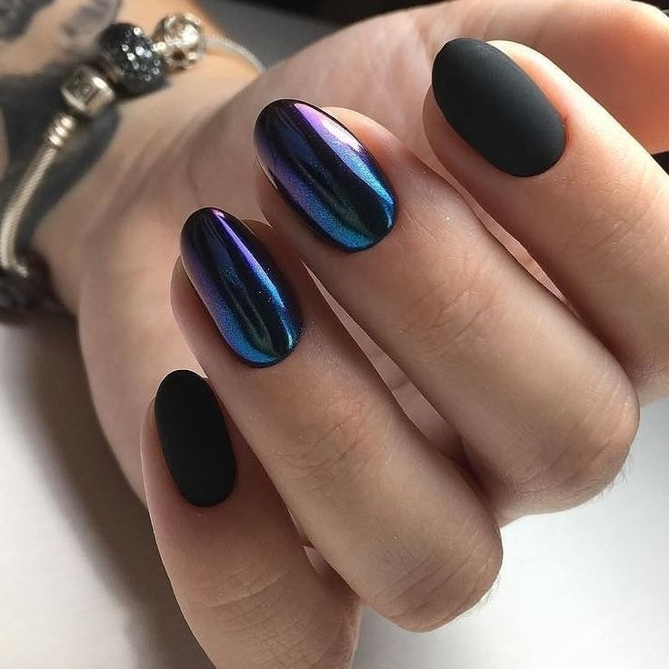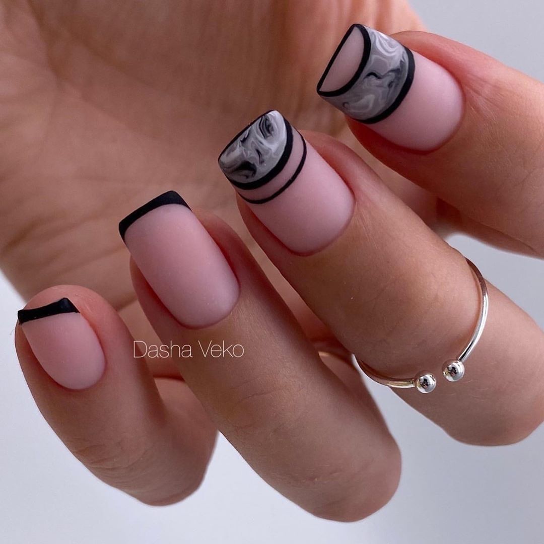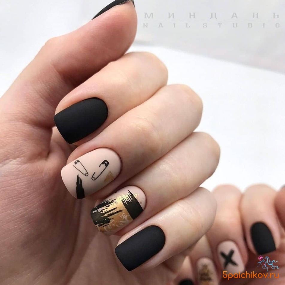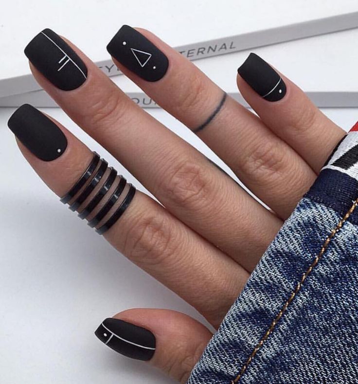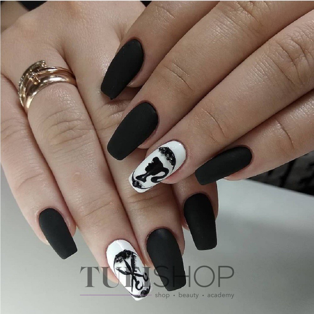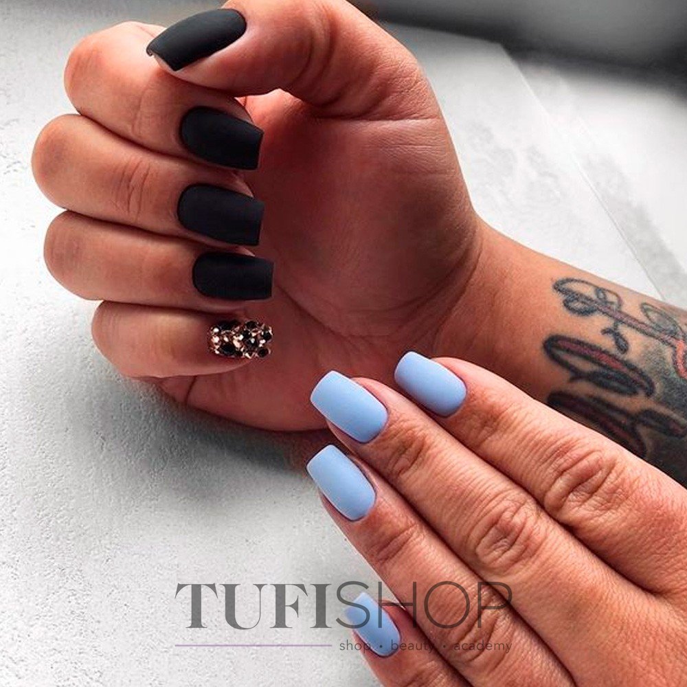 Матовый топ появился не так давно. Но сразу снискал популярность среди модниц. Благородный матовый топ сделает ногти бархатистыми, очень ухоженными. Но не стоит зацикливаться только на матовой текстуре. В одном и том же маникюре вы можете сочетать глянец и матовость. Например, в геометрическом рисунке или черного френче. Интересно и стильно в черном цвете смотрится маникюр, где сочетаются два дизайна — например, животный принт и матовое оформление ноготков.