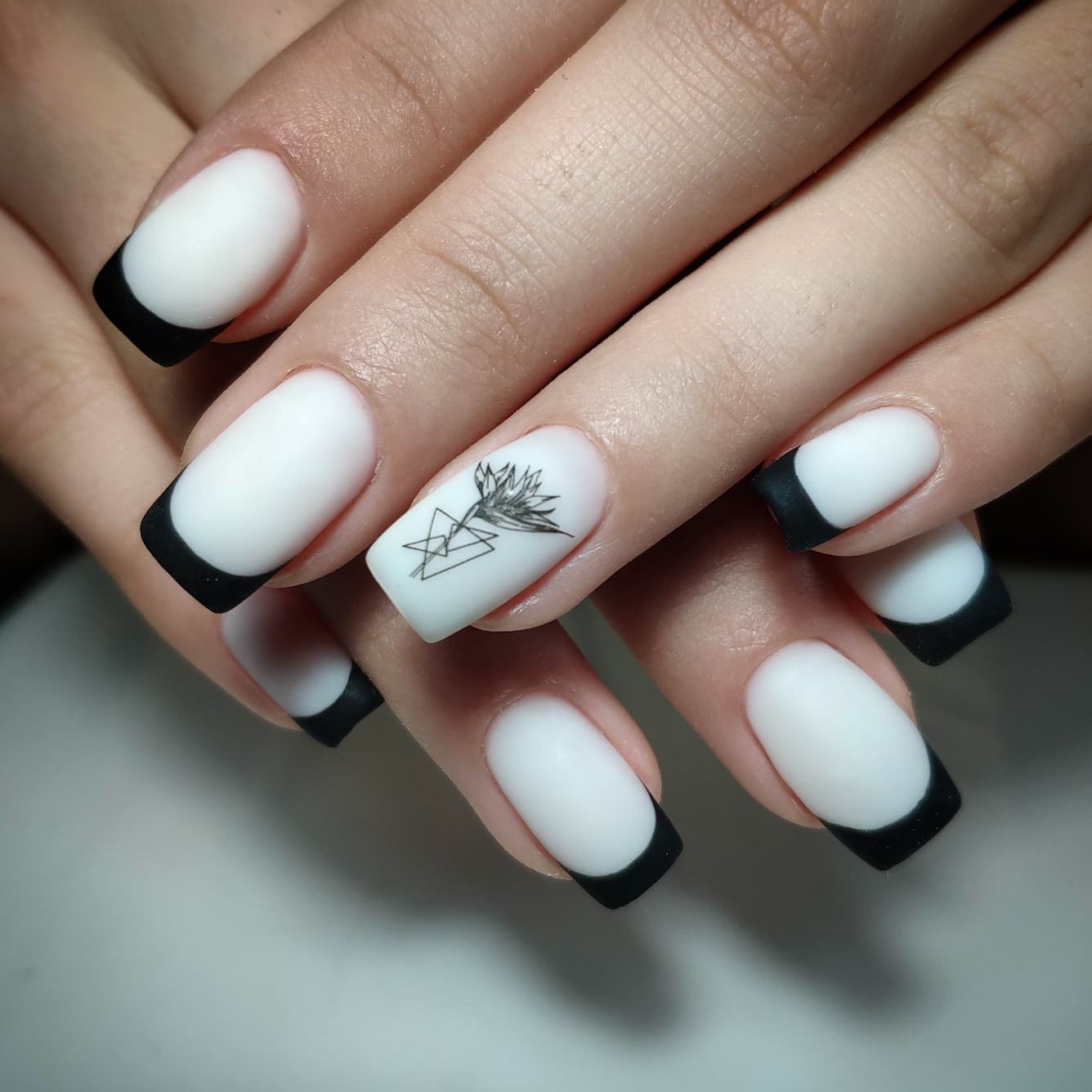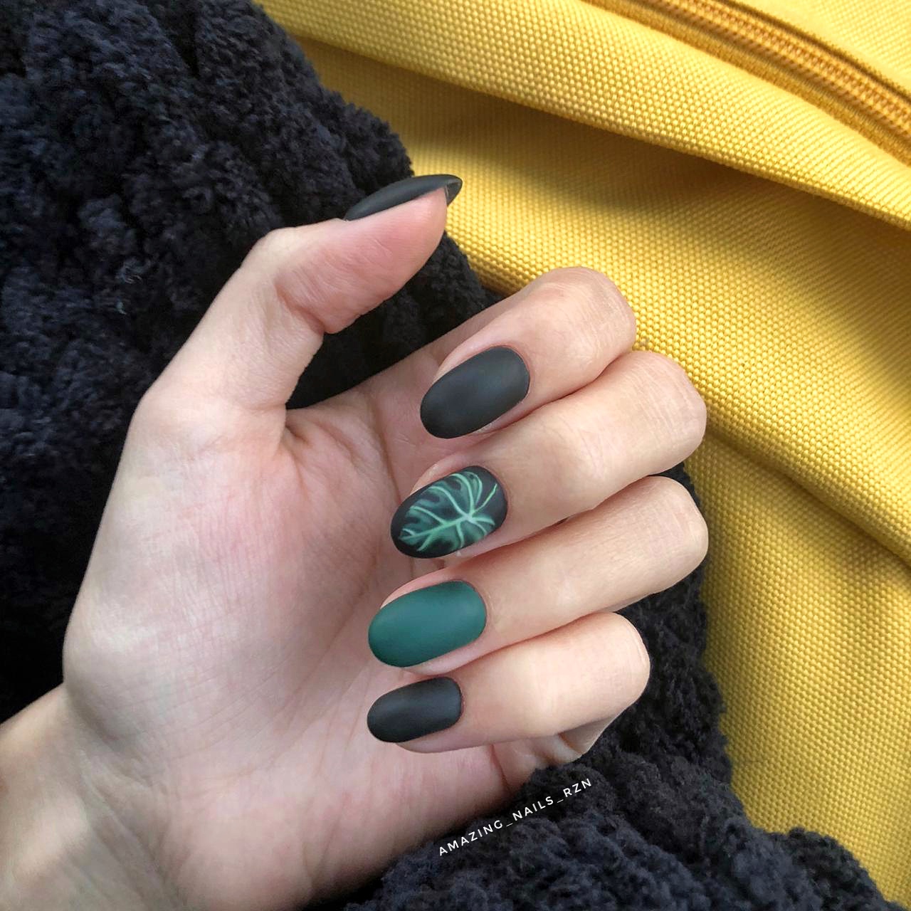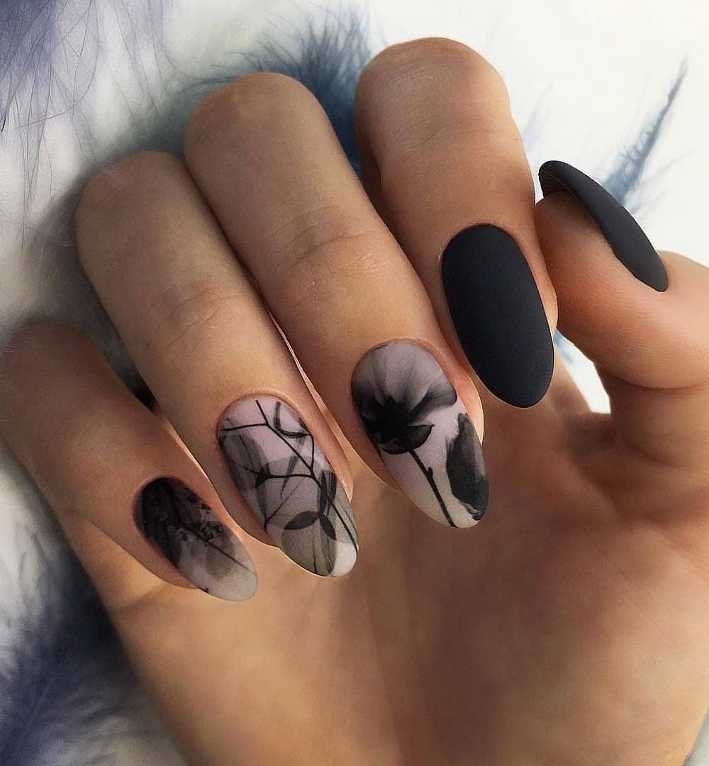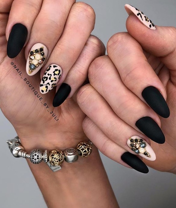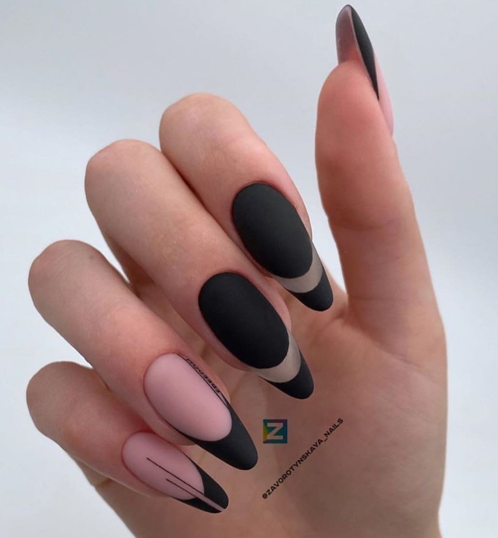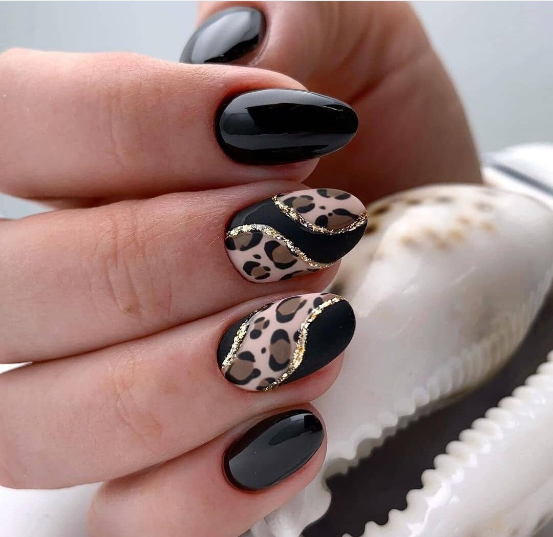 Матовый топ появился не так давно. Но сразу снискал популярность среди модниц. Благородный матовый топ сделает ногти бархатистыми, очень ухоженными. Но не стоит зацикливаться только на матовой текстуре. В одном и том же маникюре вы можете сочетать глянец и матовость. Например, в геометрическом рисунке или черного френче. Интересно и стильно в черном цвете смотрится маникюр, где сочетаются два дизайна — например, животный принт и матовое оформление ноготков.
