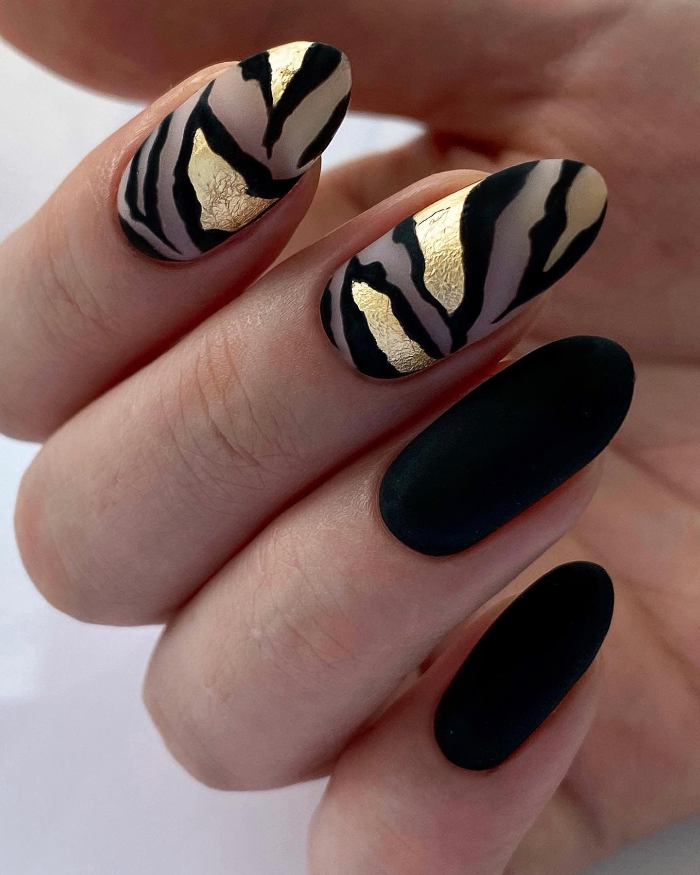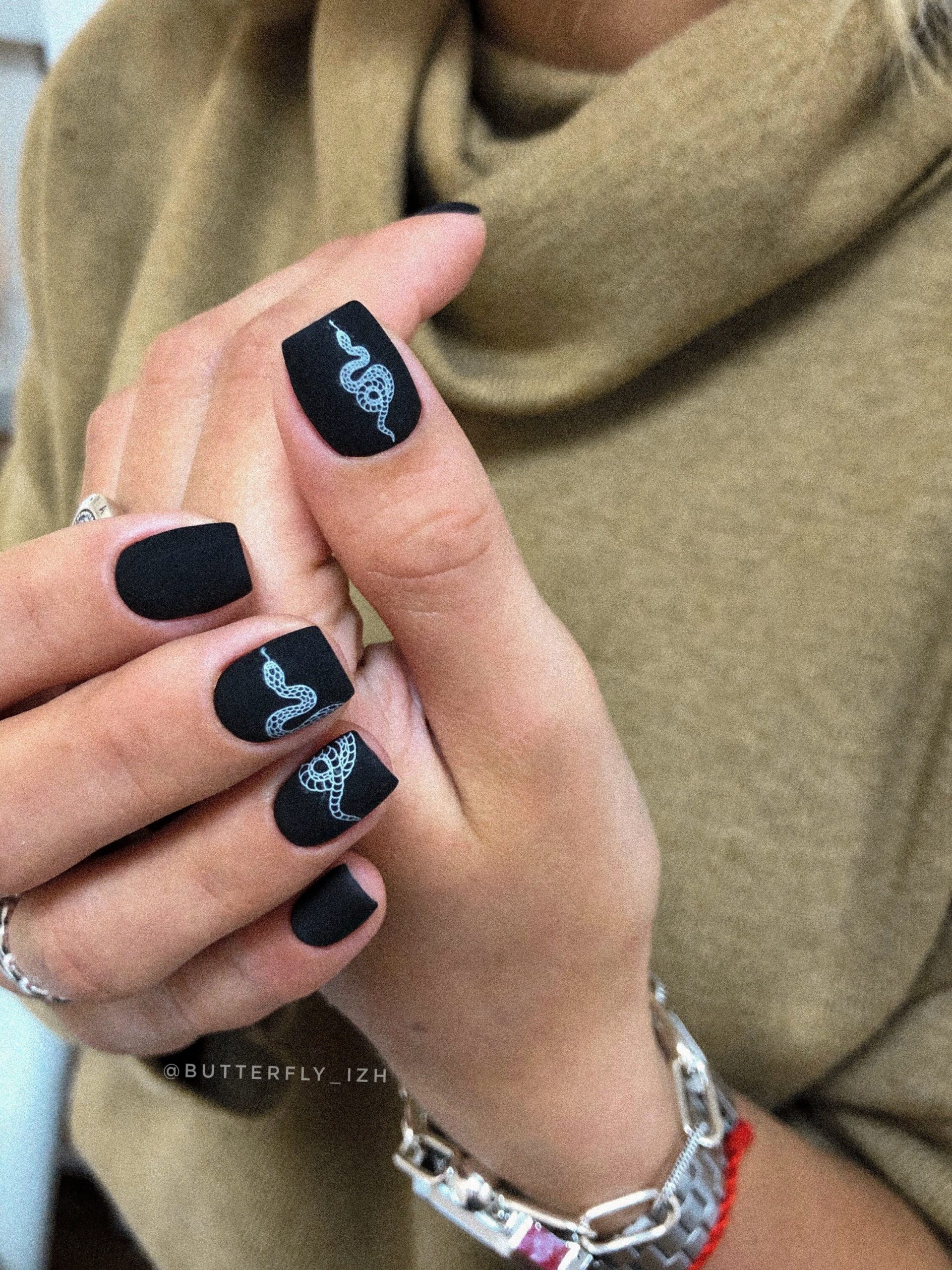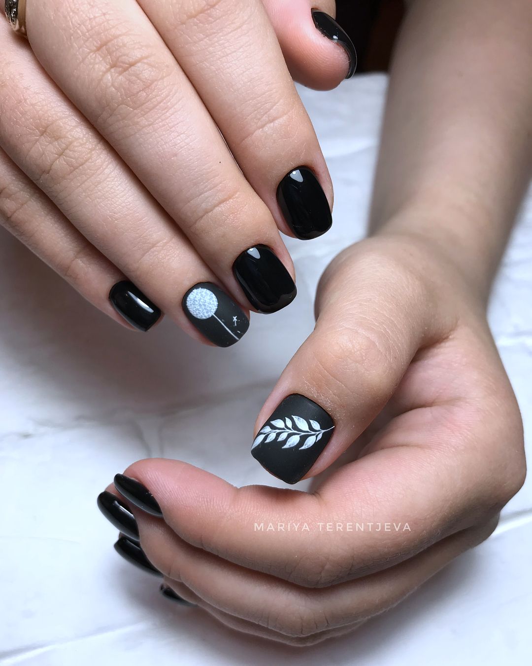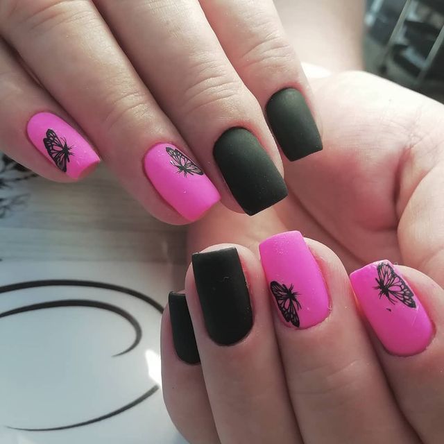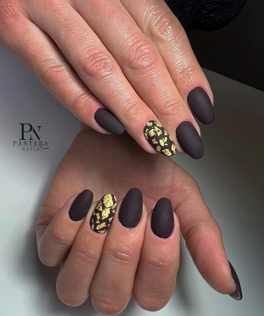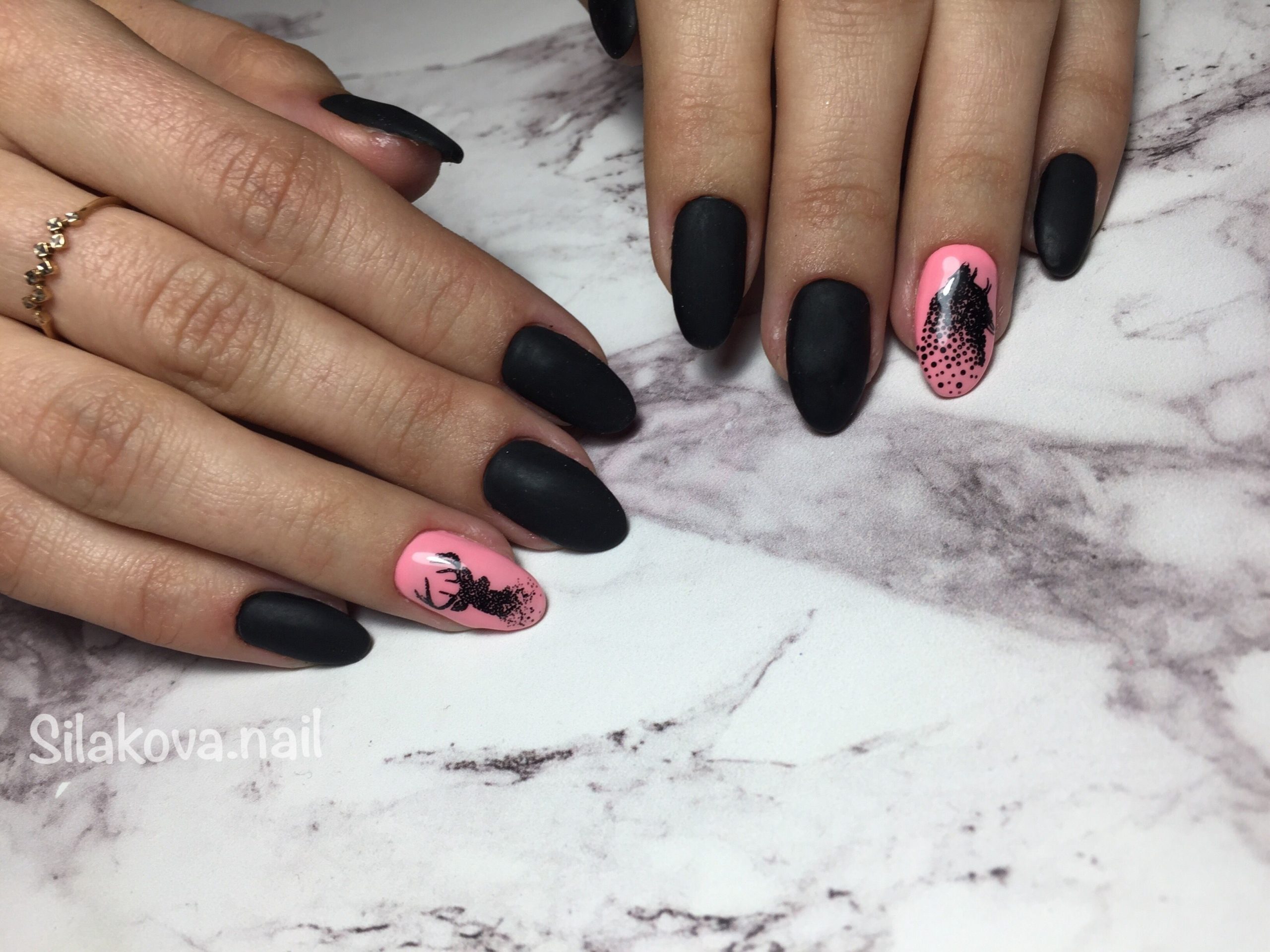 Матовый топ появился не так давно. Но сразу снискал популярность среди модниц. Благородный матовый топ сделает ногти бархатистыми, очень ухоженными. Но не стоит зацикливаться только на матовой текстуре. В одном и том же маникюре вы можете сочетать глянец и матовость. Например, в геометрическом рисунке или черного френче. Интересно и стильно в черном цвете смотрится маникюр, где сочетаются два дизайна — например, животный принт и матовое оформление ноготков.