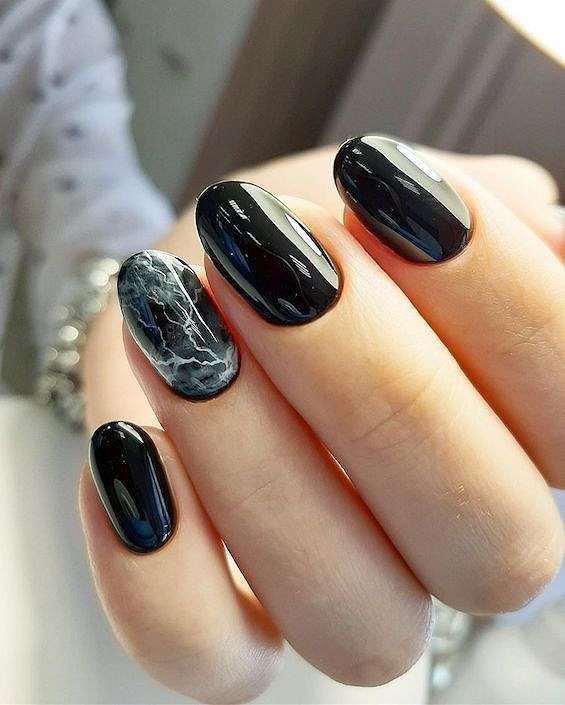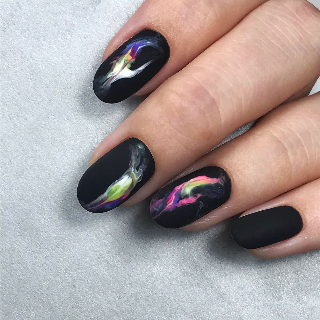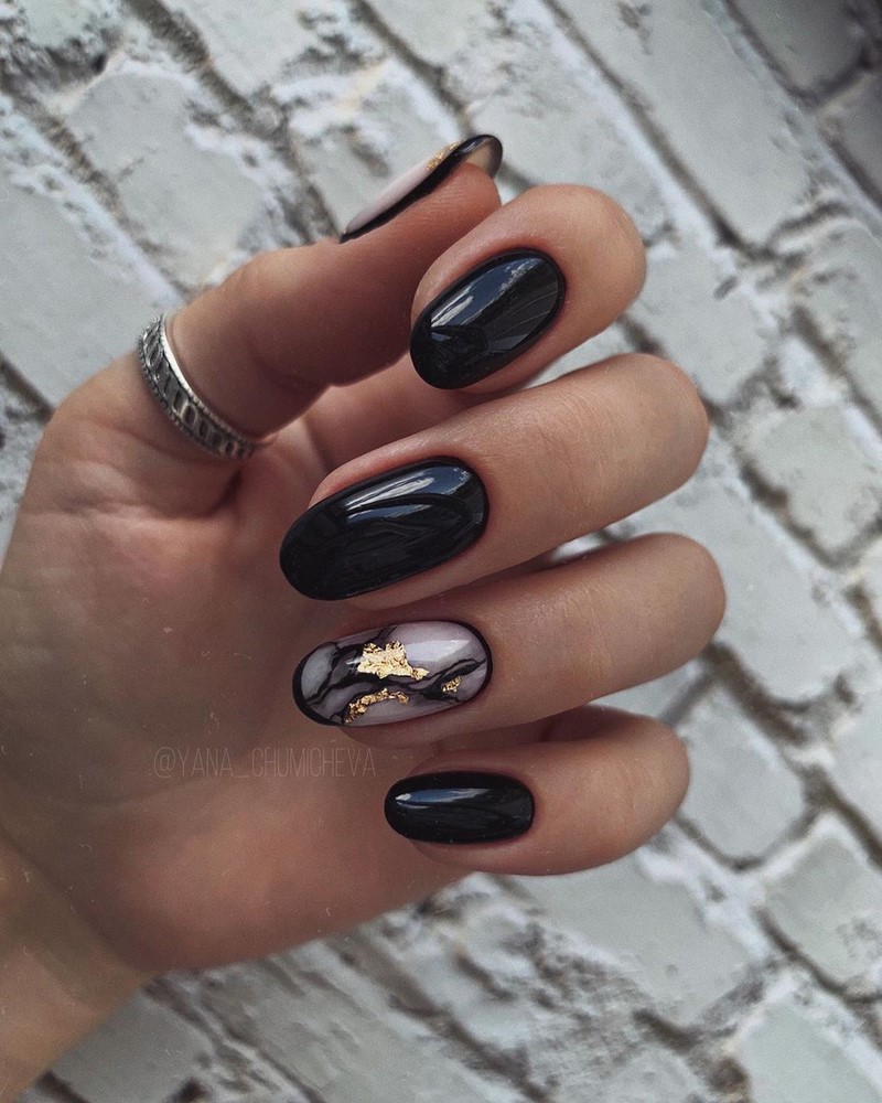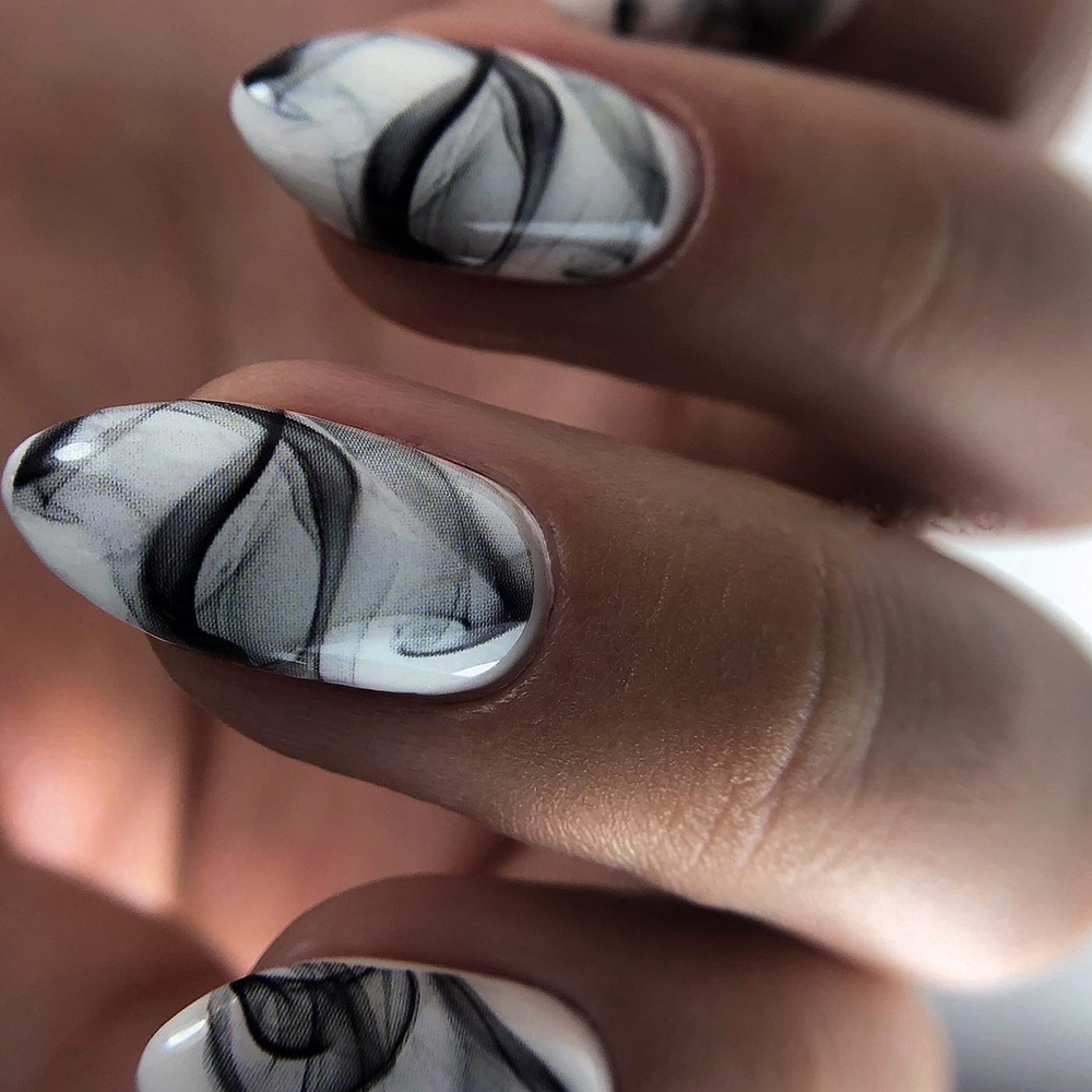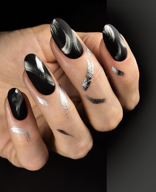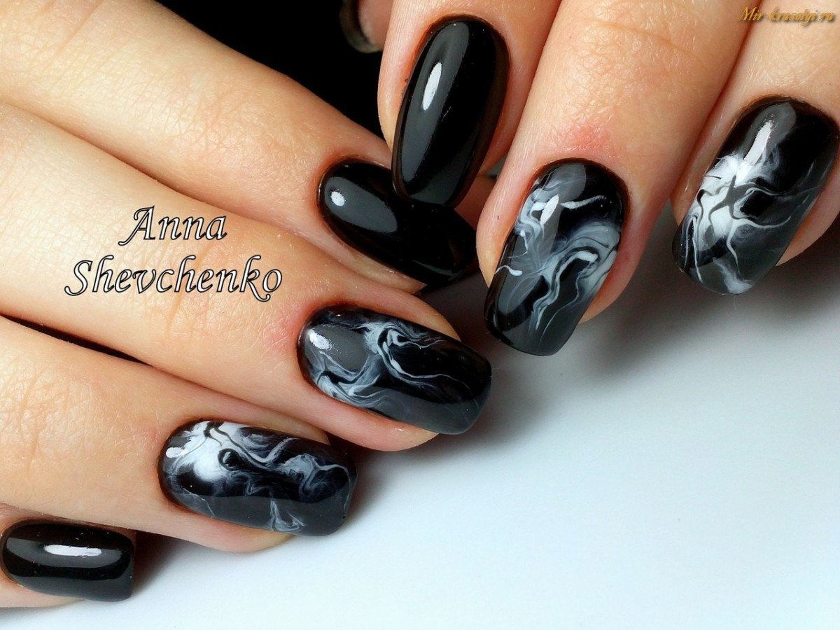Черный маникюр с разводами — хит сезона. Разводы могут быть белыми, серыми или яркими цветными. Кроме того, их можно нанести не с помощью лака, а фольгой или другими материалами.