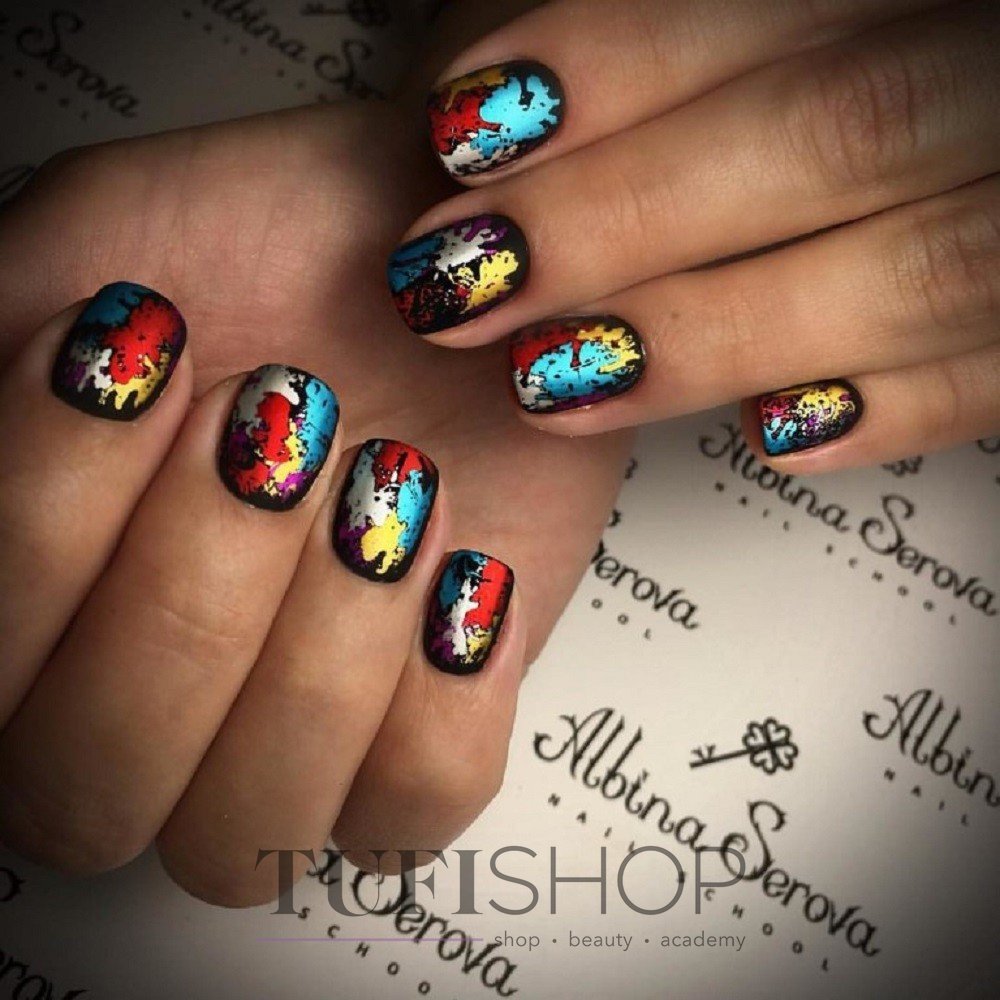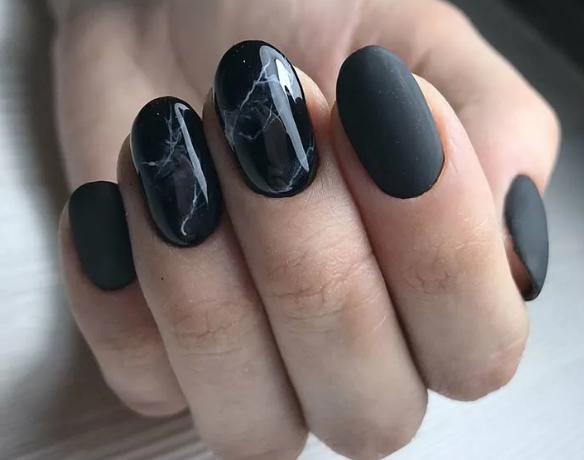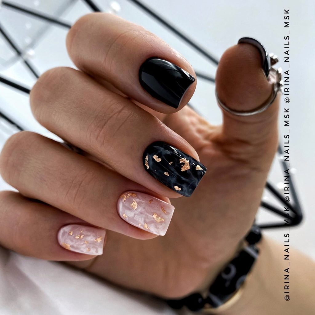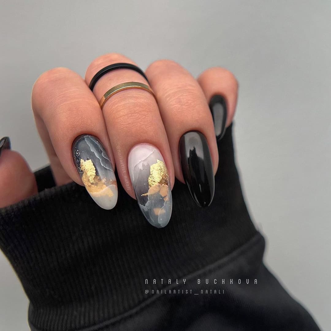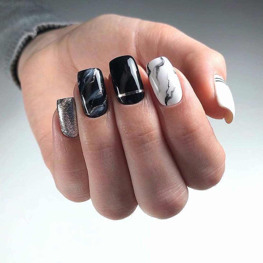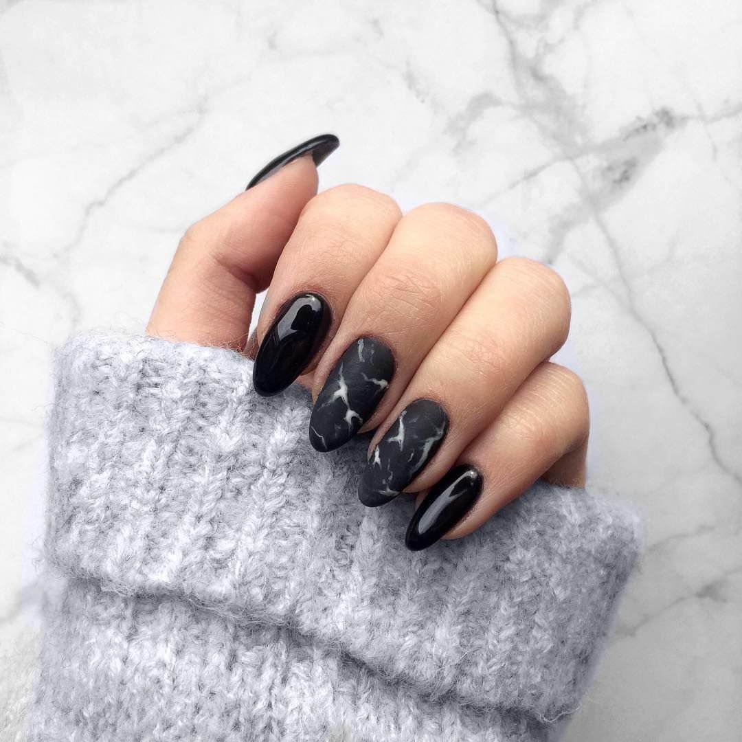 Черный маникюр с разводами — хит сезона. Разводы могут быть белыми, серыми или яркими цветными. Кроме того, их можно нанести не с помощью лака, а фольгой или другими материалами.