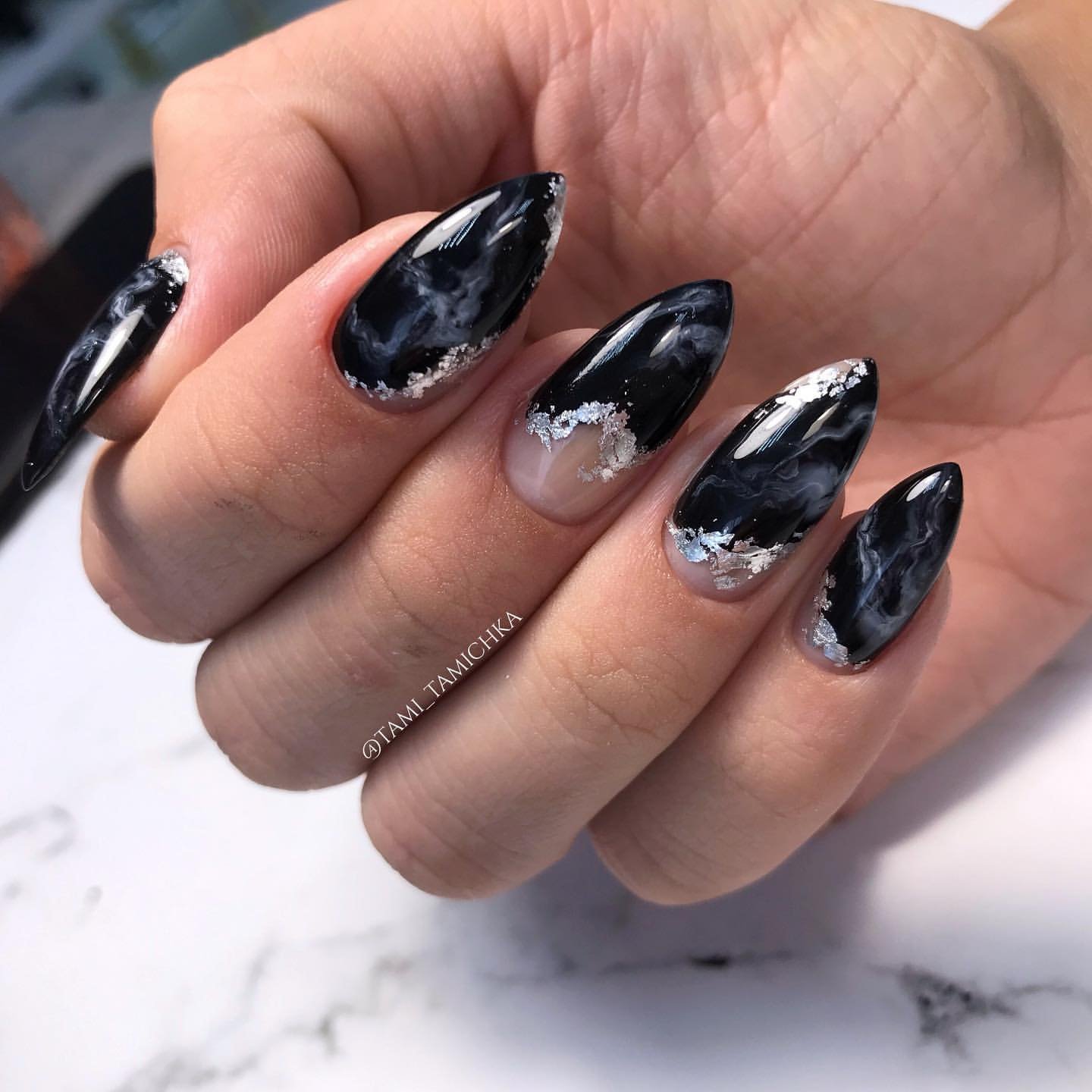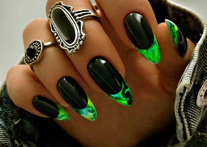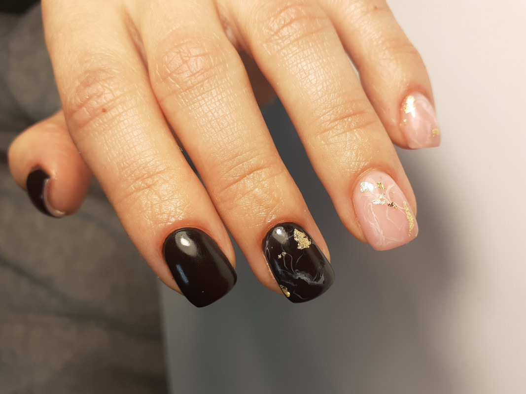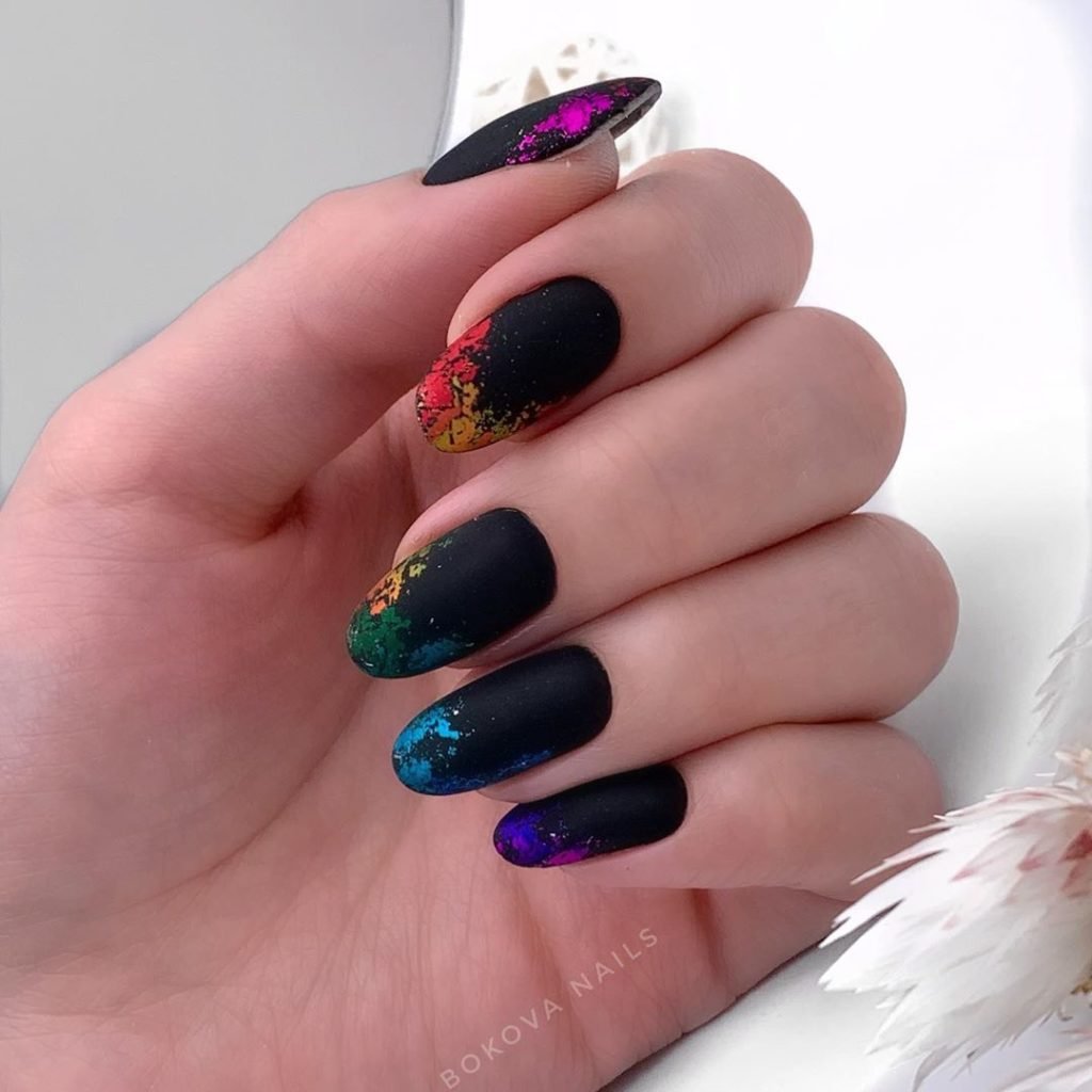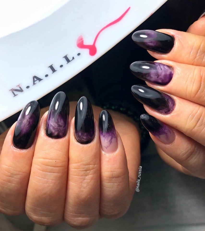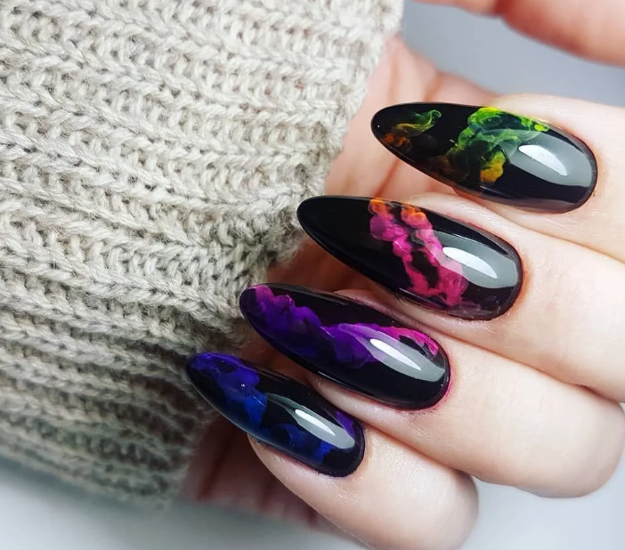 Черный маникюр с разводами — хит сезона. Разводы могут быть белыми, серыми или яркими цветными. Кроме того, их можно нанести не с помощью лака, а фольгой или другими материалами.