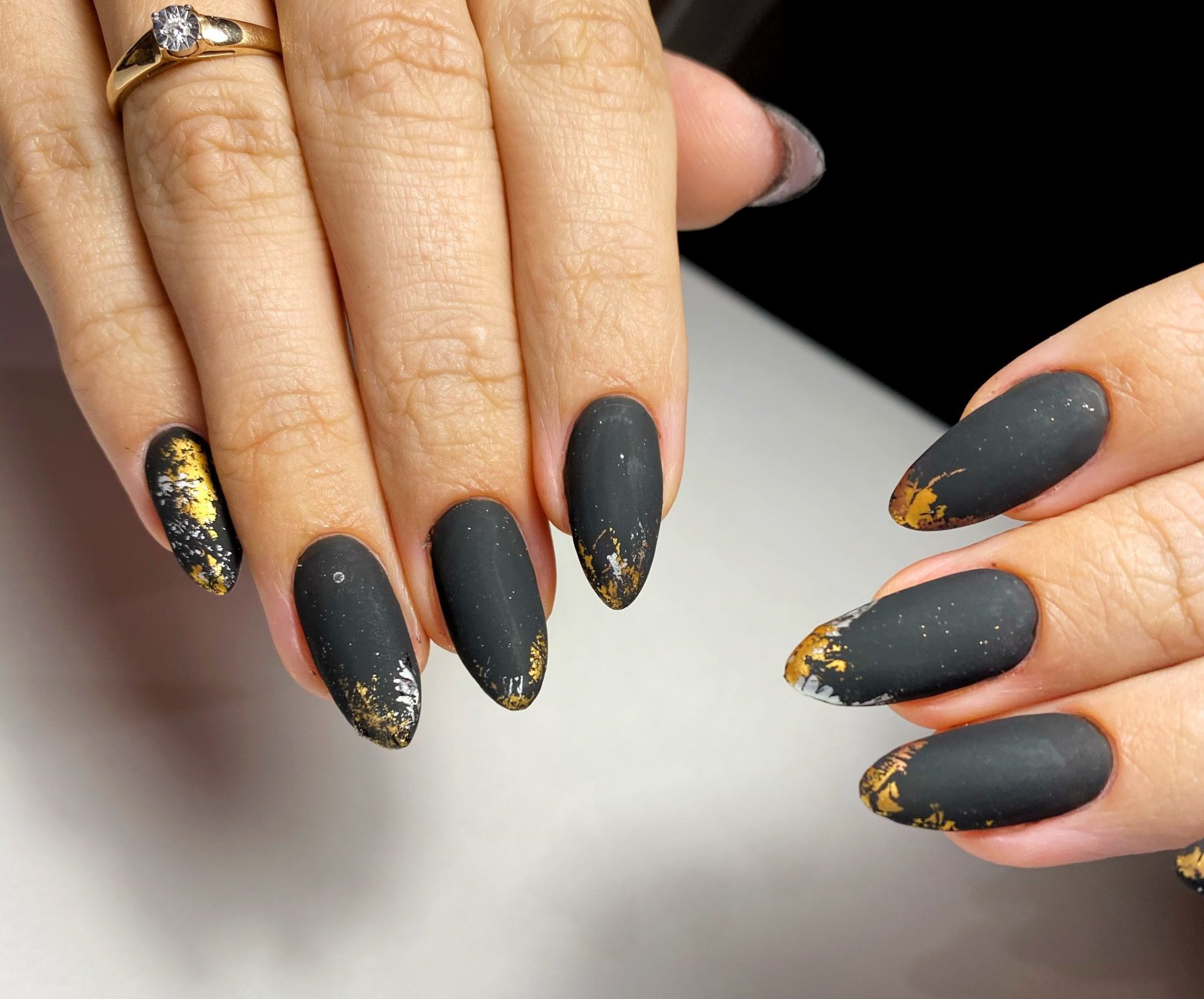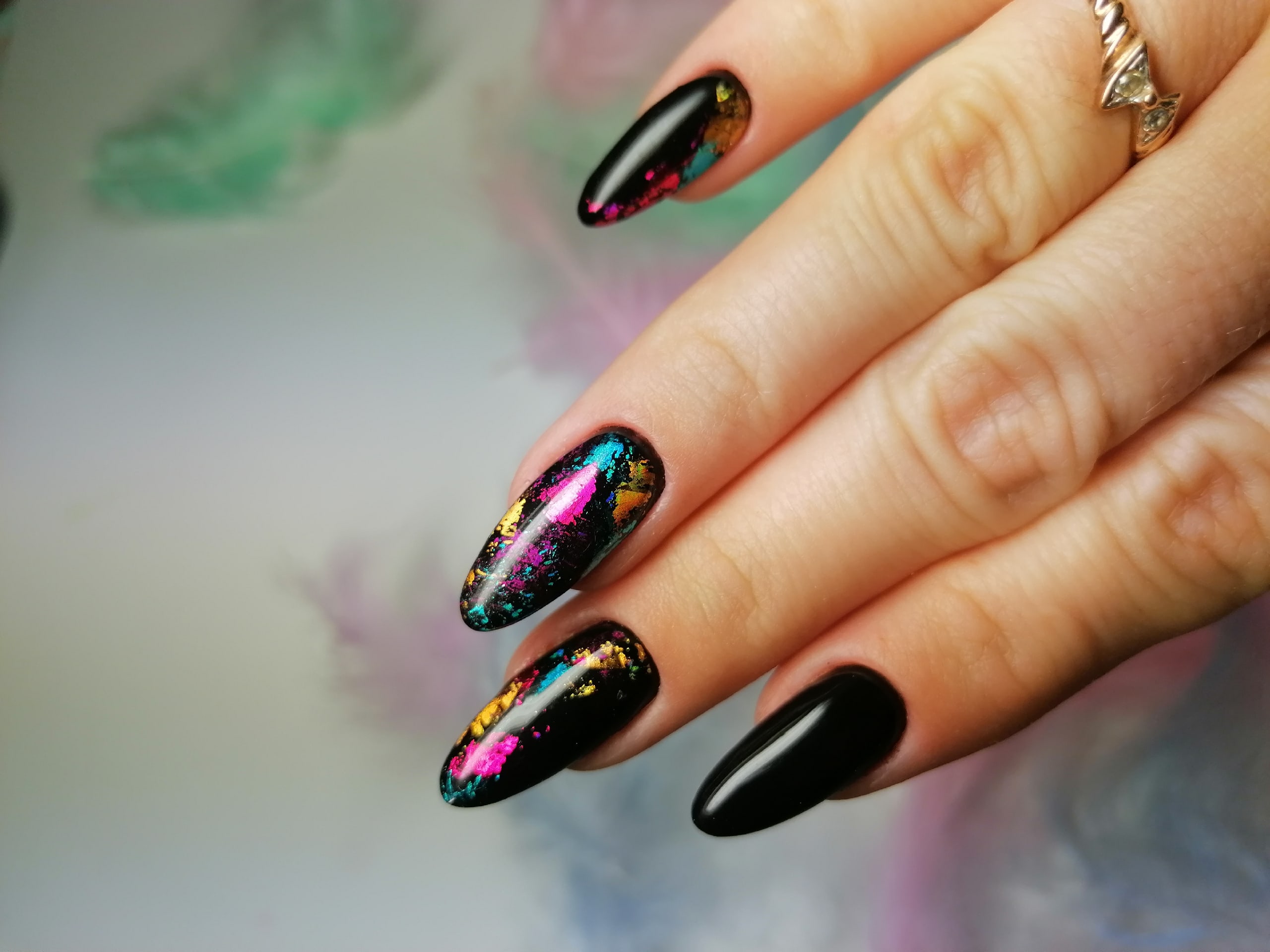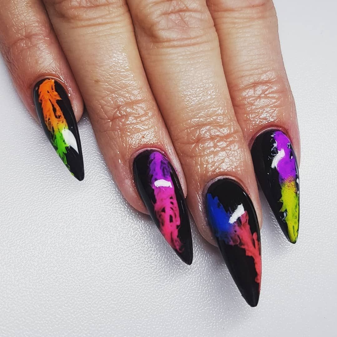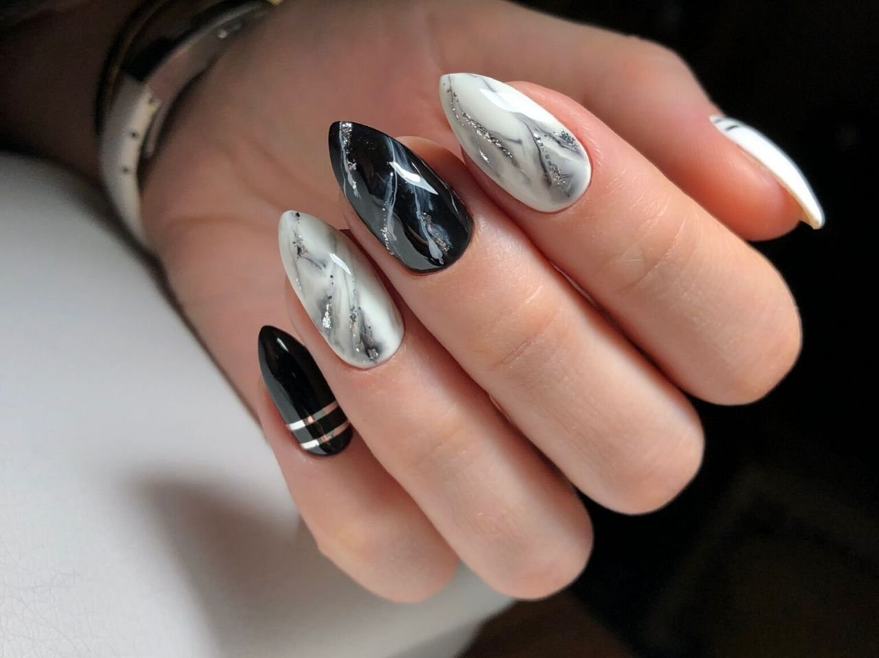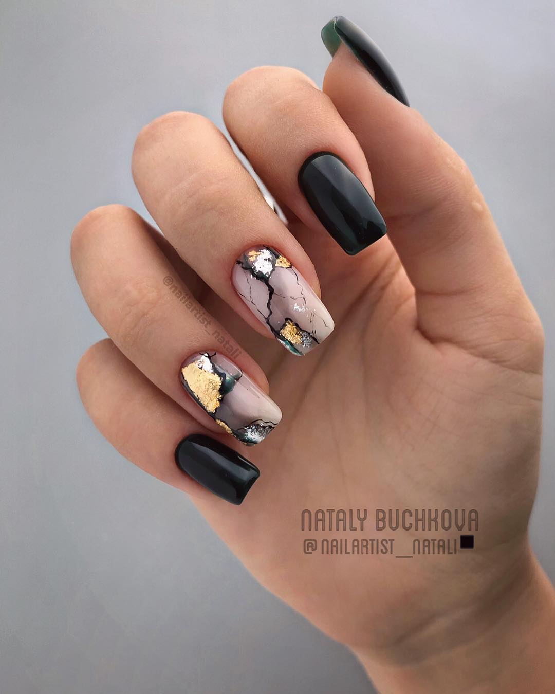 Черный маникюр с разводами — хит сезона. Разводы могут быть белыми, серыми или яркими цветными. Кроме того, их можно нанести не с помощью лака, а фольгой или другими материалами.