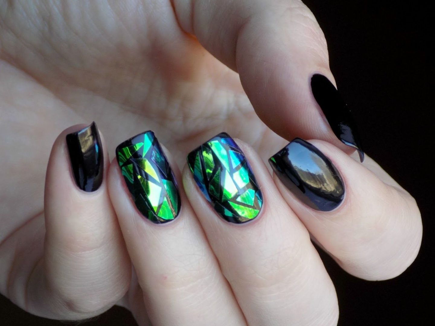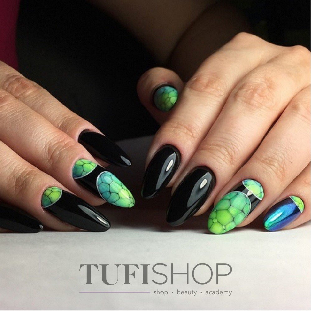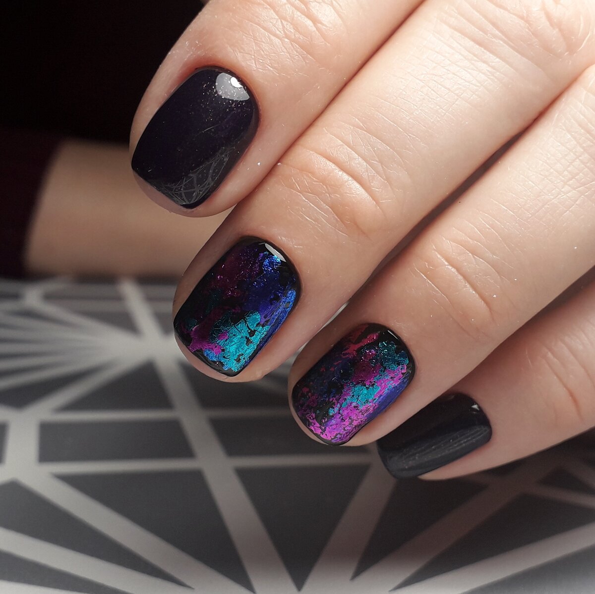 Довольно интересный дизайн, эффектность которого многократно усиливается на черной базе. Для воплощения идеи мастер использует специальную пленку, которую режут на неправильные фигуры и размещают особым образом, имитируя разбитое стекло. Важный момент — пленку нужно будет хорошо зафиксировать на поверхности пластины, чтобы острые края «осколков» не царапали все вокруг.