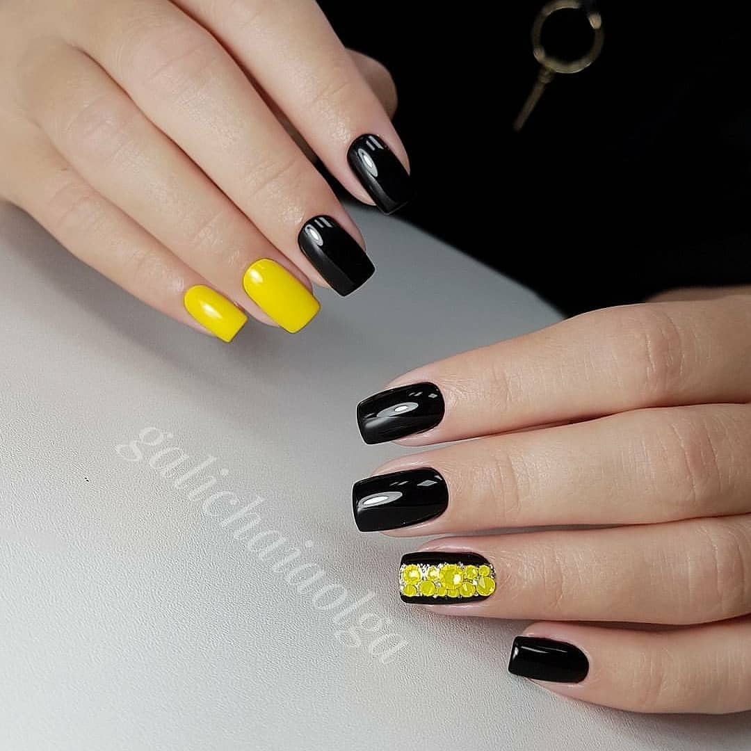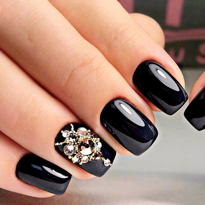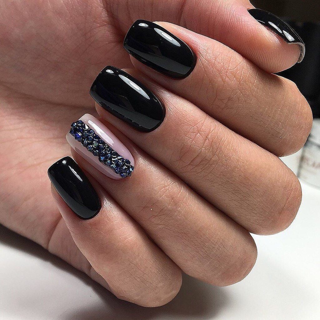 Квадратную форму выбирают смелые и дерзкие натуры, которые не боятся того, что часто такой опил называют непрактичным и даже неженственным. Черный лак для квадратной формы — оптимальный выбор. У вас получится создать стильный однотонный маникюр. Если немного разбавить его стразами, получится идеальный вариант на вечер. Плюс такого дизайна в том, что не понадобится множество блестящих элементов. Достаточно декора в стиле минимализм.