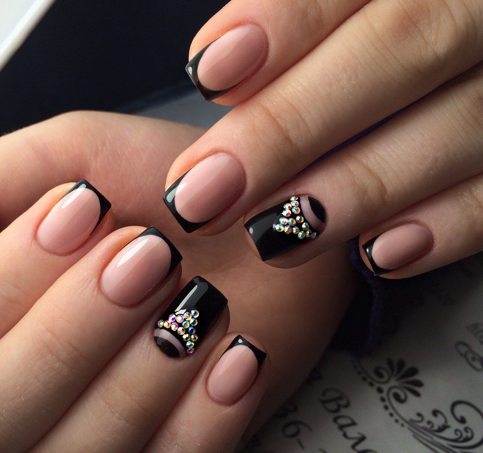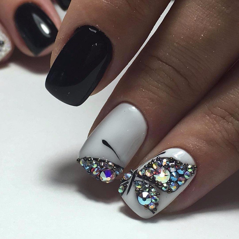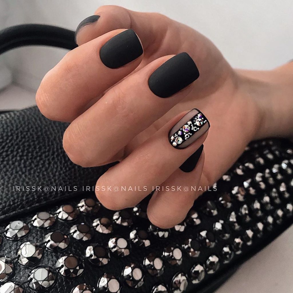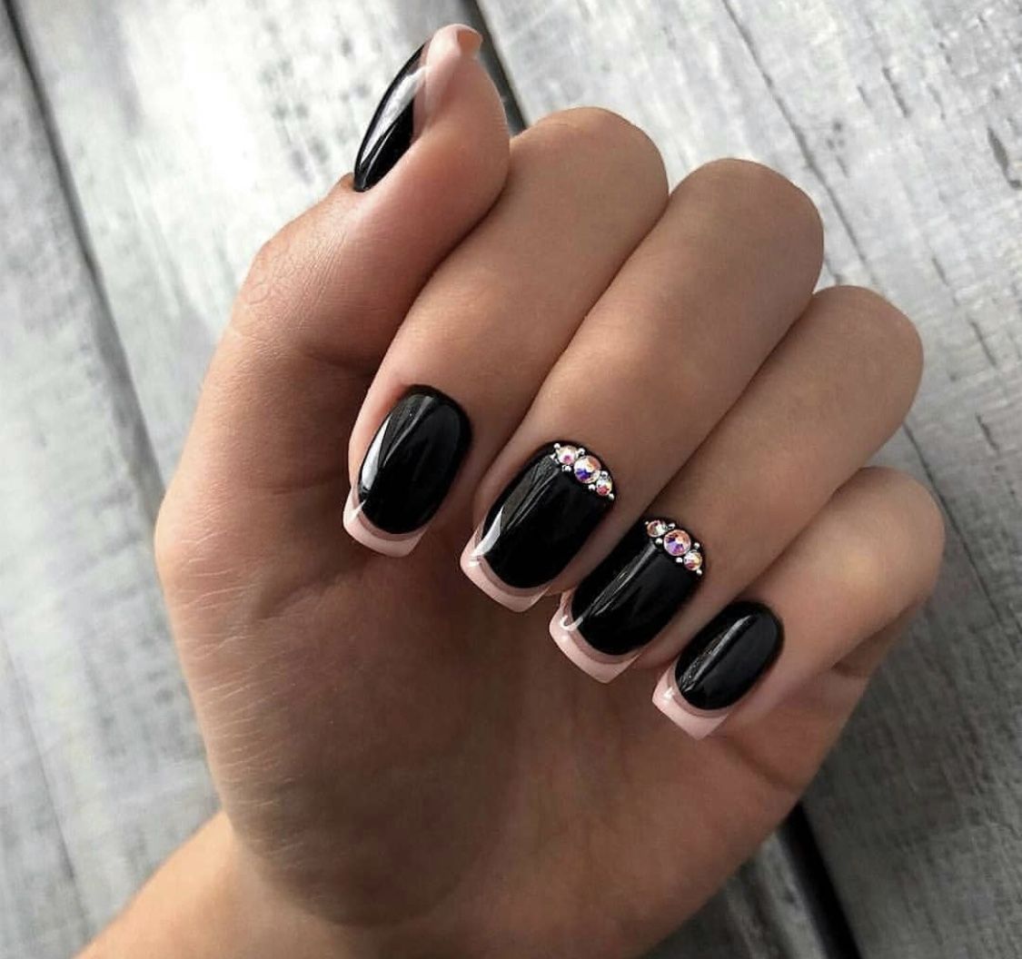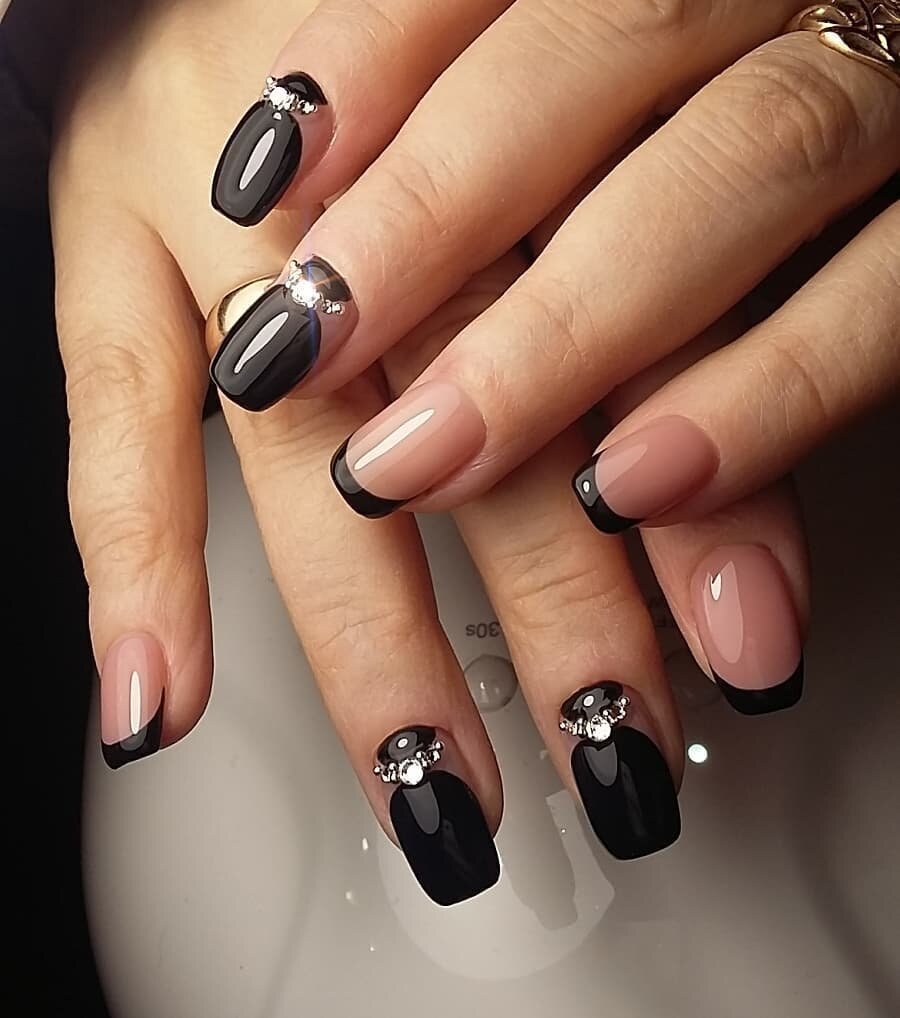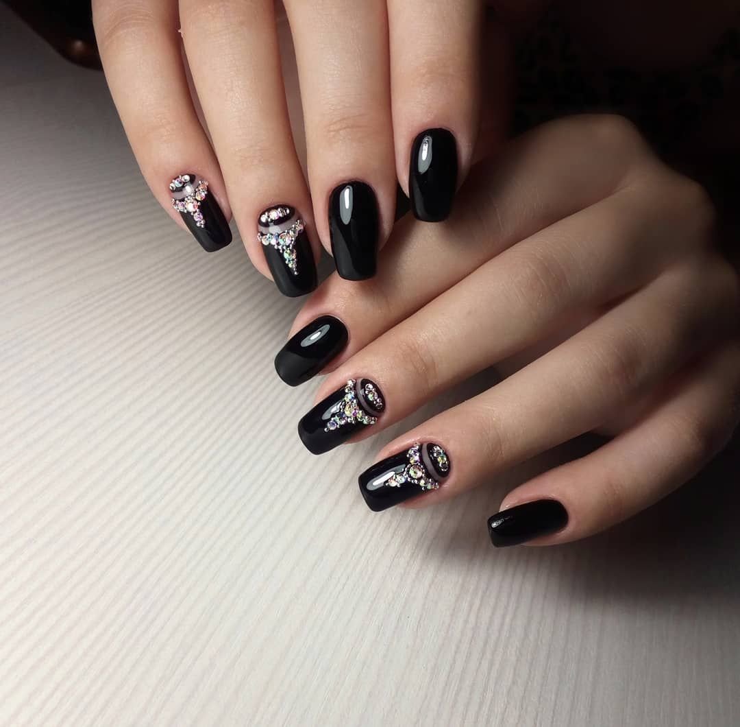 Стразы — удивительный вариант декора. С их помощью можно создать стильный маникюр или сделать безвкусный чрезмерный дизайн. Напомним — во всем хороша мера. Соблюдайте правило уместности. Хотя черная база очень терпима к размещению камней. Но в этом сезоне даже для черного маникюра в трендах стиль минимализм. Например, совместите лунный маникюр или френч со стразами — по одному камню в центре каждого ногтя или тонкая дорожка камней.