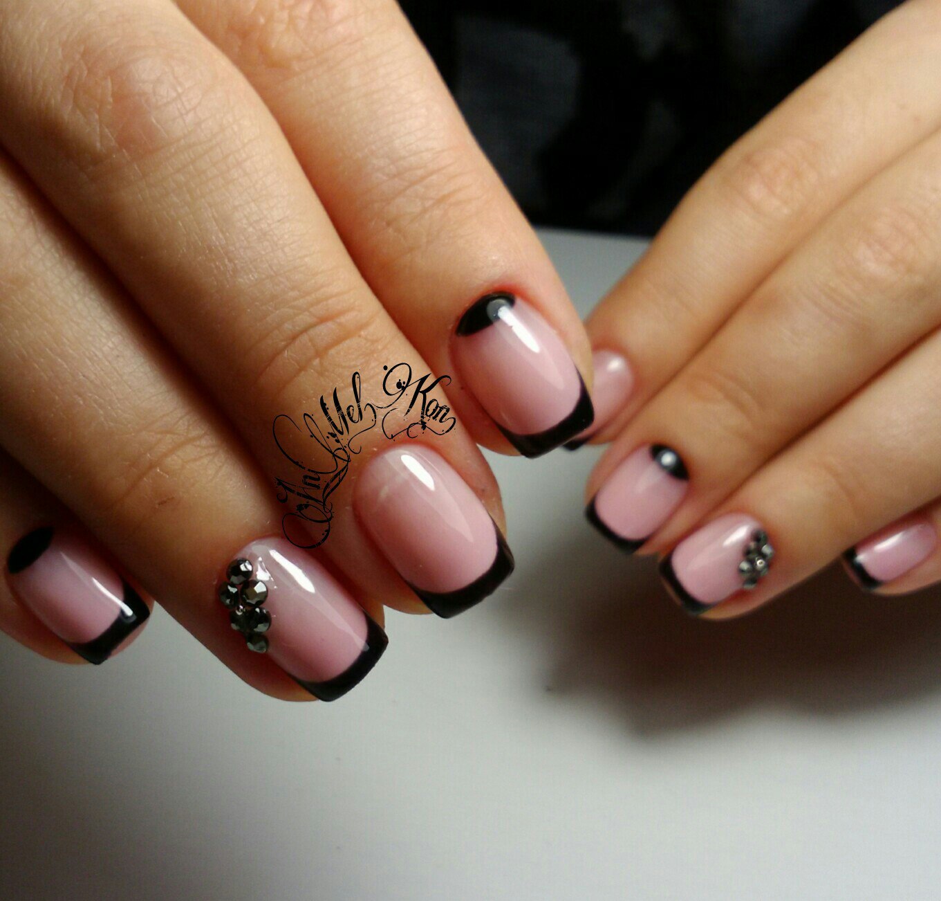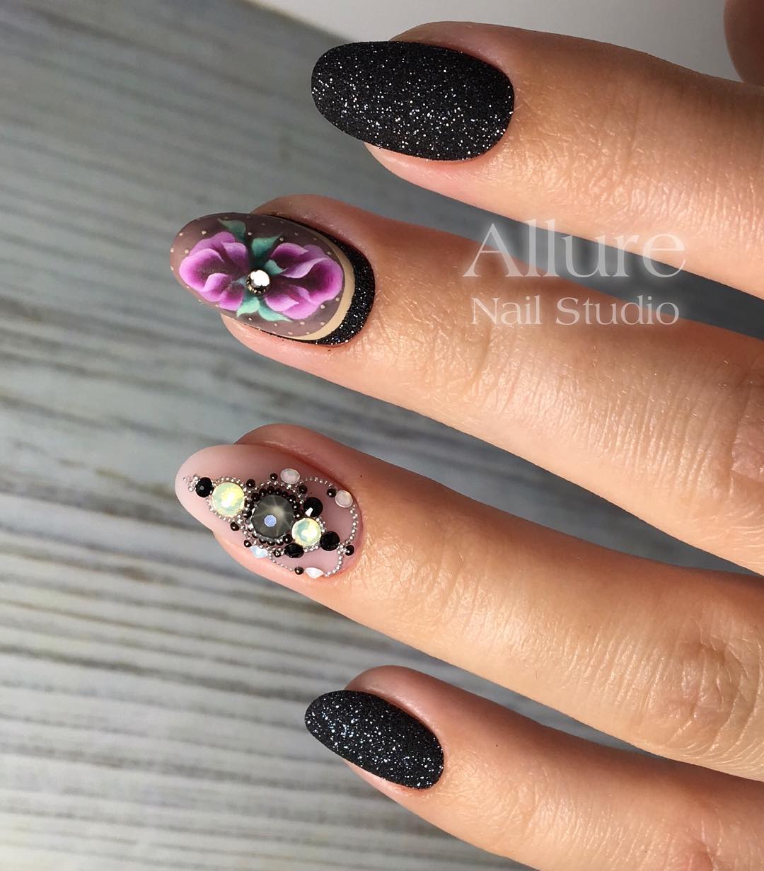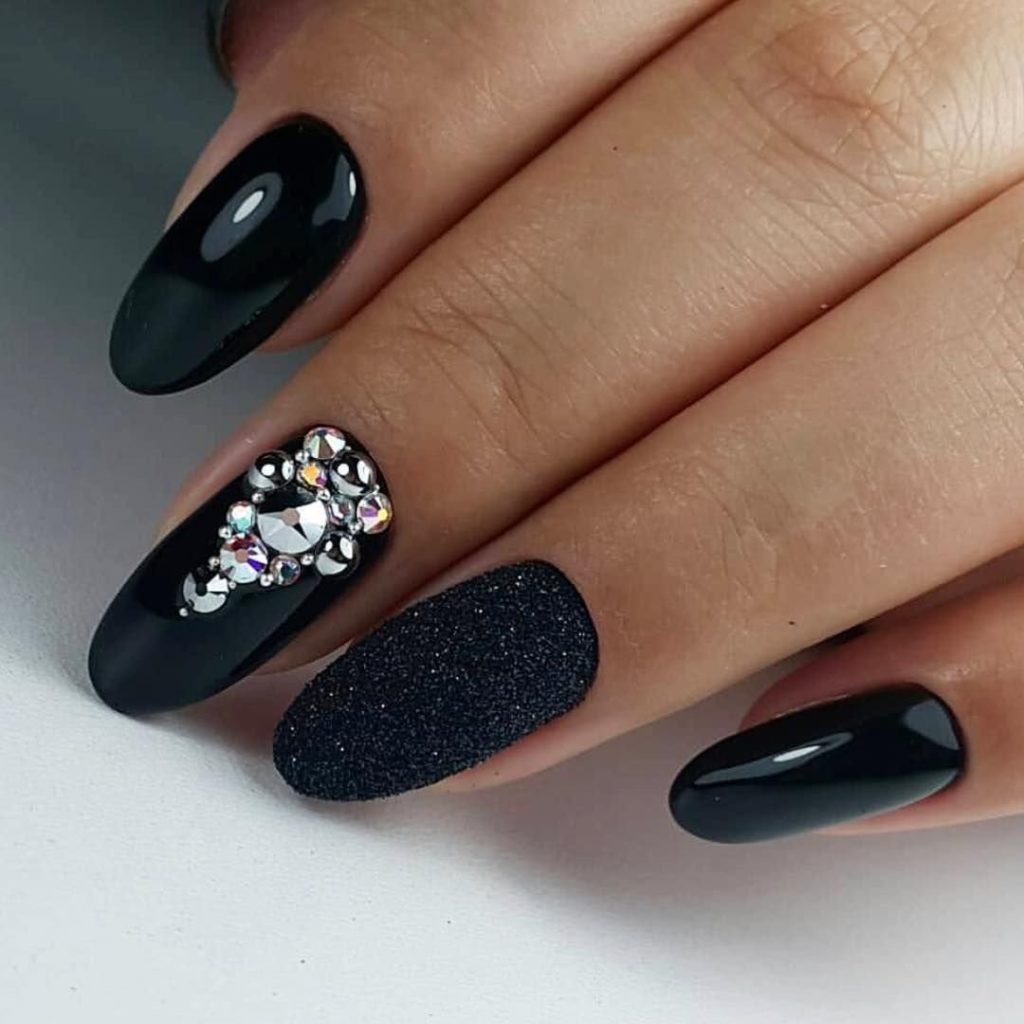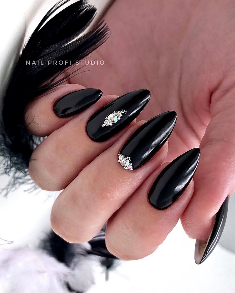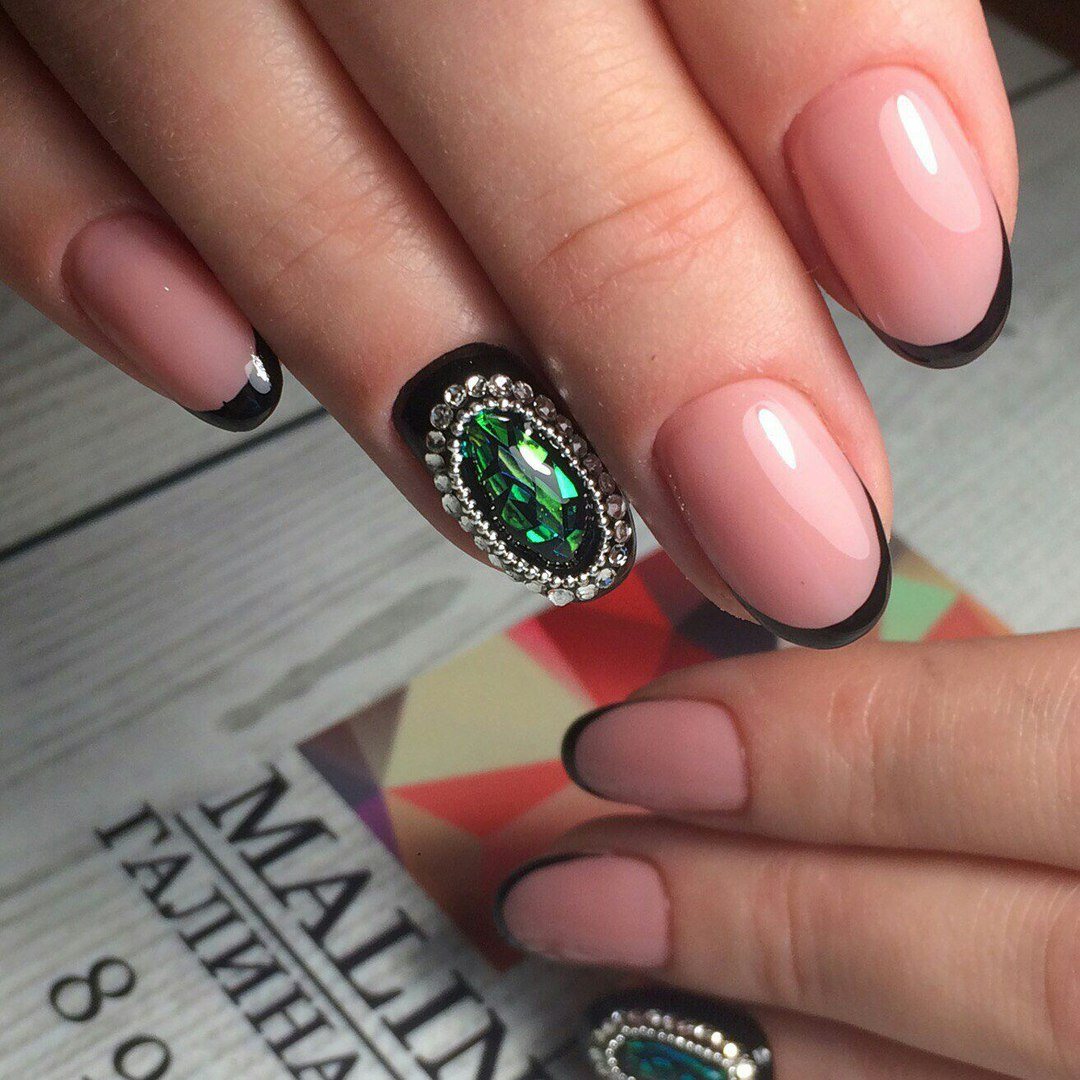 Стразы — удивительный вариант декора. С их помощью можно создать стильный маникюр или сделать безвкусный чрезмерный дизайн. Напомним — во всем хороша мера. Соблюдайте правило уместности. Хотя черная база очень терпима к размещению камней. Но в этом сезоне даже для черного маникюра в трендах стиль минимализм. Например, совместите лунный маникюр или френч со стразами — по одному камню в центре каждого ногтя или тонкая дорожка камней.