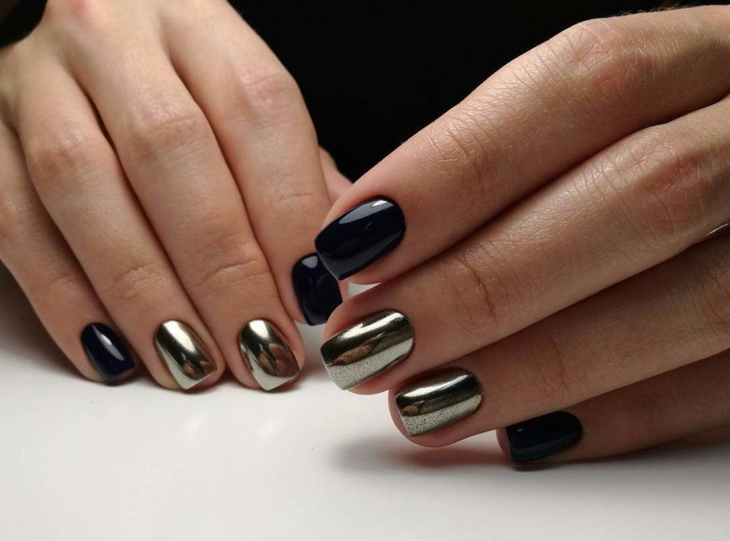 С помощью втирки мастера добиваются удивительного эффекта. На ногтях удается создать зеркально ровную поверхность. Обратите внимание на сравнительно новый материал для подобного дизайна. Это хром пудра. Ее втирать в ногтевую пластину, и создается эффект хромирования. База уже не будет такой черной. Но такой маникюр можно будет вписать в модный современный образ, в котором присутствуют актуальные сейчас серебристые детали — обувь, часы и другие аксессуары.