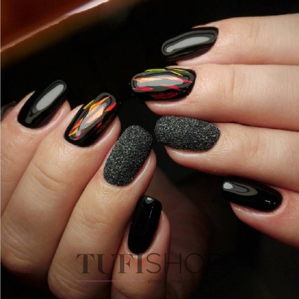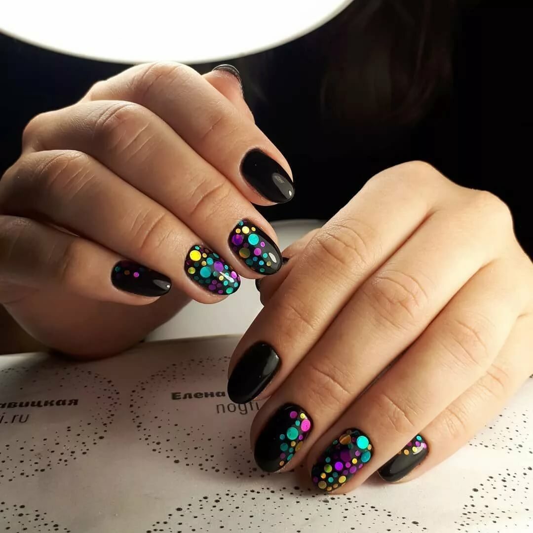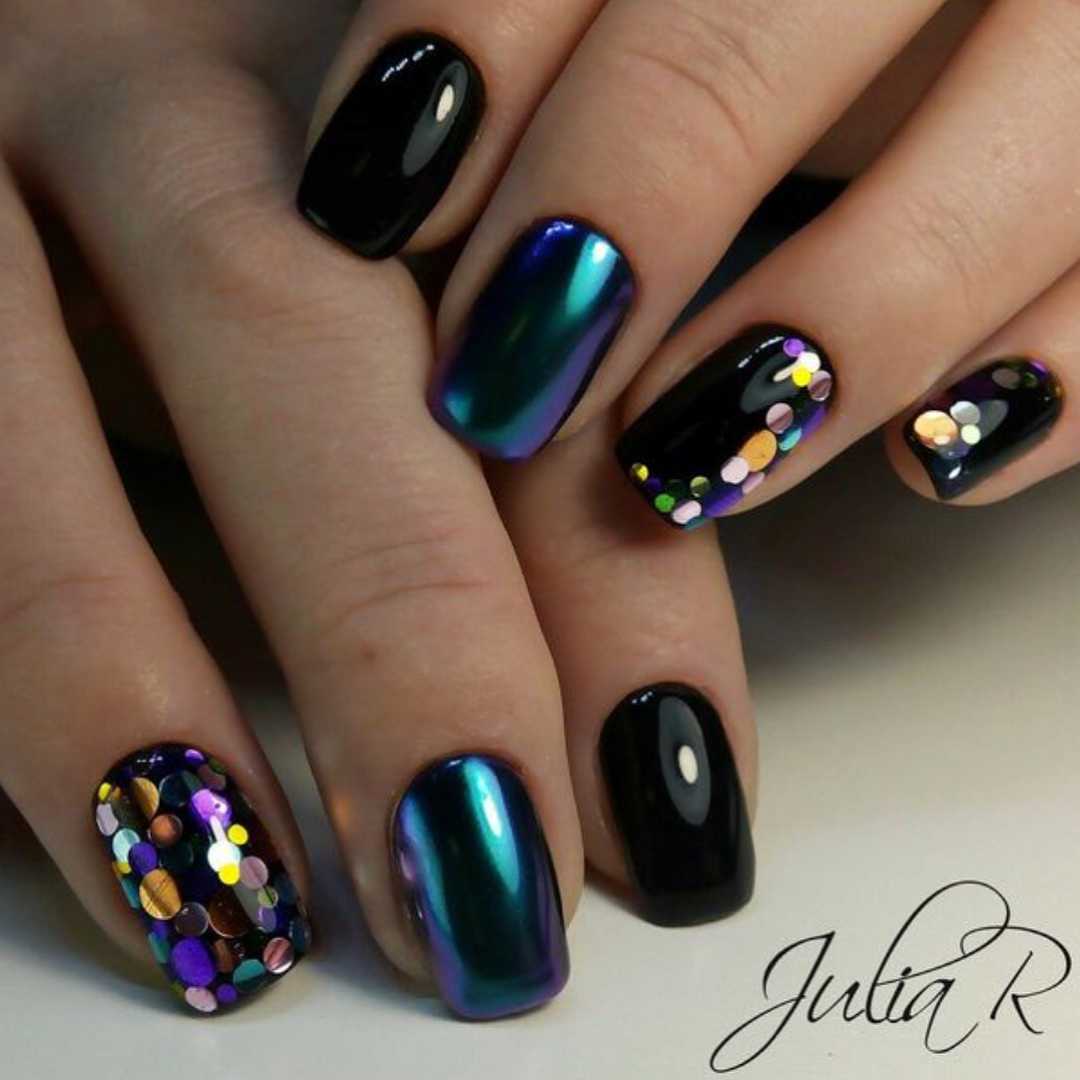 Эти забавные блестки разных размеров и фактур покорили сердца модниц по всему миру. Как только яркий свет попадает на ноготки с камифубуки, они начинает играть яркими красками. Черный маникюр универсален. Для него можно выбрать блестки в самых разных оттенков.