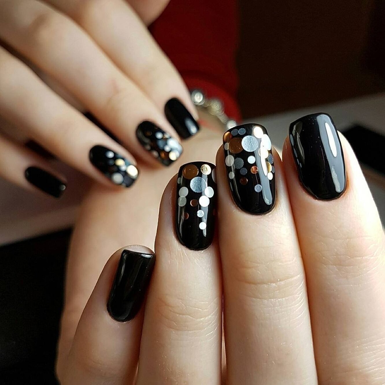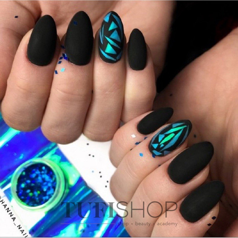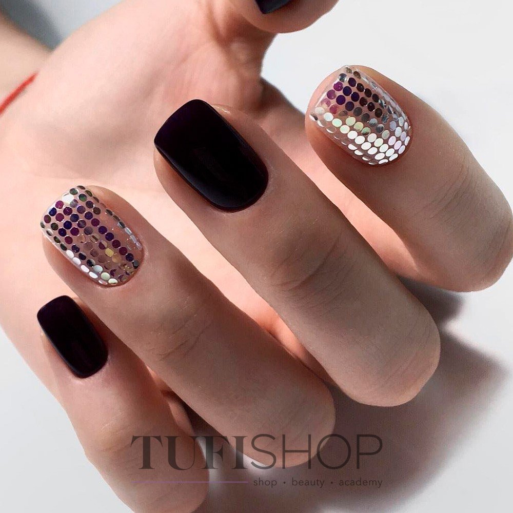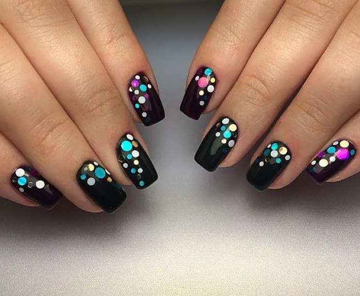 Эти забавные блестки разных размеров и фактур покорили сердца модниц по всему миру. Как только яркий свет попадает на ноготки с камифубуки, они начинает играть яркими красками. Черный маникюр универсален. Для него можно выбрать блестки в самых разных оттенков.
