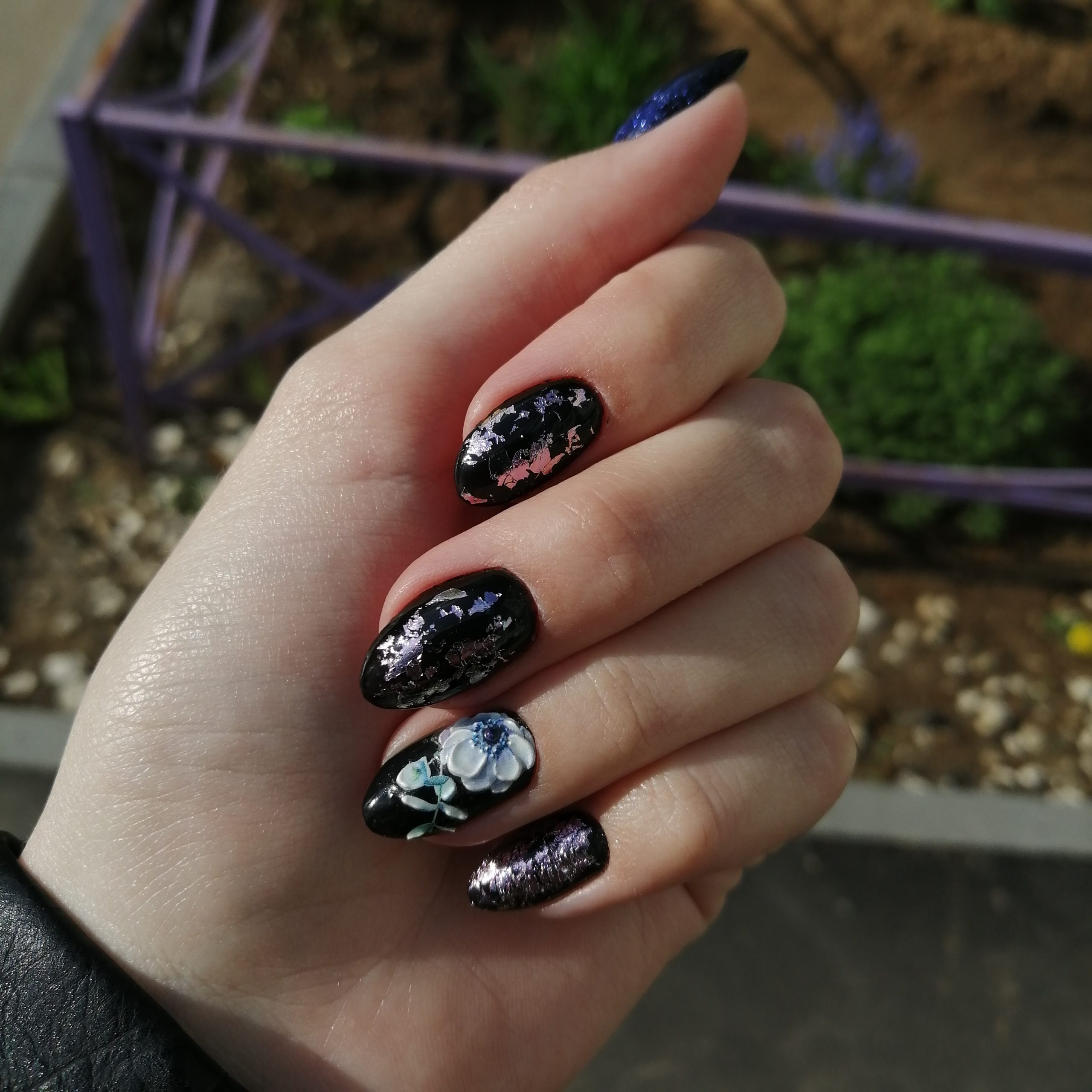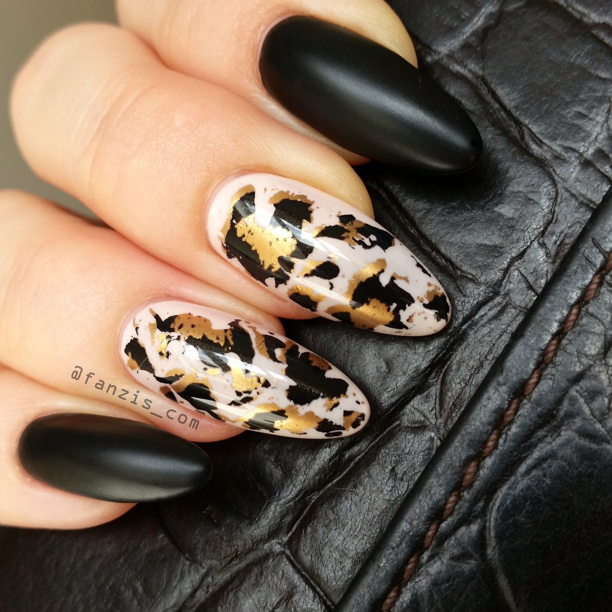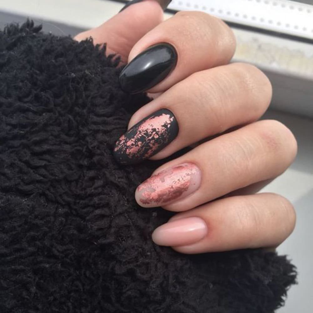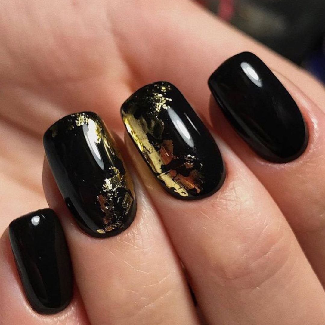 Фольга, наверное, один из самых простых и интересных современных материалов. С ее помощью можно создать небрежный состаренный эффект, сделать блестящую подложку под рисунок или оформить краешек ногтя. В любом случае маникюр вы сможете сделать самостоятельно. Ведь работать с фольгированным материалом просто — чем небрежнее вы выложите его на пластине, тем уникальнее будет дизайн. Не стоит говорить, что особенно эффектно фольга смотрится именно на черной базе.