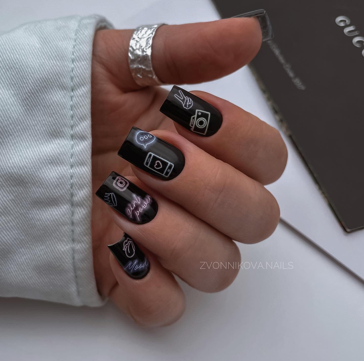 Средняя и большая длина предоставляют модницы широкое поле для создания стильного черного маникюра. Здесь можно выбирать практически любой вариант дизайна, сочетать различные техники и не бояться, что пальчики будут выглядеть короткими и толстыми. На что важно обратить внимание: