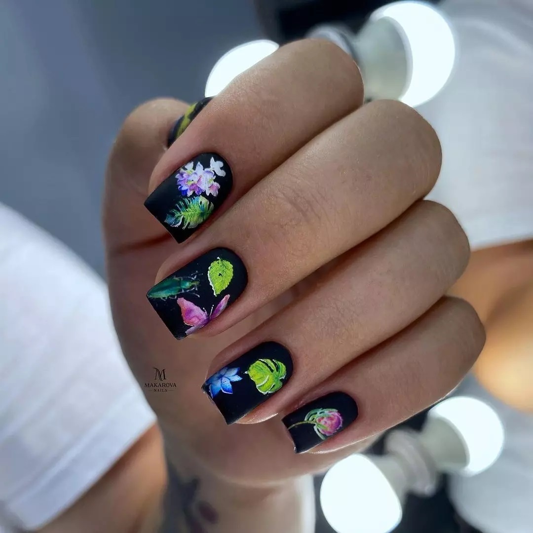 Какие рисунки в этом сезоне актуальны? Это как и прежде всевозможные сердечки, милые зверята, бабочки и другие насекомые, пальмы, растительная тематика. Особенно эффектно на черном фоне смотрится цветочный маникюр — от больших многослойных роз с эффектом 3д до мелких множественных цветочков, имитирующих расцветку набивного ситца. Никаких ограничений нет, вы можете выбрать тот рисунок, который вам особенно по душе.