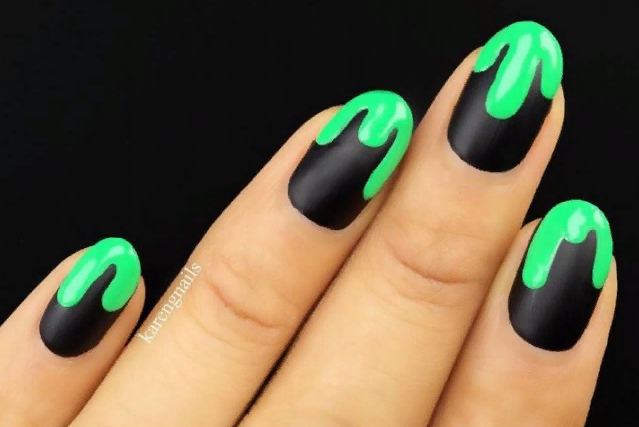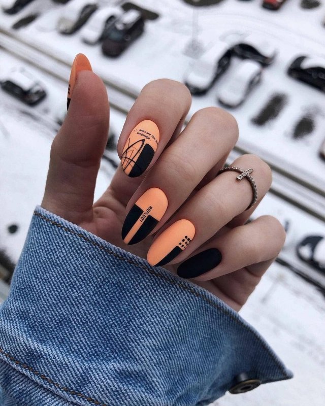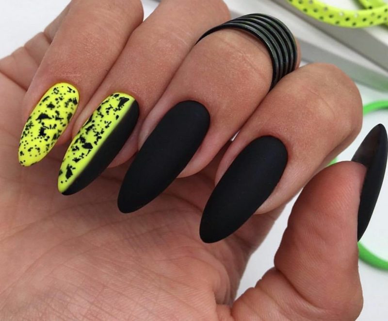 Глянцевые неоновые оттенки дарят чёрному маникюру новую жизнь, делая его весёлым и ярким. Хорошо подойдут любые цвета, особенно в виде геометрии или тонких прямых линий.