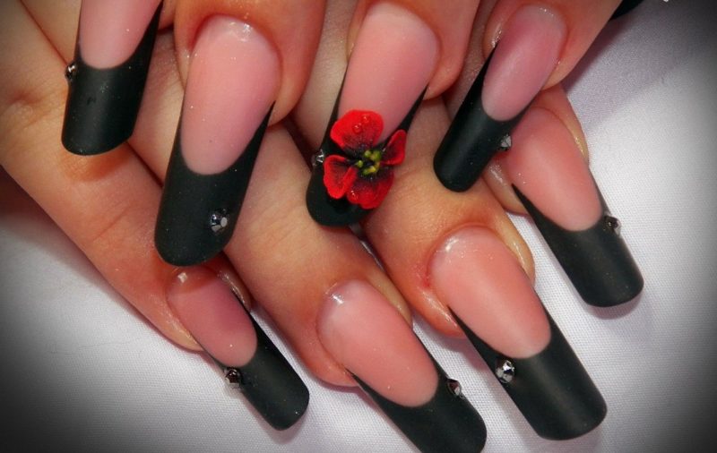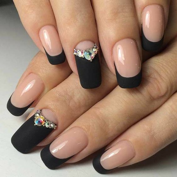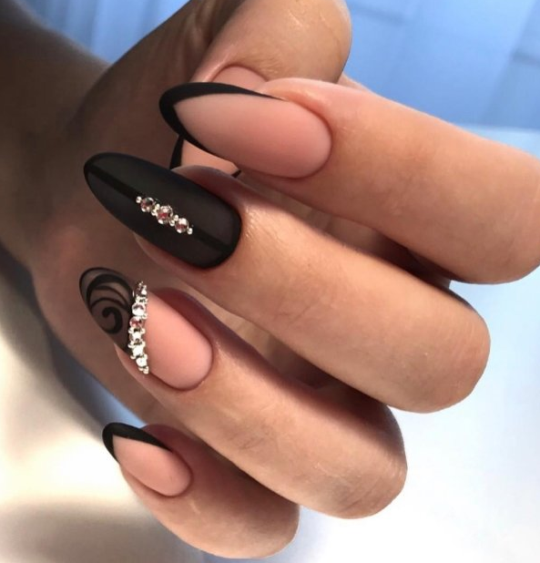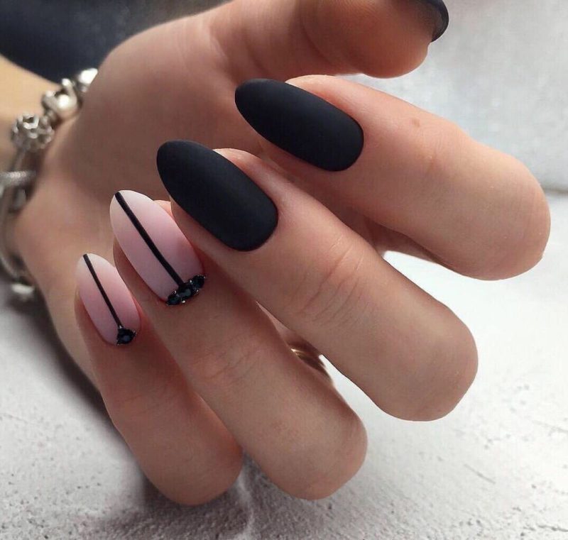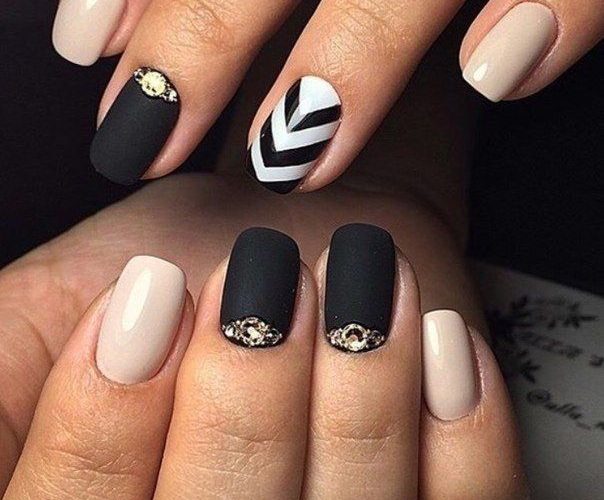 Очень женственно выглядит маникюр, в котором три ногтя полностью окрашены в чёрный цвет и покрыты матовым топом, а на два оставшихся нанесён светлый лак с чёрной линией френча. Можно добавить женственности, украсив основание пластины стразами.