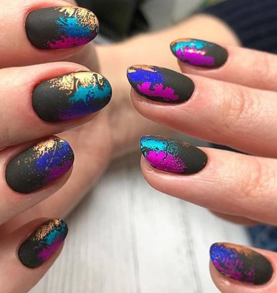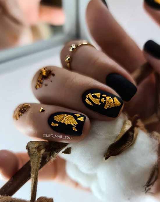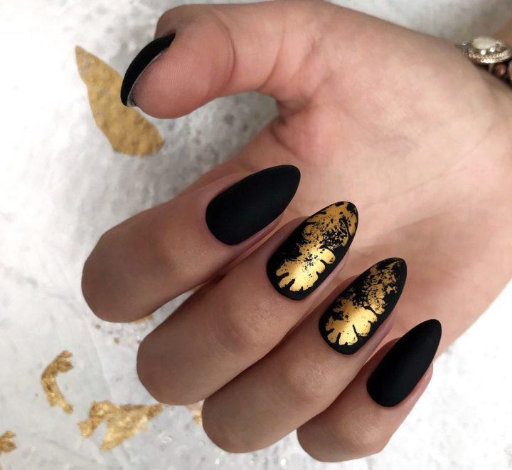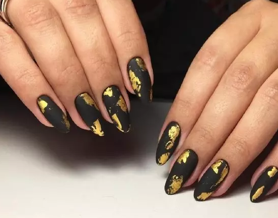 Фольга в этом сезоне актуальна, как никогда. А сочетание золотистых блестящих участков ногтя с матовой тёмной основой выглядит дорого и роскошно. Фольгу стоит приклеивать хаотично – абстрактные узоры, которые получатся при таком подходе, помогут создать эстетичный и оригинальный дизайн.