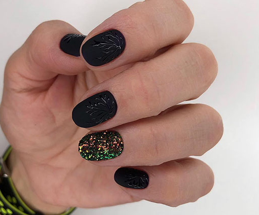 Матовый тёмно-зелёный гель лак прекрасно сочетается с чёрным. Лучше всего создать плавный переход одного цвета в другой. А вот для создания рисунков, мелких элементов дизайна и узоров лучше подойдёт более светлый оттенок зелёного цвета.