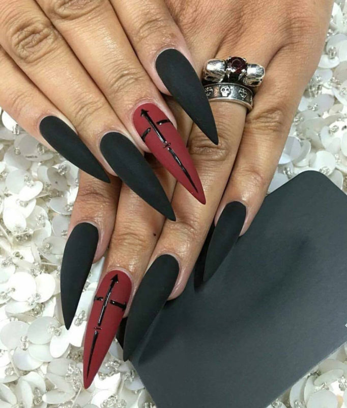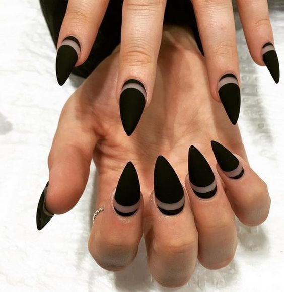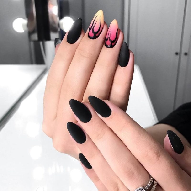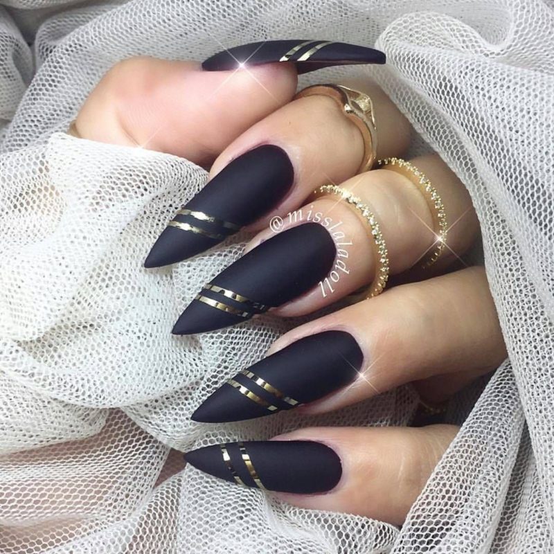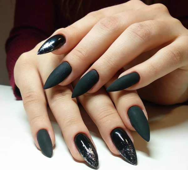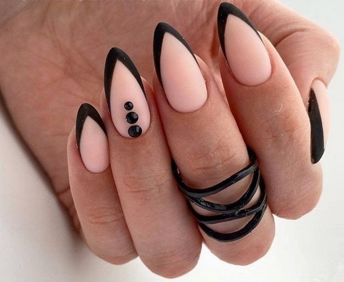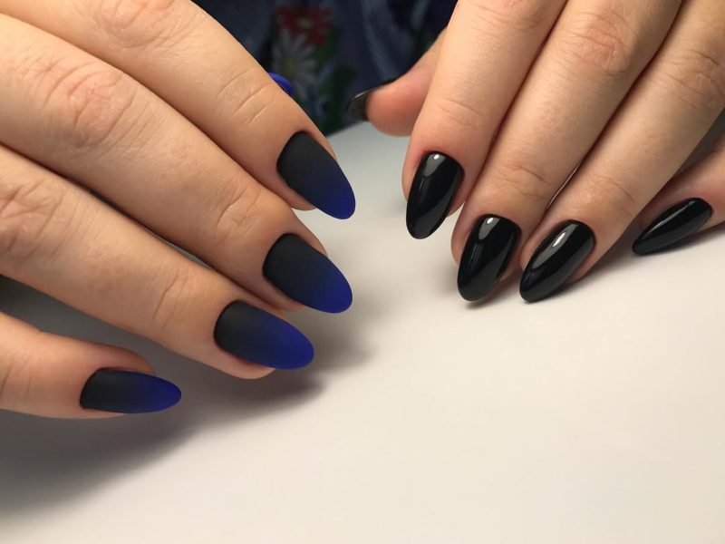 Лучше всего на заострённых ноготках будет смотреться матовый градиент, сочетающий чёрный цвет с ярким – например, красным или синим. Так же эффектно смотрится однотонный френч, в котором полоска выполняется так же чёрным цветом, но с использованием глянцевого лака.