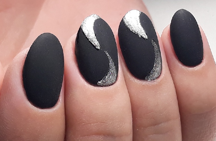 В случае, когда основой становится чёрный матовый маникюр, наиболее роскошно смотрится выделение лунки серебристым или золотистым лаком, возможно даже использование фольги.