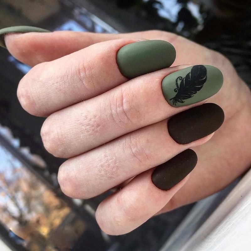Маникюр зелёный матовый с чёрным