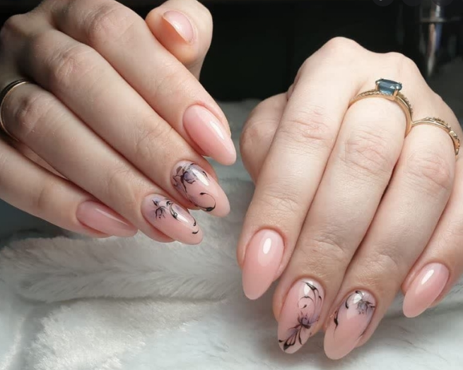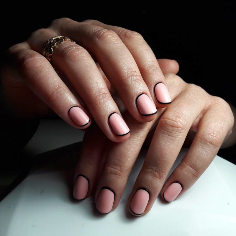- Все ногти в нежном тоне, и на один ноготь на каждой руке наносится черный рисунок или рисуется черная дуга снизу.