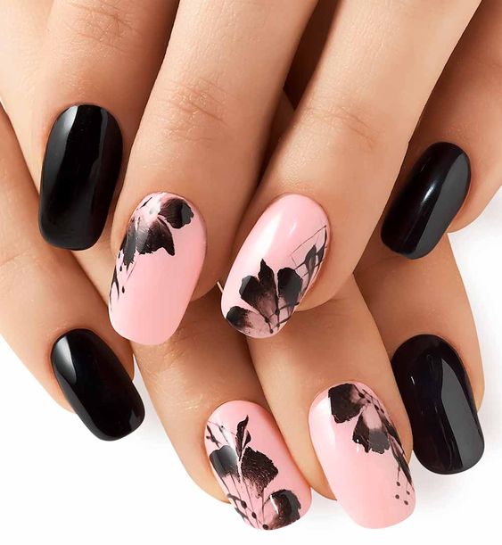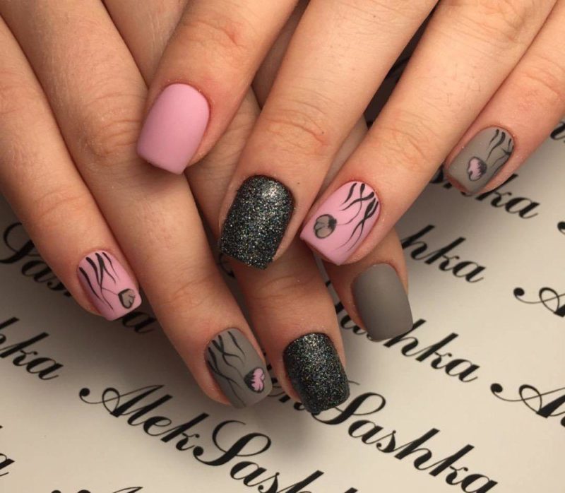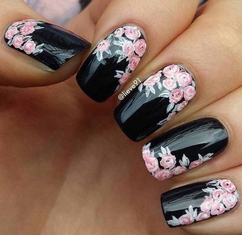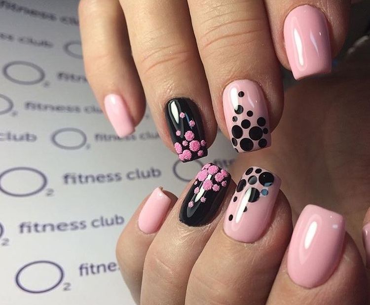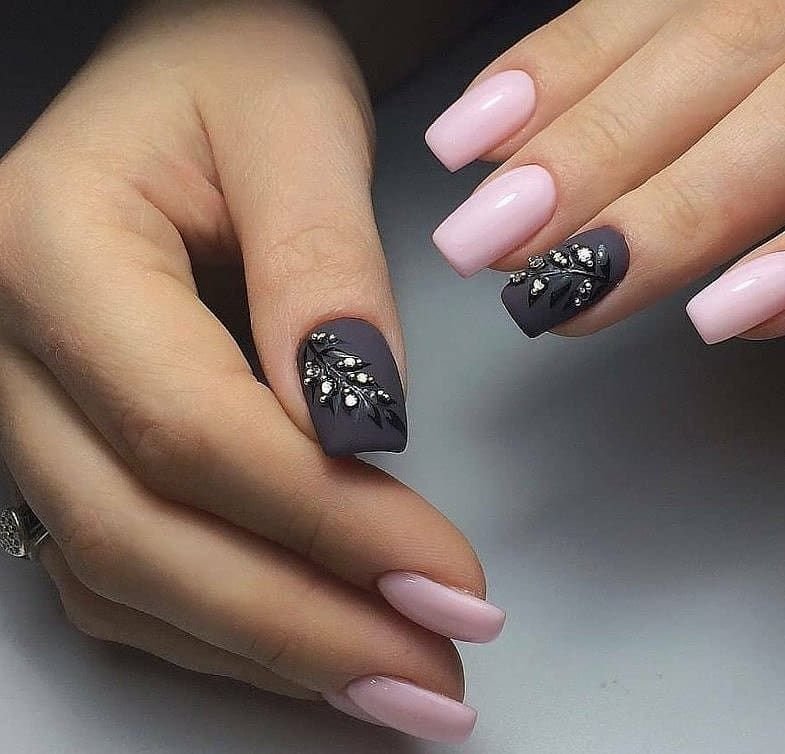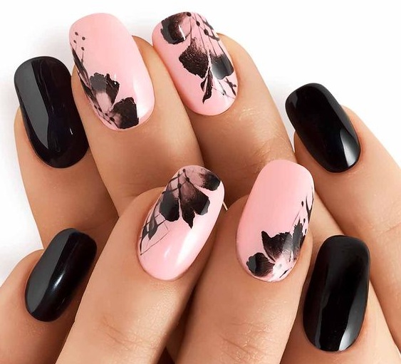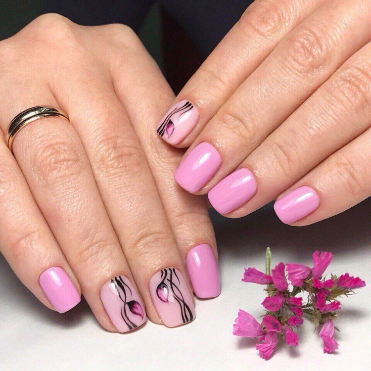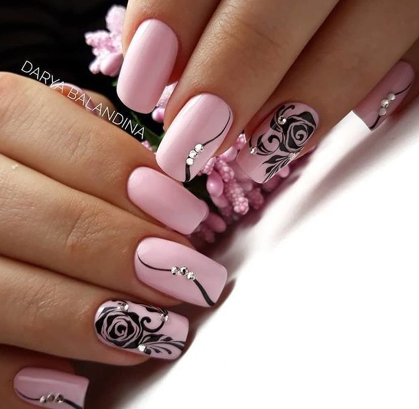 На розовый оттенок наносятся цветы, они очень гармонично выглядят на такой нежной основе. Например, хорошо смотрится черный маникюр с серым и розовым дизайном.