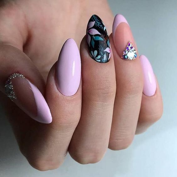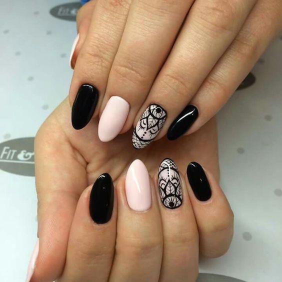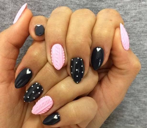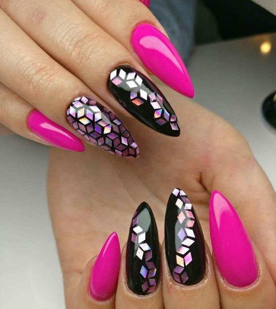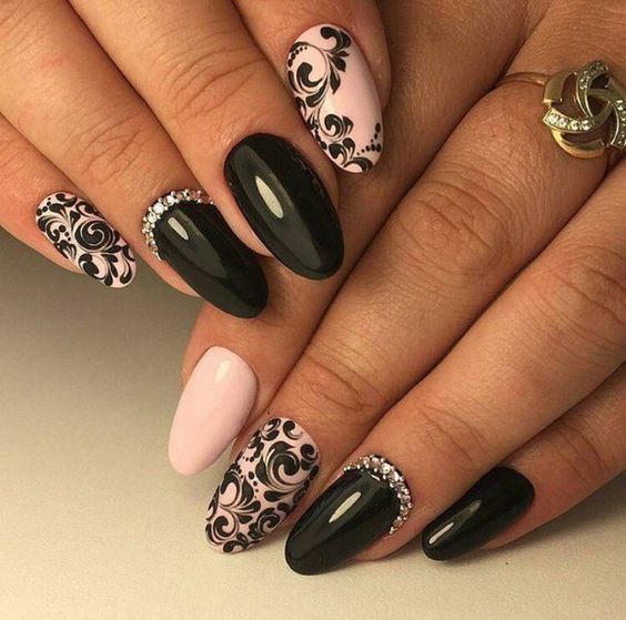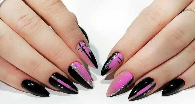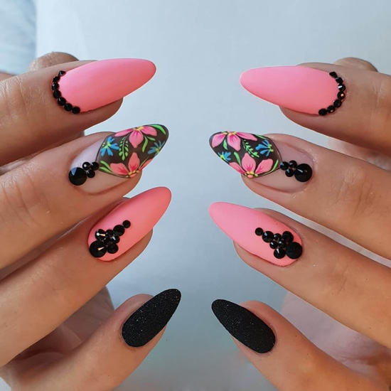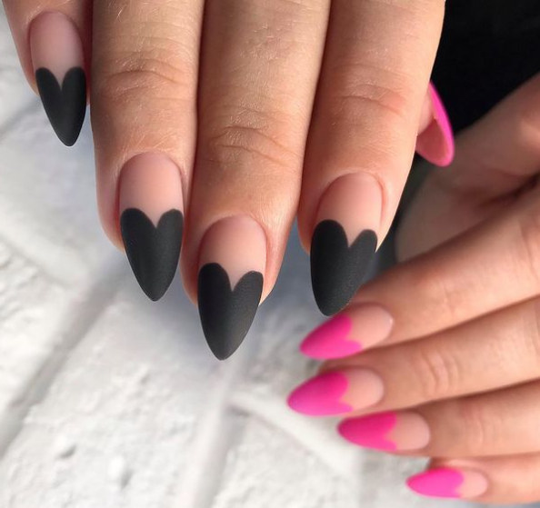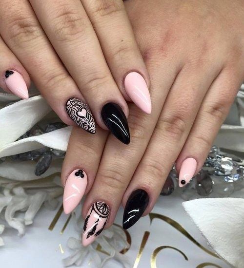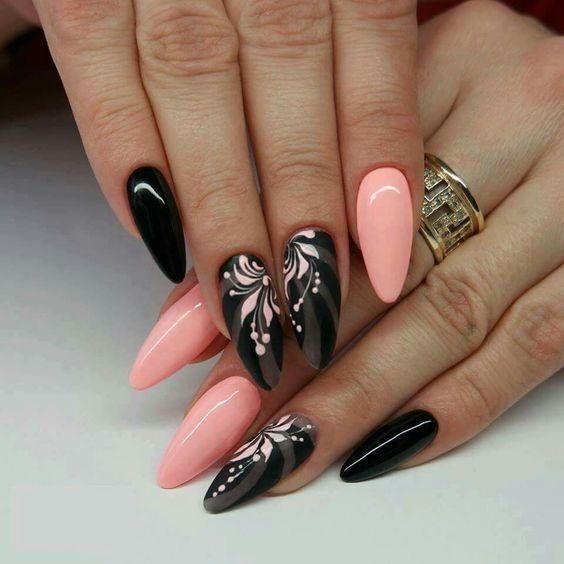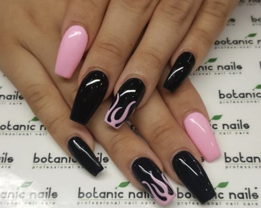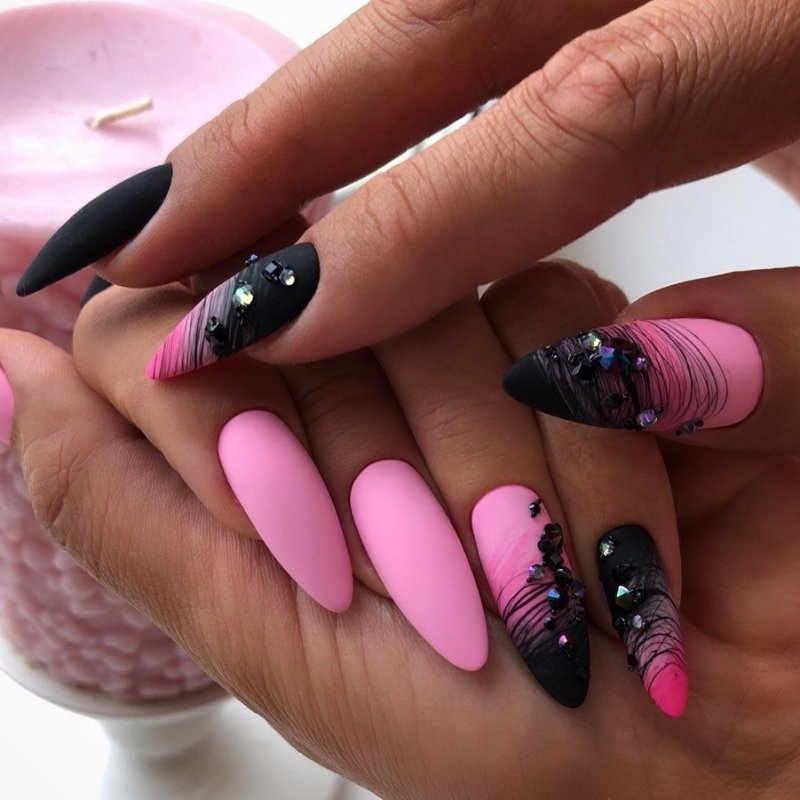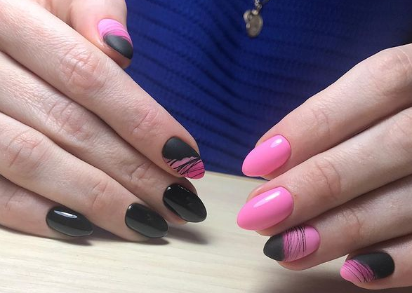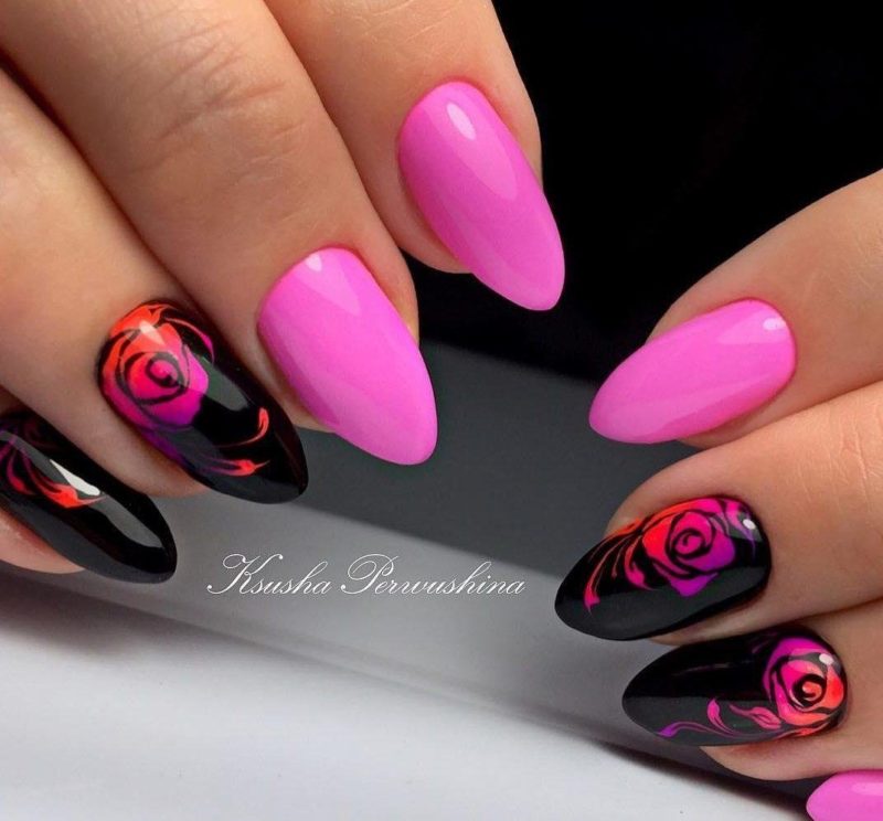 Использование яркого черного и розового лака поможет подчеркнуть форму ногтей. Такой дизайн может передать романтический нрав модницы. Такой маникюр может быть не уместен для работы в офисе, но на вечерних мероприятиях будет смотреться отлично.