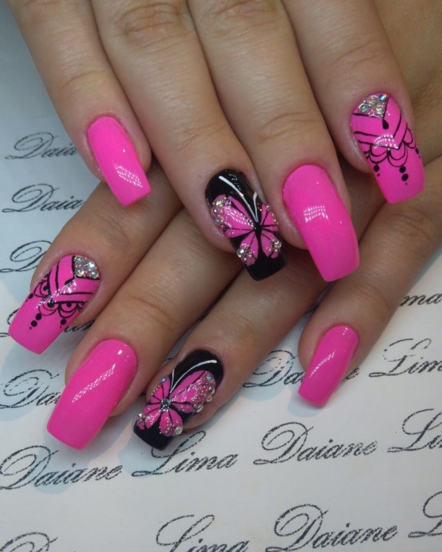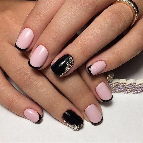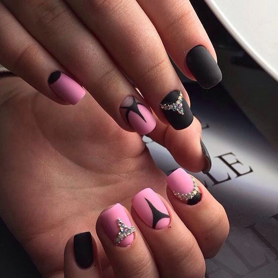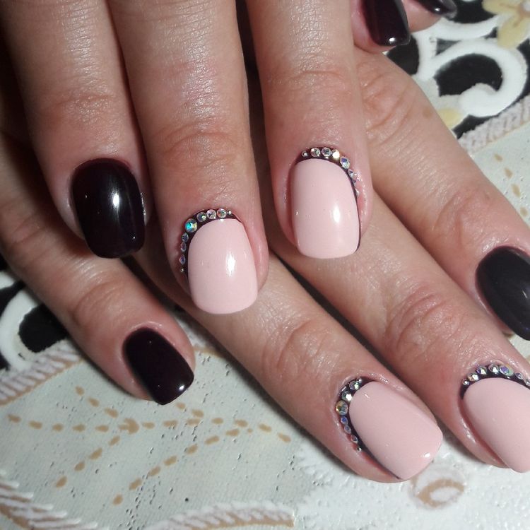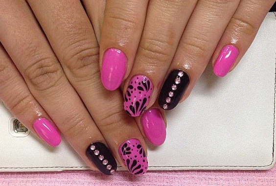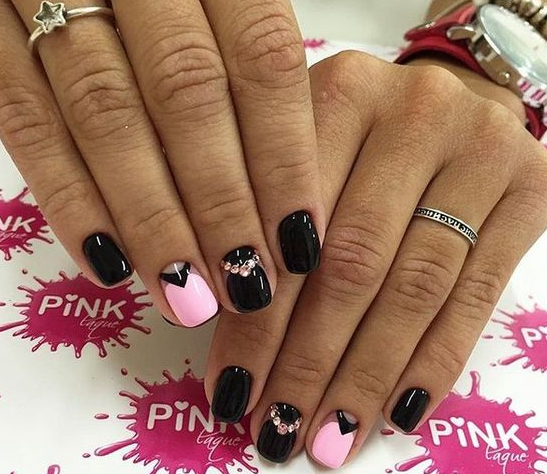 Использование страз сделает более привлекательным черно-розовый маникюр. Они не сделают его вызывающем, а дополнят шикарный образ.
