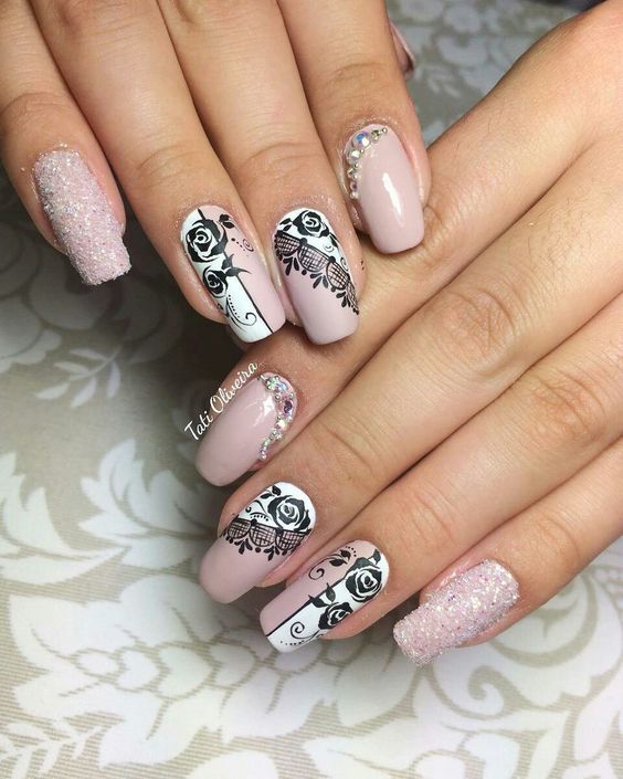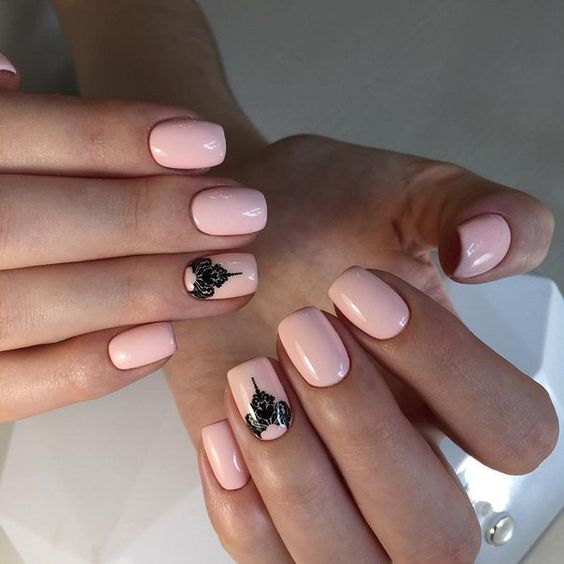 Цвет чайной розы является спокойным, успокаивающим цветов. В сочетании с черным создается деловой образ. Такой вариант подойдет на каждый день и в любое время года. Нежно розовый маникюр с черным рисунком подойдет к любому стилю одежды.