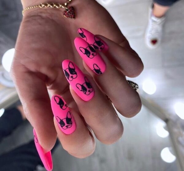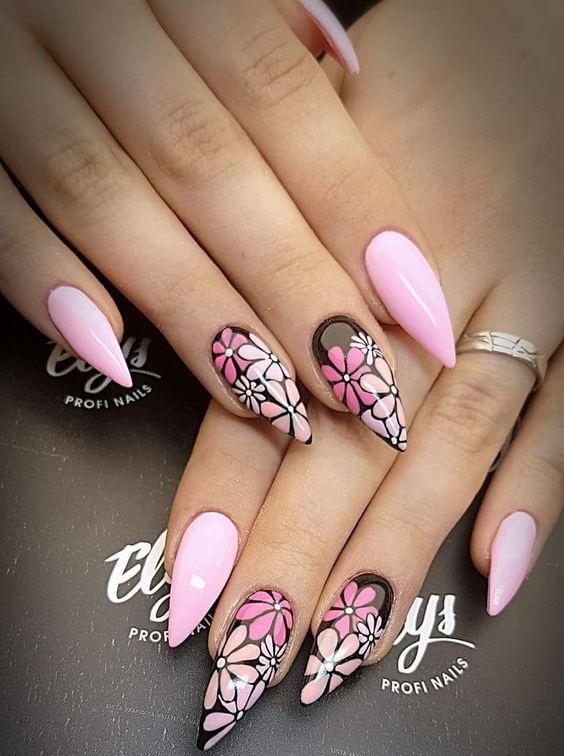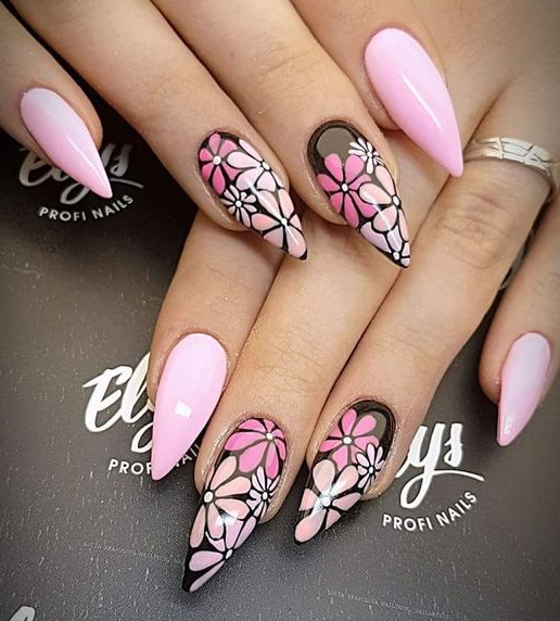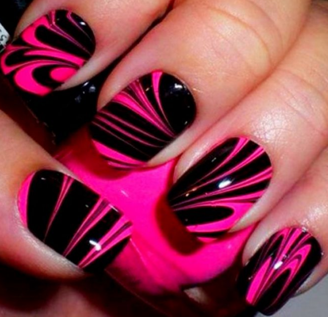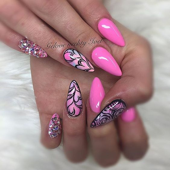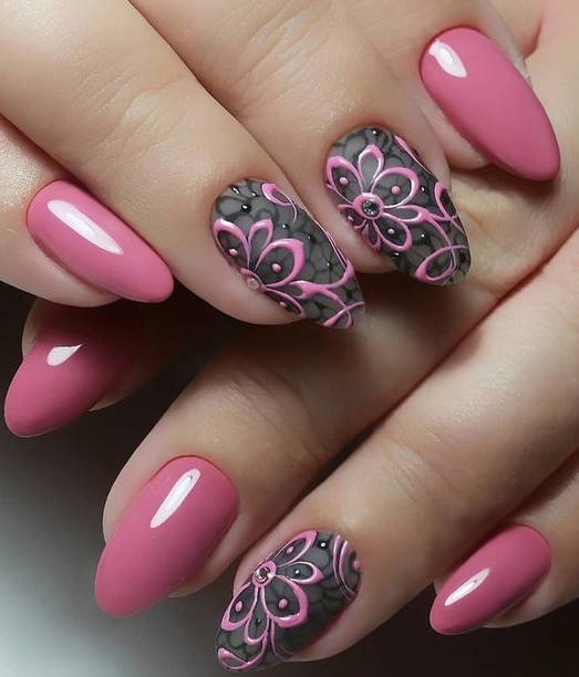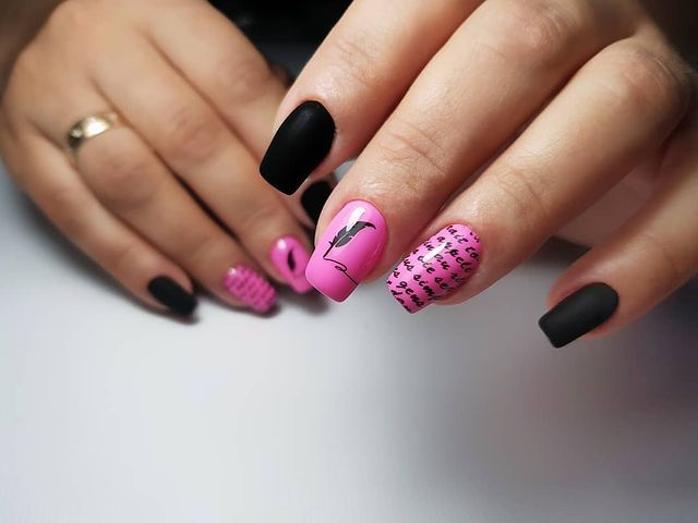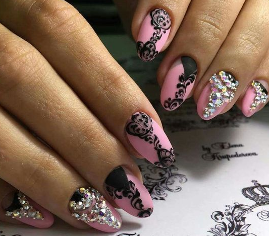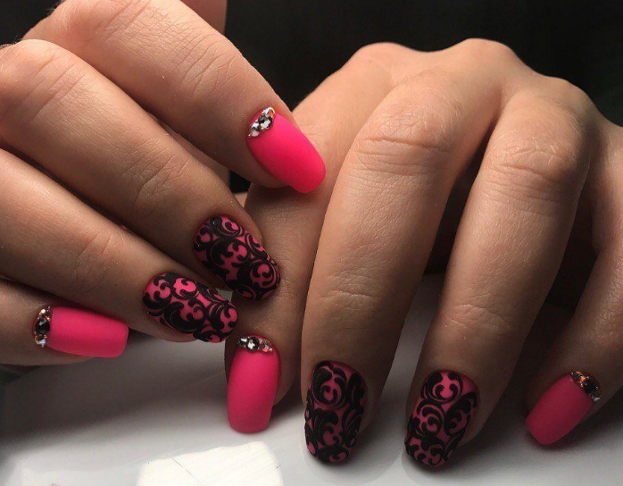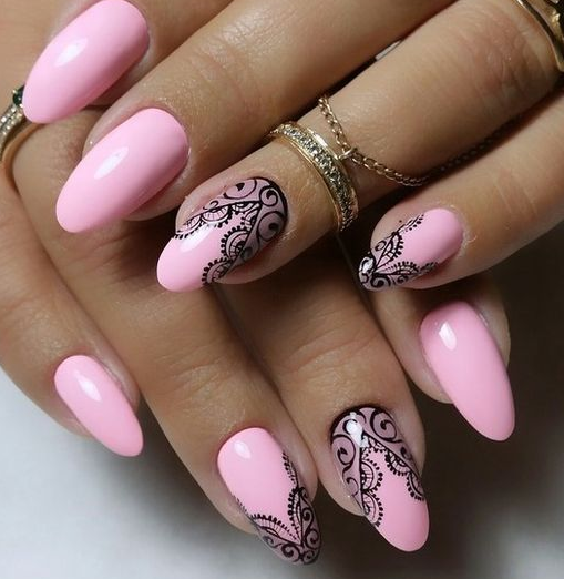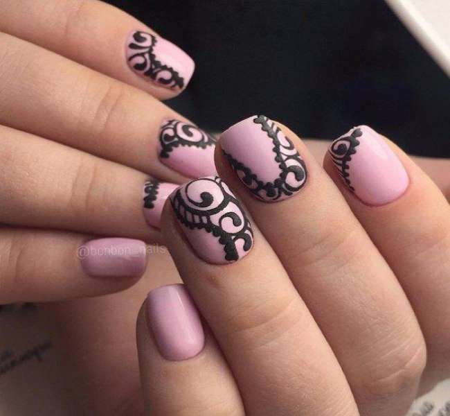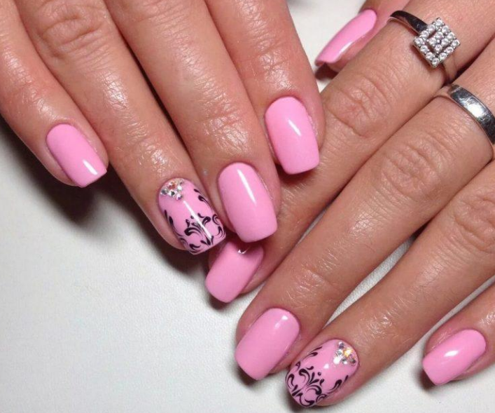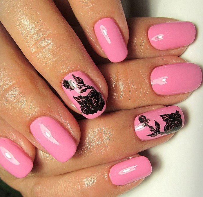 Глядя на фото, можно увидеть виды розового маникюра с черным рисунком.