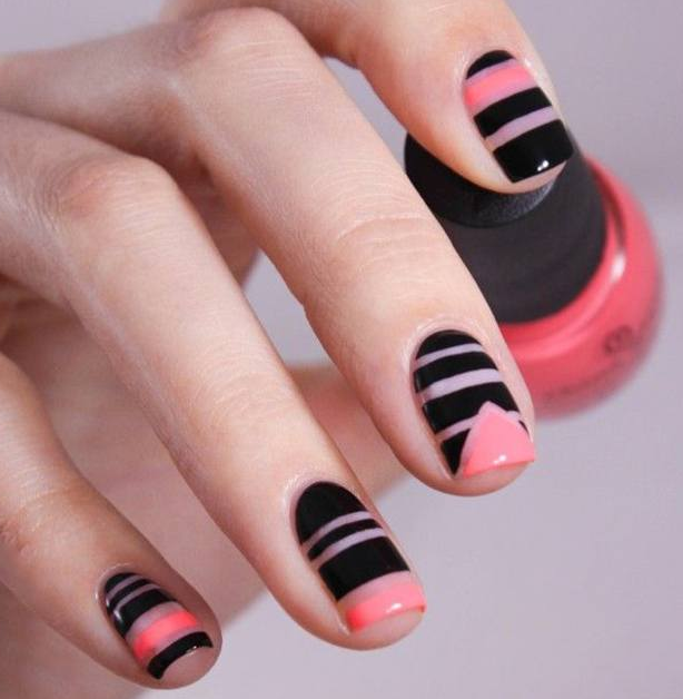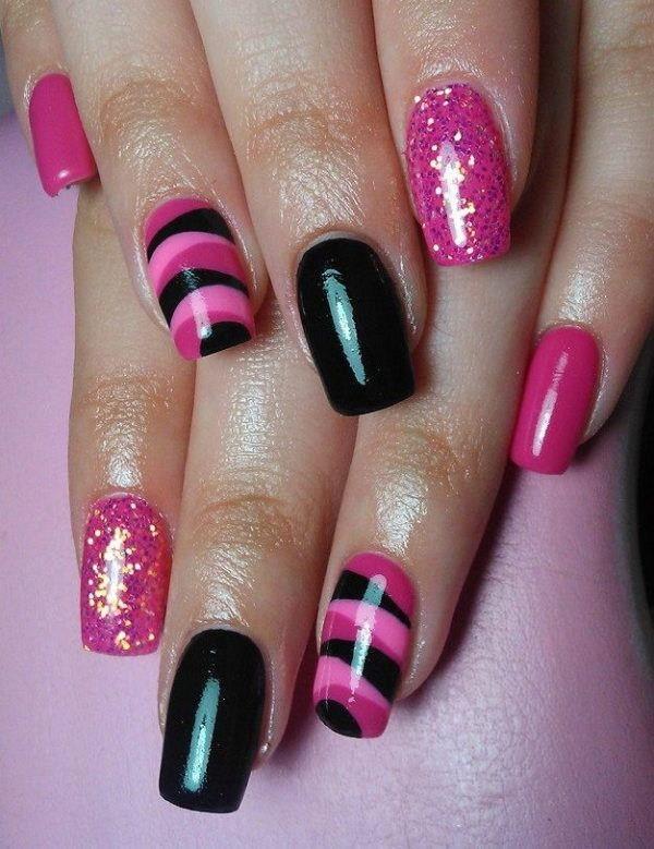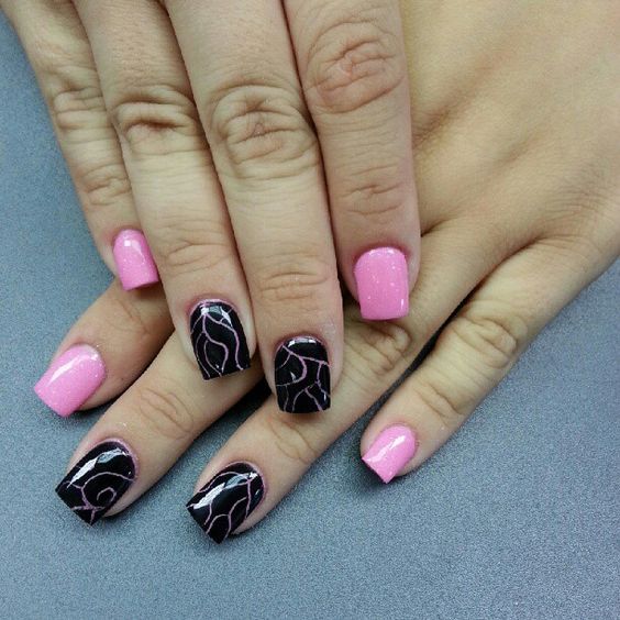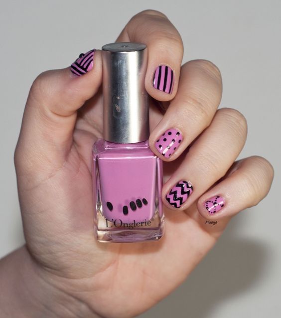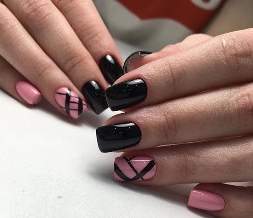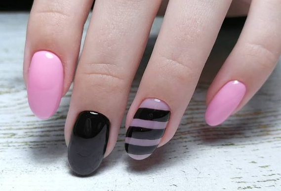 Такие розовые ногти с черным оформлением порадуют их обладательниц.