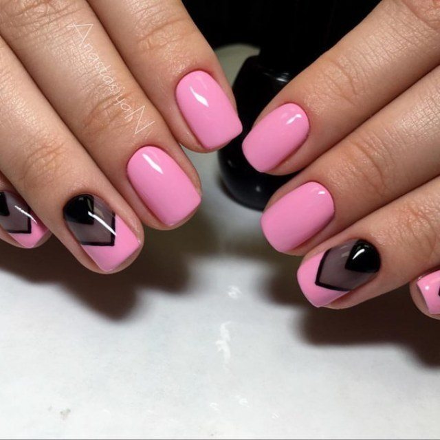 Черно-розовый маникюр на коротких ногтях создают эстетическое удовольствие. Этот вариант подходит тем, кто хочет привлекать внимание, но не желает быть вульгарной девушкой.