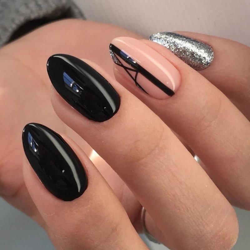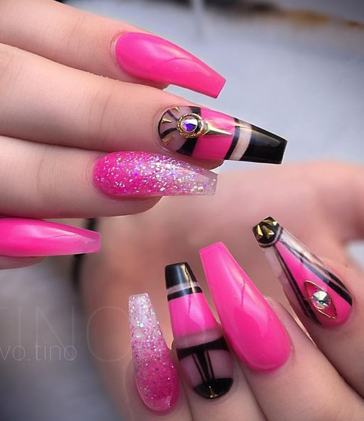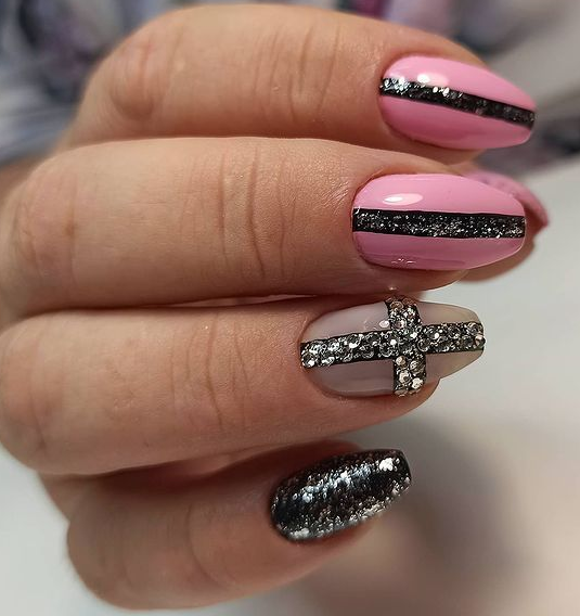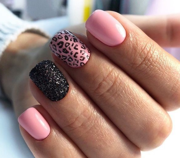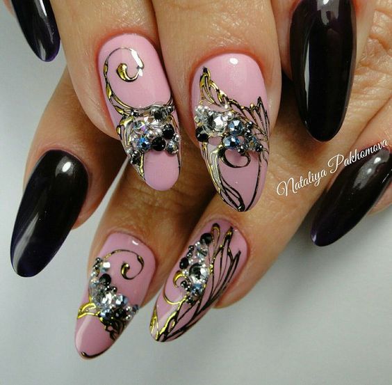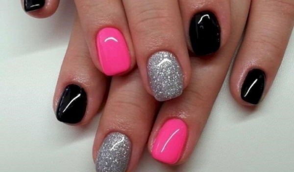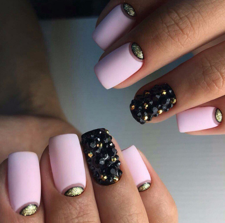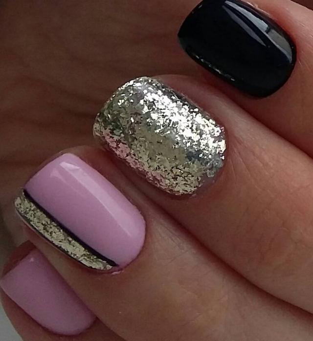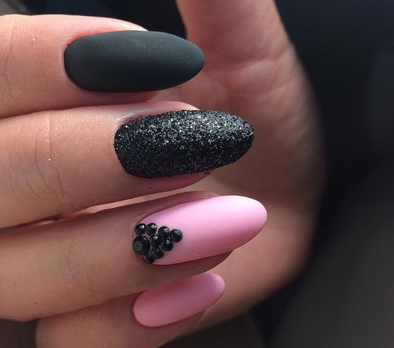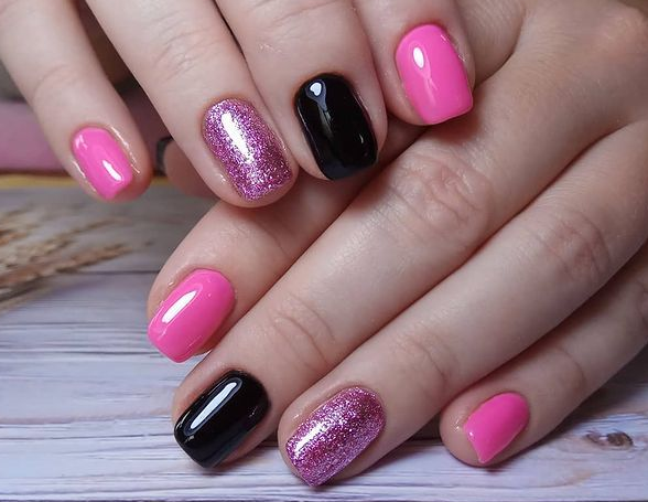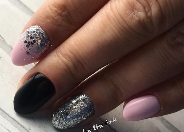 Популярным сочетанием считается розовый с черным и с блестками. Подойдут серебряные и золотые.
