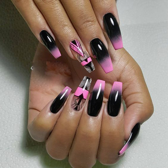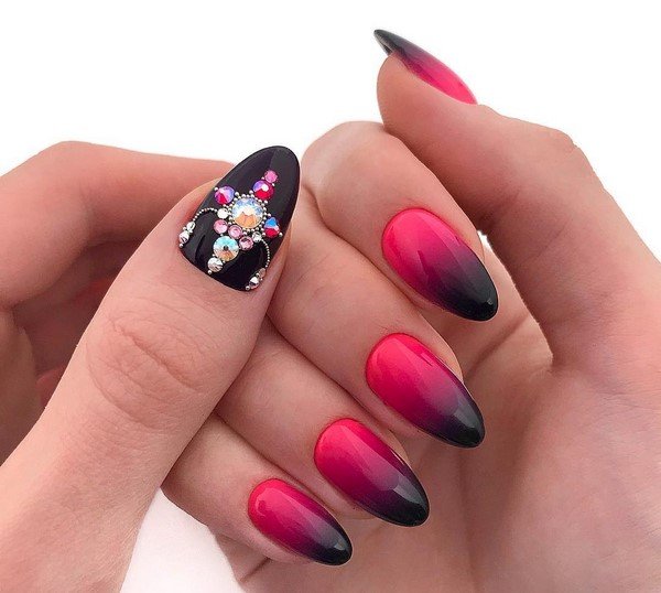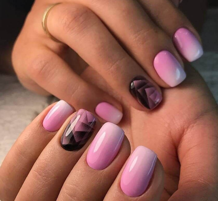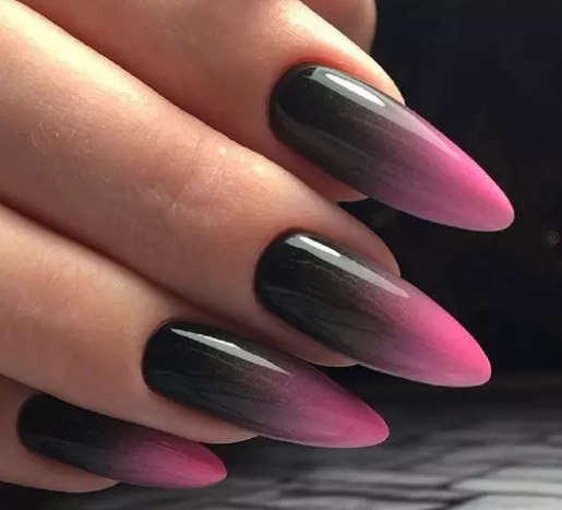 Омбре подразумевает плавный переход черного в розовый или наоборот. При желании может быть использован третий цвет. Такой вид может быть применен на длинных ногтях и на коротких.