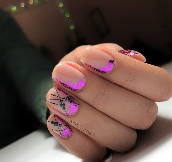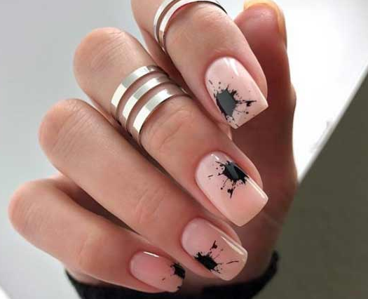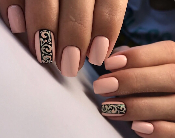 Оттенок пудры придает спокойствия маникюру. С черным тоном получается необычный дизайн. Пудровый цвет может стать хорошей базой для любого рисунка. Изображение наносится черным лаком. Такой дизайн ногтей подходит даже для работы и различных поводов.