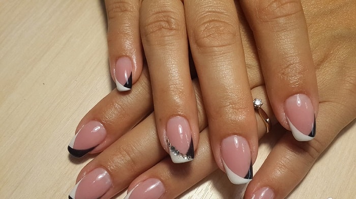 Оформление ногтей в технике френч представляет собой розовые ногти с окрашенным краем ногтя в черный цвет. Выглядит не хуже традиционного.