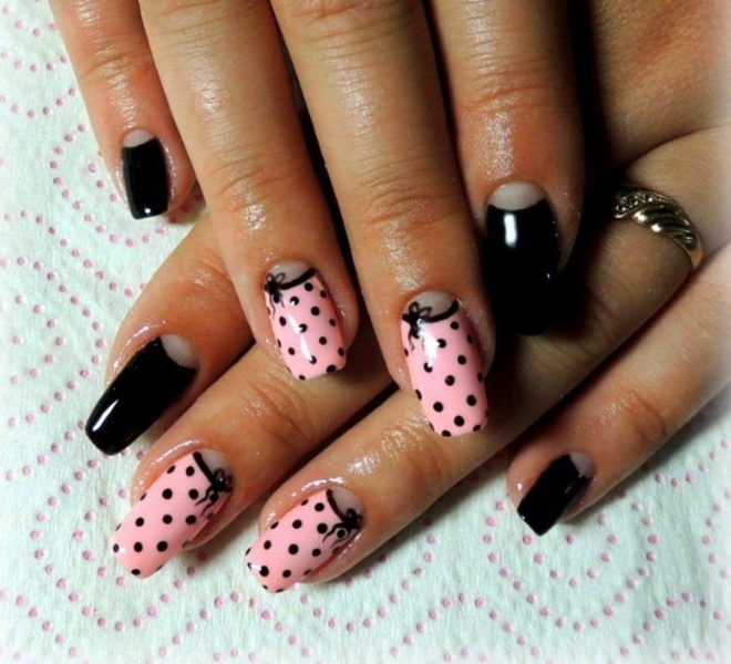 Гороховый принт не теряет актуальности. Можно использовать розовый как основу, а горошины сделать черными. Хорошо будут смотреться розовые горошины на черном покрытии.