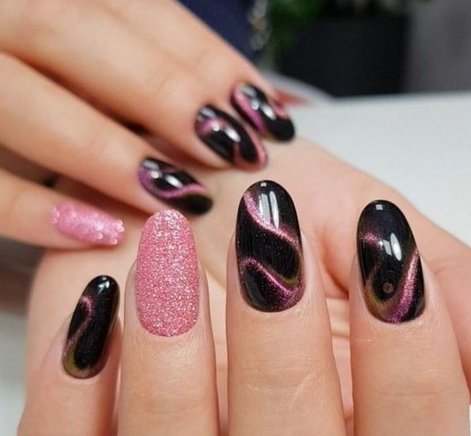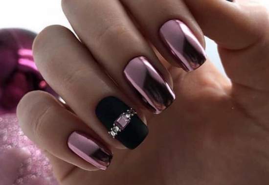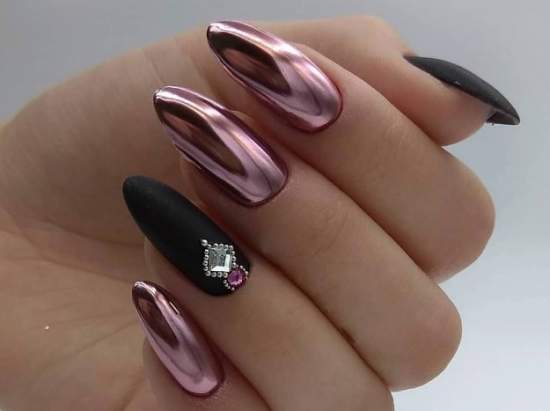 Маникюр с использованием черно-розовой втирки при завершении получается с необычным переливом. Такой дизайн может обойтись без лишних деталей, так как уже выглядит волшебно, блестит и переливается. Желающие могут украсить стразами в верхней части, но главное не навредить образу.