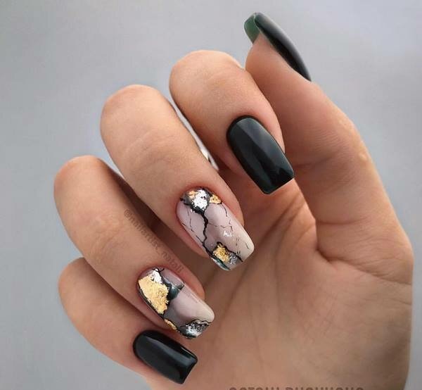 Для маникюра под драгоценные камни нужно подобрать основу. Подойдет розовый цвет. Далее на основу наносятся черные тонкие линии. Желаемый эффект достигается. Мраморные ногти радуют обладательницу и подойдут на любое мероприятие.