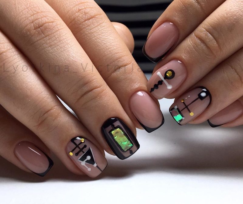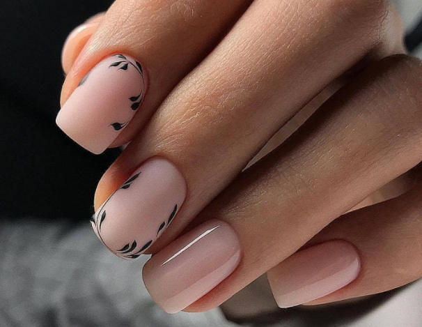 Ногти в нюдовом тоне становятся хорошей базой для творчества. Черный цвет идеально подходит для воплощения любых рисунков на нежной основе.