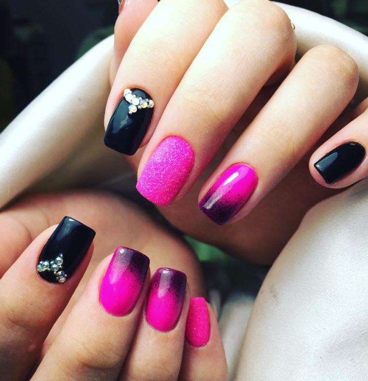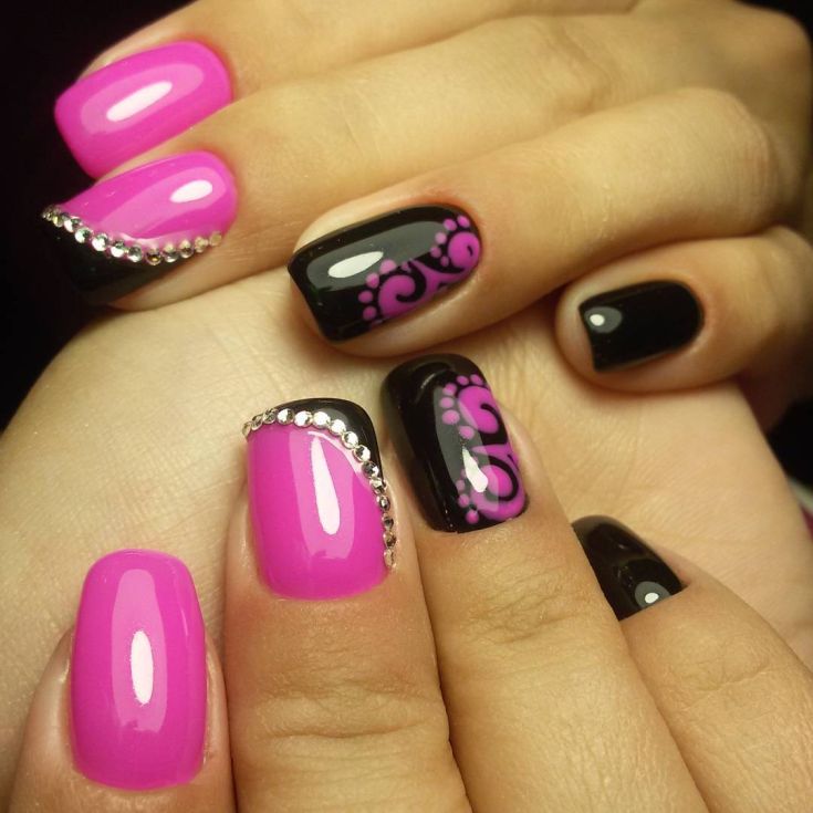 Насыщенный цвет фуксия в применении с черным создают невероятный дизайн. Оттенки оба сочные, дополнят друг друга и не портят. Можно использовать в качестве основы. А также популярен маникюр с черной верхней частью, переходящей в розовую.