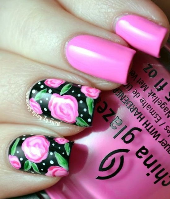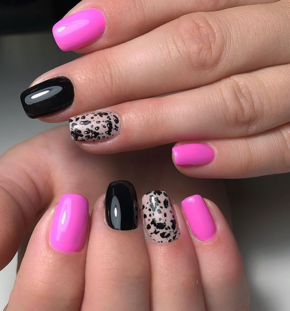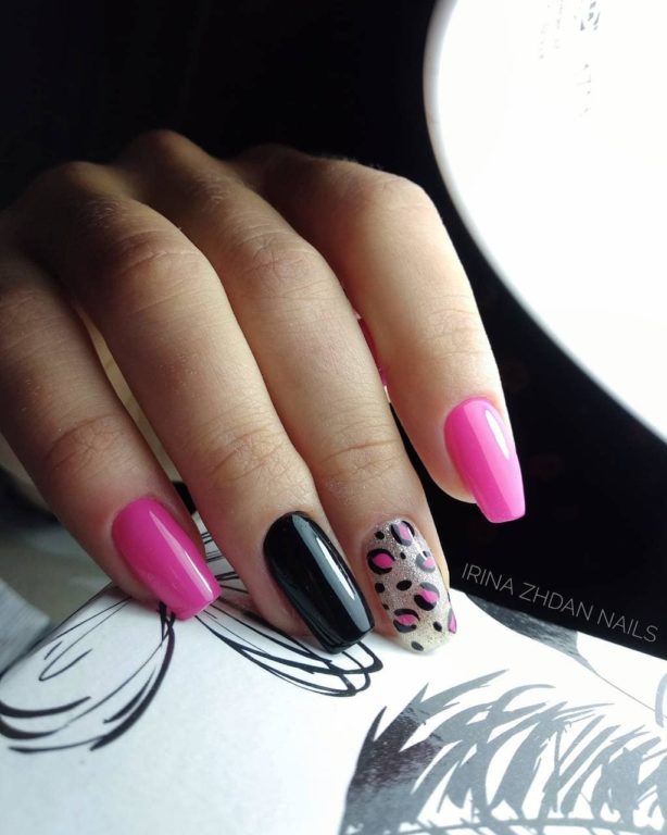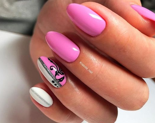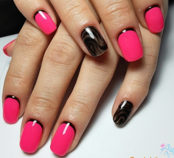 Маникюр с ярко-розовым цветом сразу же привлекает внимание. В сочетании с черным он играет совершенно по-разному. Эти цвета не конфликтуют, а дополняют друг друга. Оба подходят для основы и нанесения на них рисунка другого цвета. На розовом фоне отлично смотрится контур черного цвета. Получается ноготь яркого цвета, ограниченный черной линией. Также популярен маникюр с точками. На черную основу наносятся розовые точки. Можно использовать наоборот.