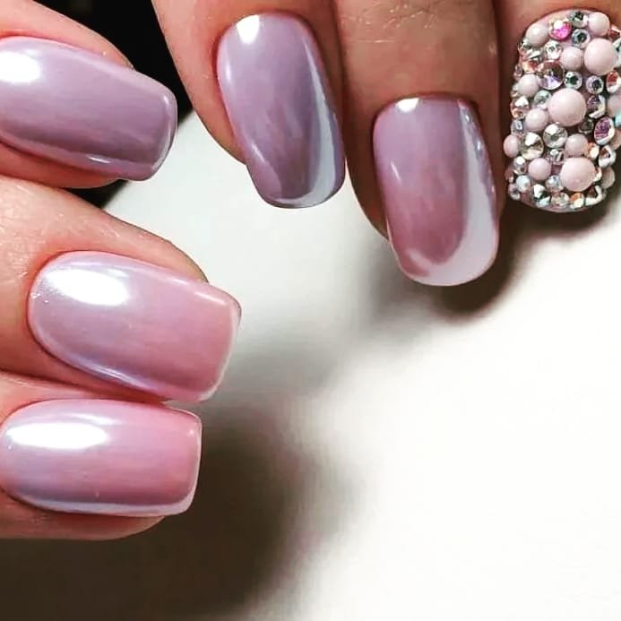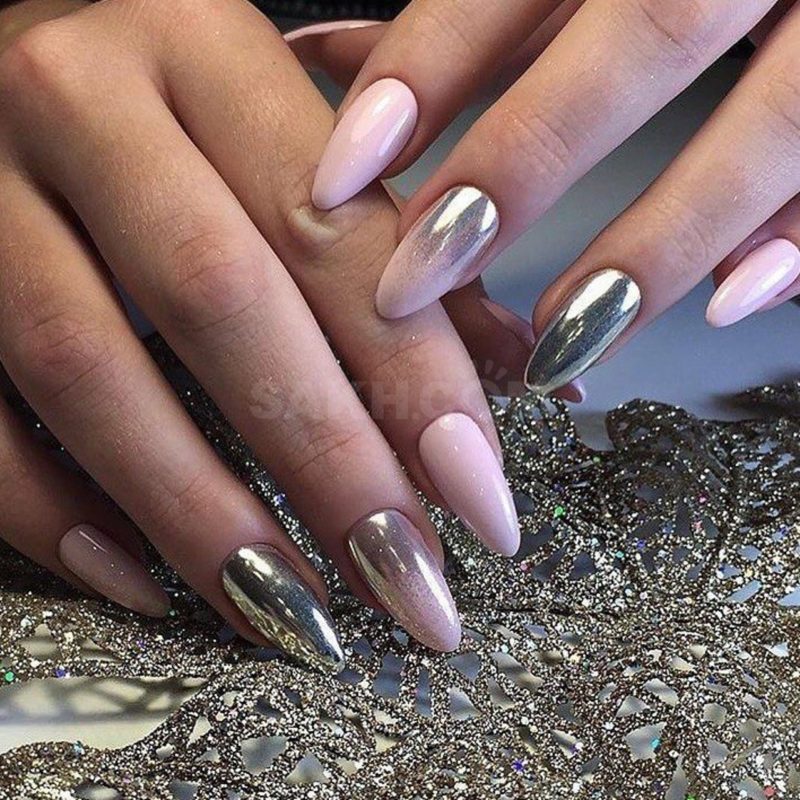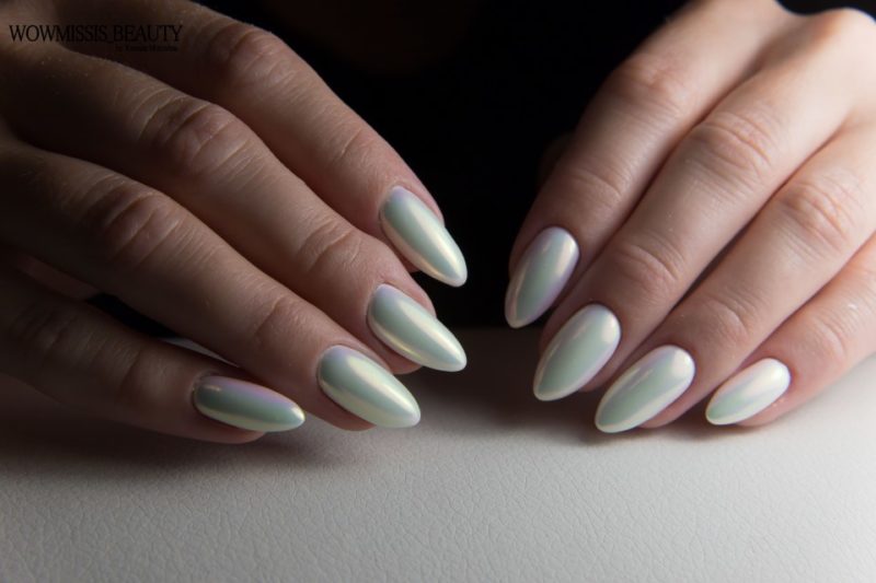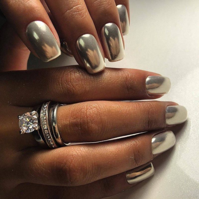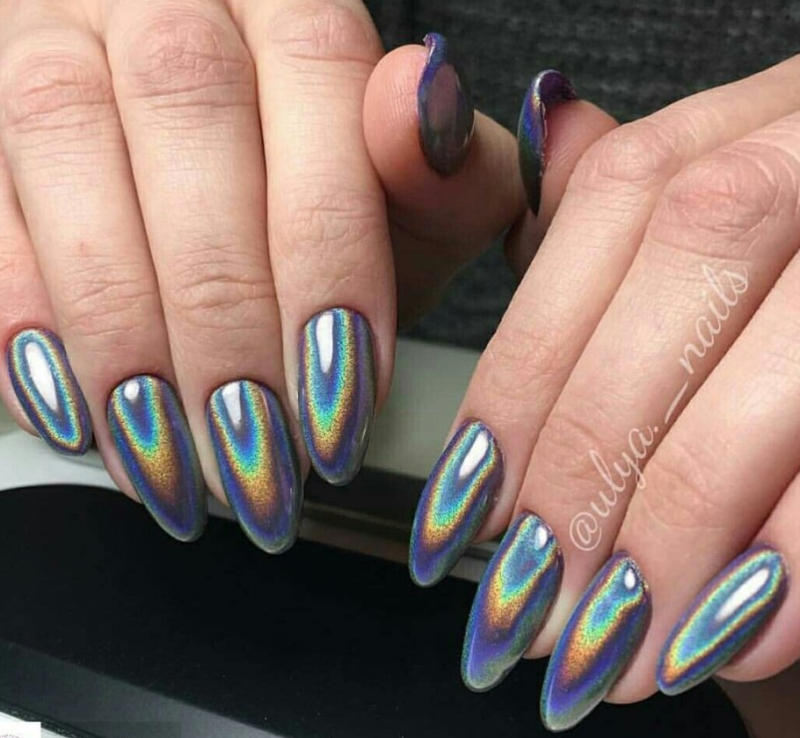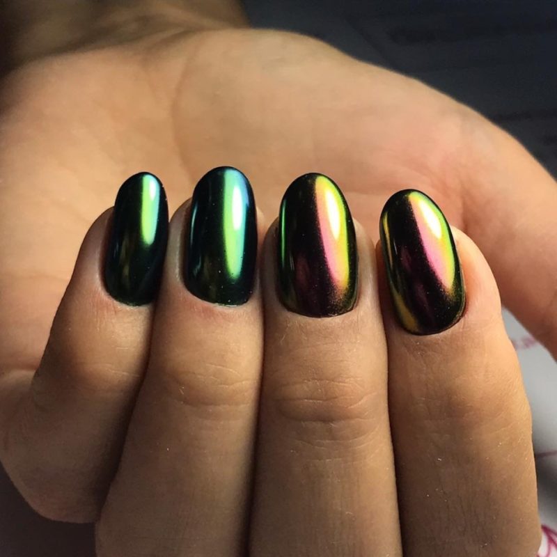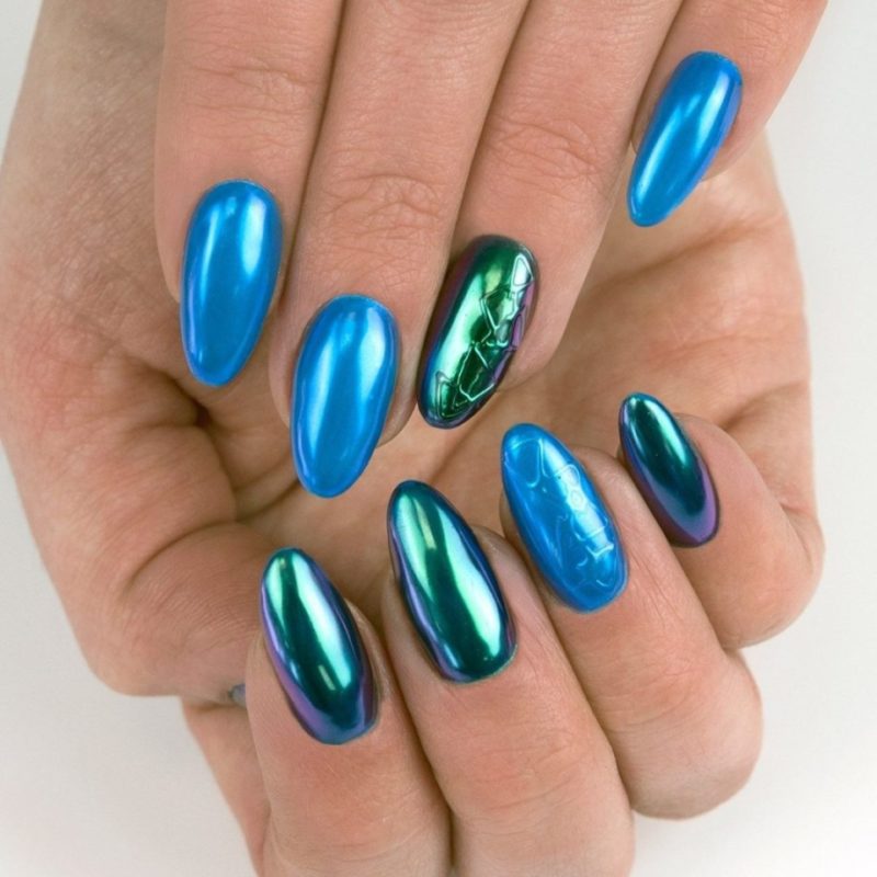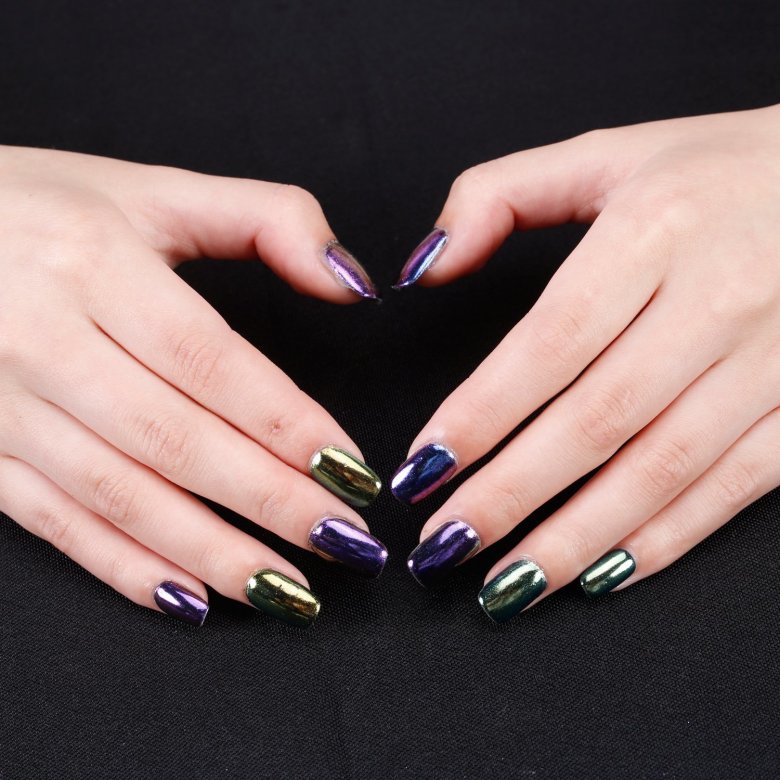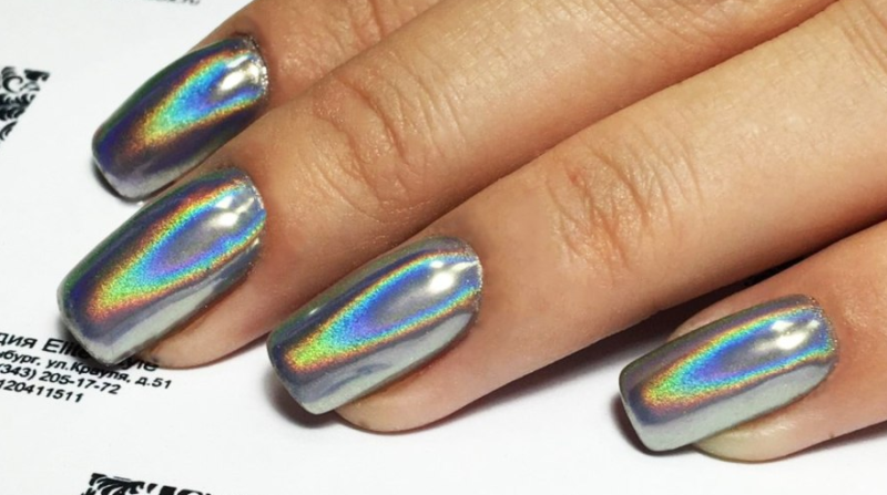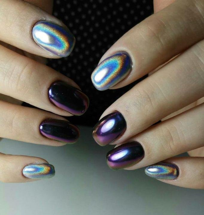 С помощью зеркального блеска мастер может скорректировать длину ногтя. Конечно, визуально. Если хотите большую длину, придется нарастить пластину. Короткая длина несколько ограничивает использование пигментов. Например, зеркальная, жемчужная и хамелеон подойдут таким ноготкам. А вот для призмы длины может не хватить. Просто не получится добиться желаемого эффекта в маникюре.
