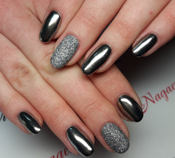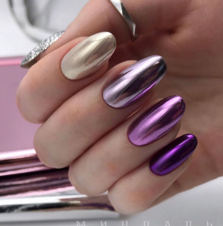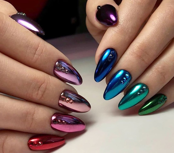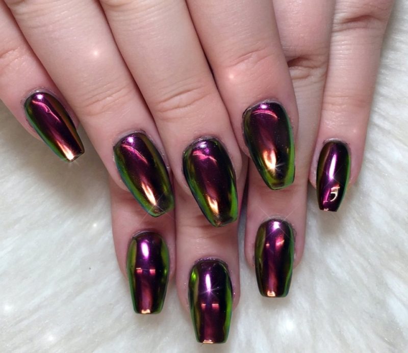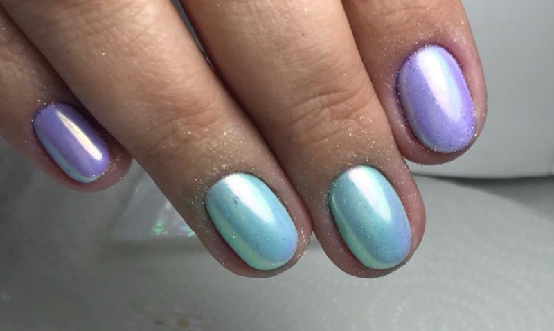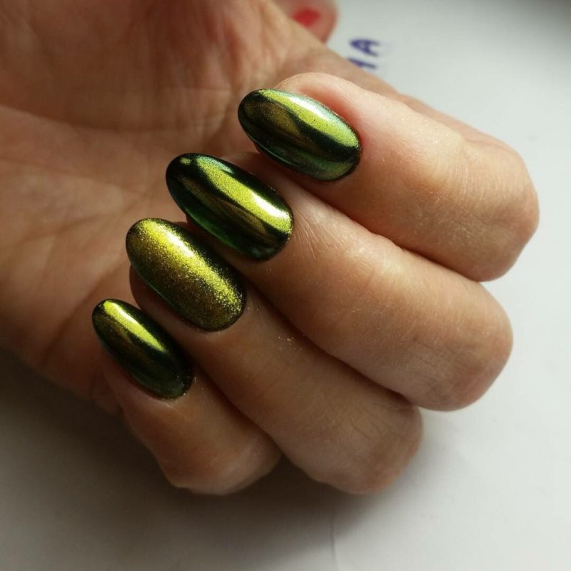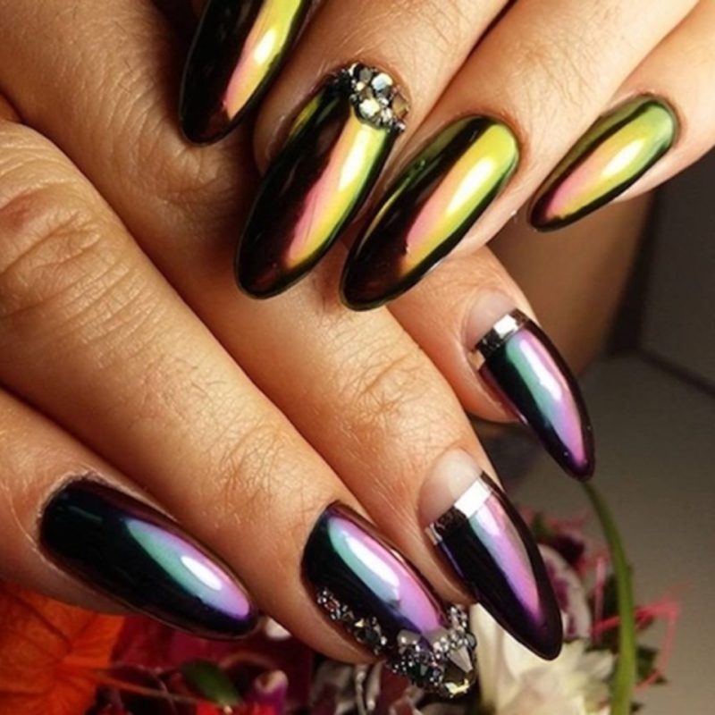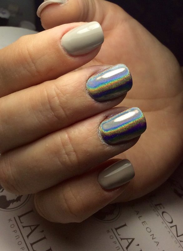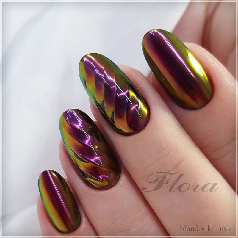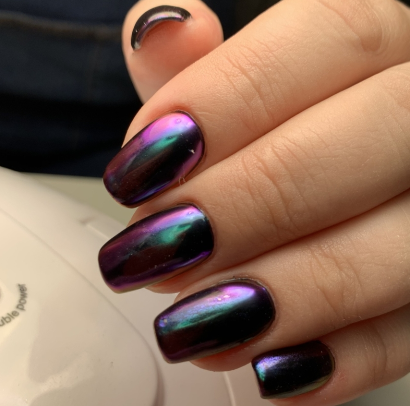 С помощью зеркального блеска мастер может скорректировать длину ногтя. Конечно, визуально. Если хотите большую длину, придется нарастить пластину. Короткая длина несколько ограничивает использование пигментов. Например, зеркальная, жемчужная и хамелеон подойдут таким ноготкам. А вот для призмы длины может не хватить. Просто не получится добиться желаемого эффекта в маникюре.