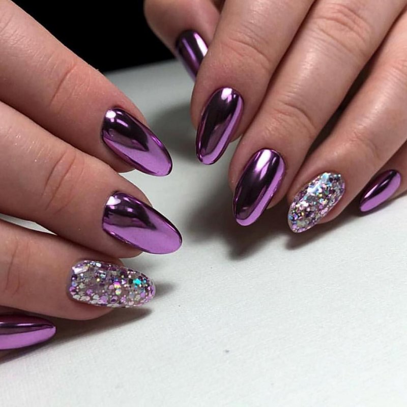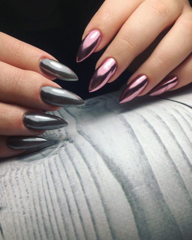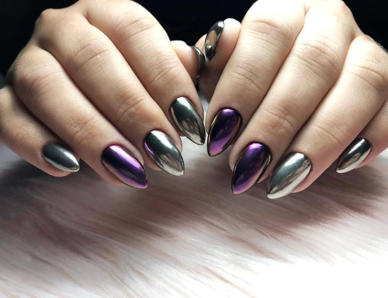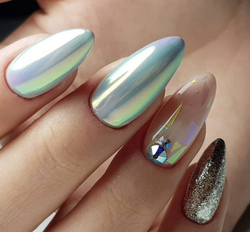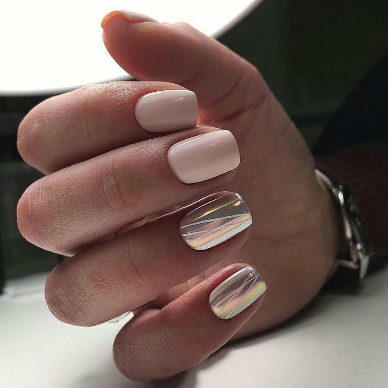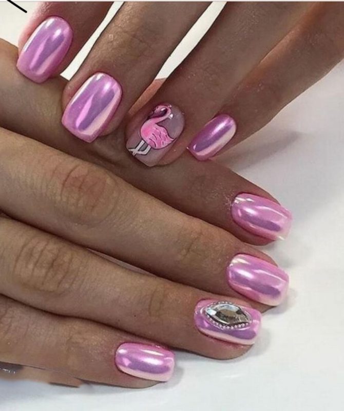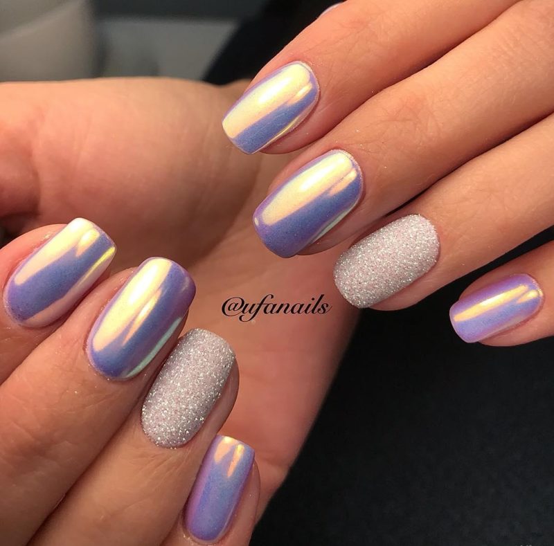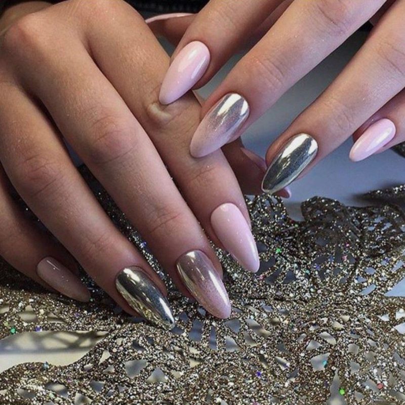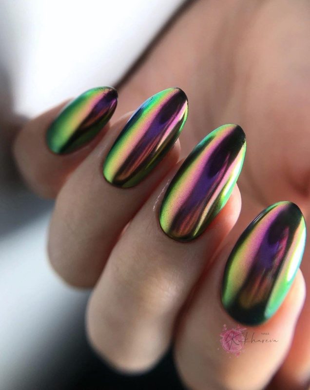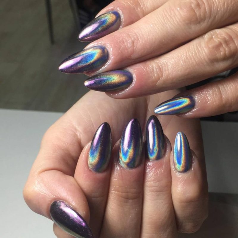 С помощью зеркального блеска мастер может скорректировать длину ногтя. Конечно, визуально. Если хотите большую длину, придется нарастить пластину. Короткая длина несколько ограничивает использование пигментов. Например, зеркальная, жемчужная и хамелеон подойдут таким ноготкам. А вот для призмы длины может не хватить. Просто не получится добиться желаемого эффекта в маникюре.